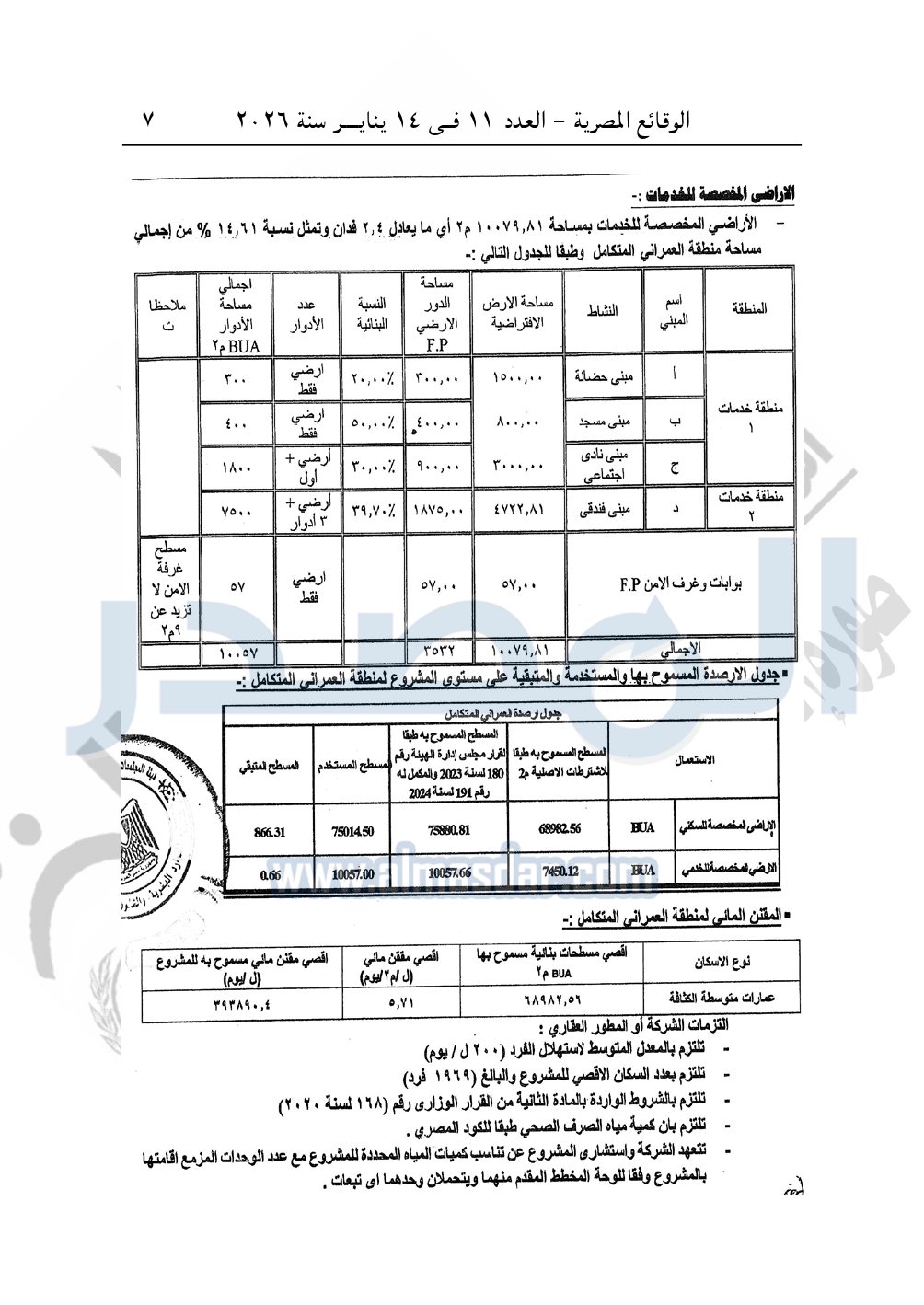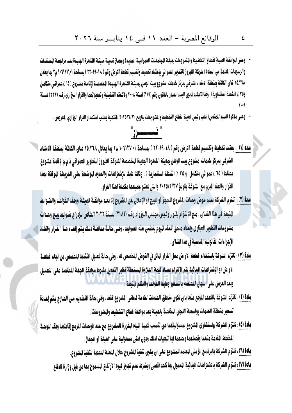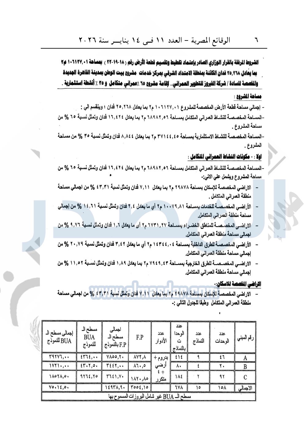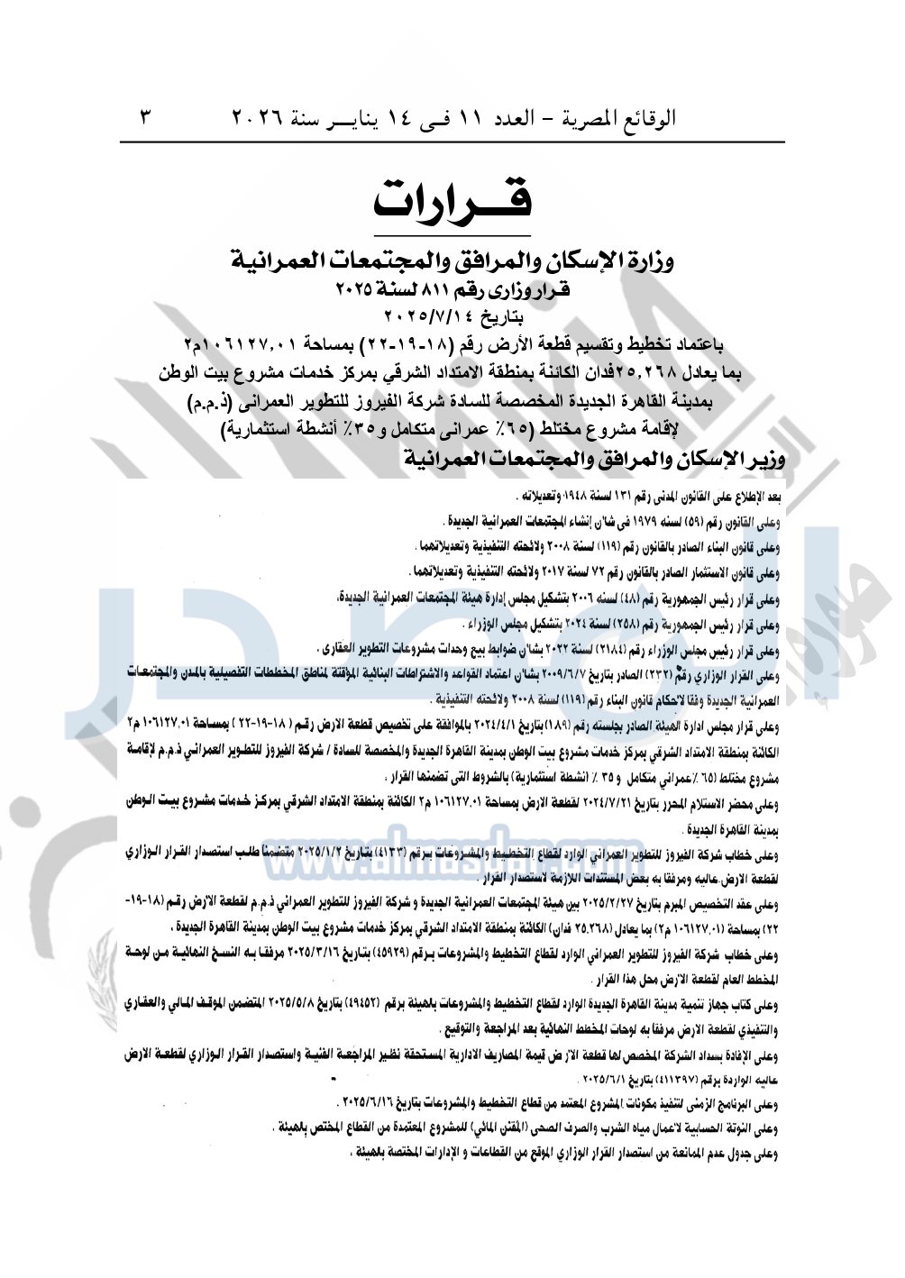 نشرت الوقائع المصرية، في العدد 11، الصادر في 14 يناير سنة 2026، قرار وزارة الإسكان والمرافق والمجتمعات العمرانية، قرار وزاري رقم 811 لسنة 2025، بتاريخ 14-7-2025، بشأن اعتماد تخطيط وتقسيم قطعة الأرض رقم "18-19-22" بمساحة 106127.01م2 بما يعادل 25.268 فدان الكائنة بمنطقة الامتداد الشرقي بمركز خدمات مشروع بيت الوطن بمدينة القاهرة الجديدة المخصصة لشركة الفيروز للتطوير العمراني "ذ.م.م" لإقامة مشروع مختلط "65% عمرانی متکامل و35% أنشطة استثمارية".