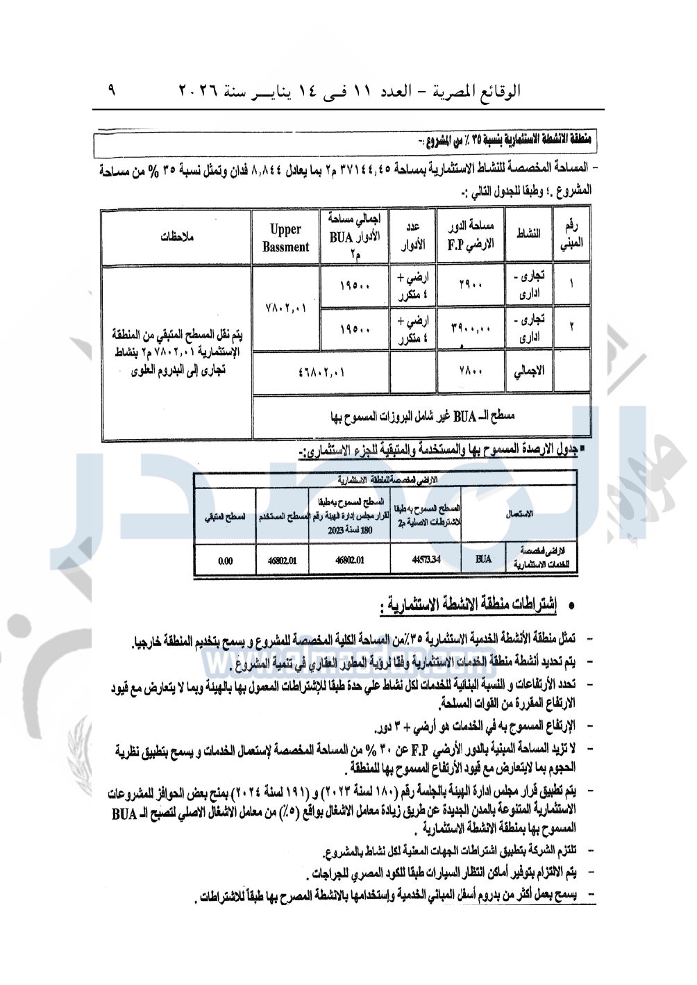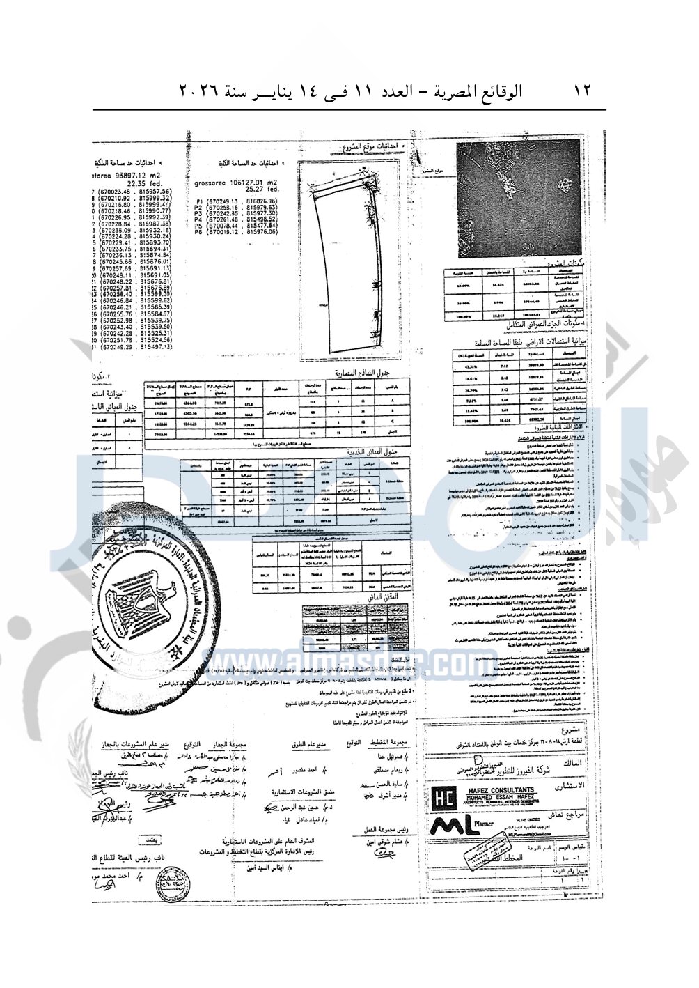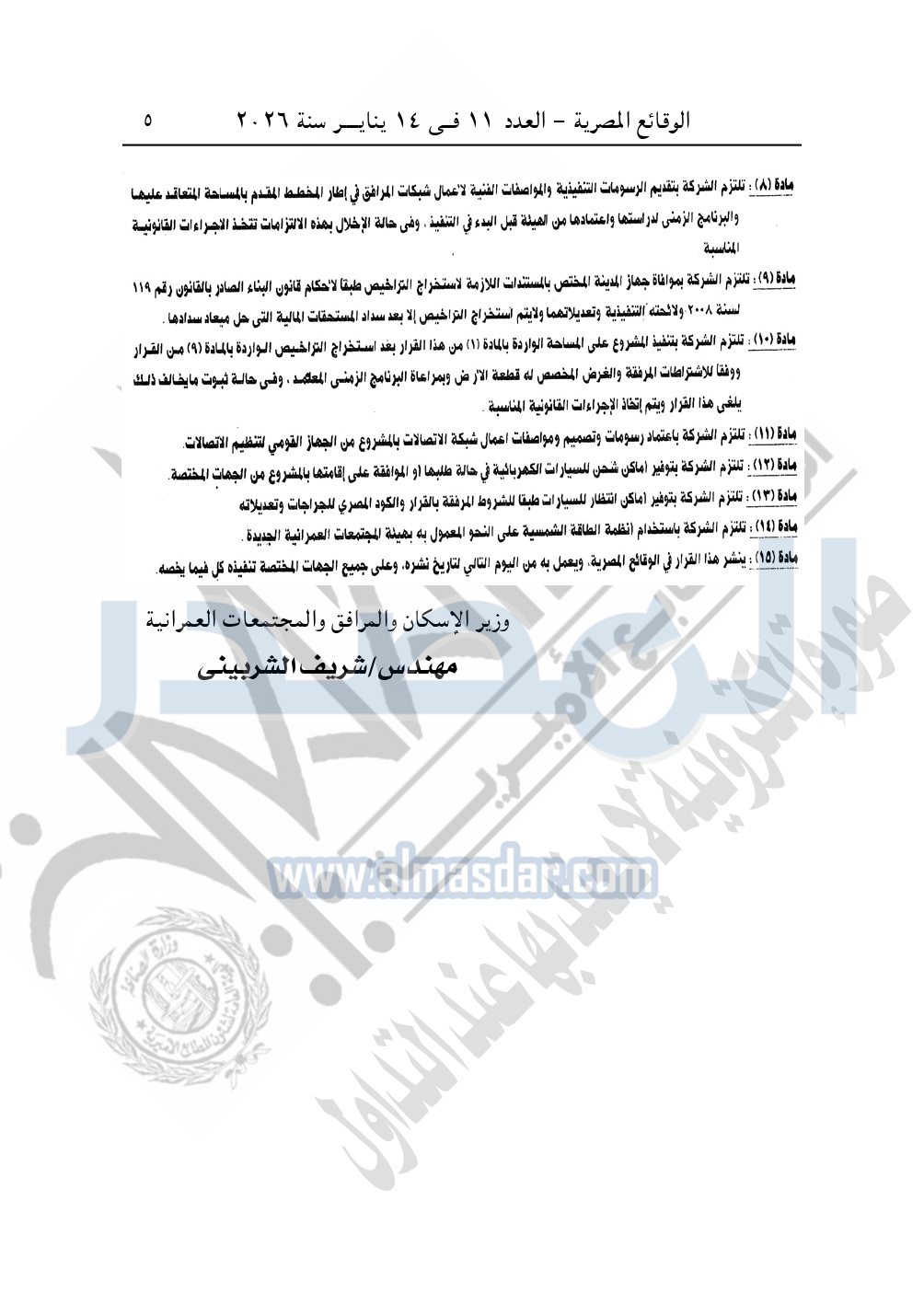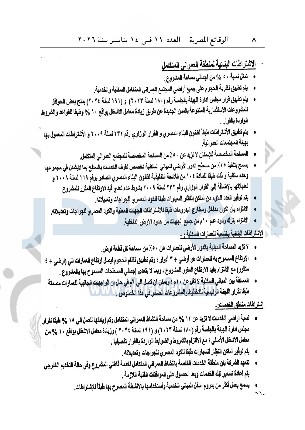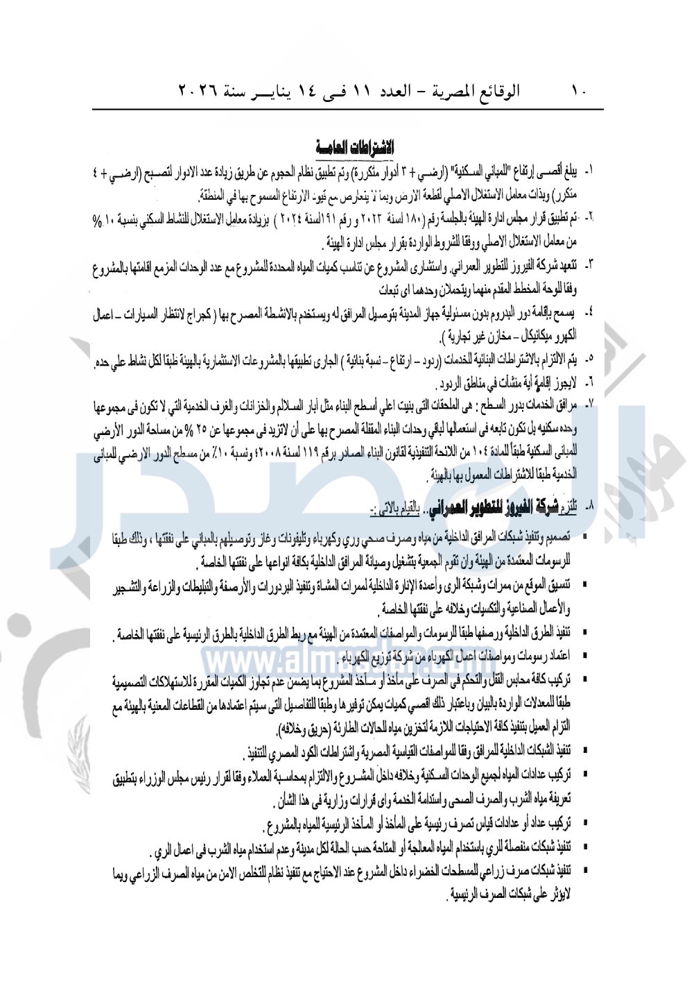 نشرت الوقائع المصرية، في العدد 11، الصادر في 14 يناير سنة 2026، قرار وزارة الإسكان والمرافق والمجتمعات العمرانية، قرار وزاري رقم 811 لسنة 2025، بتاريخ 14-7-2025، بشأن اعتماد تخطيط وتقسيم قطعة الأرض رقم "18-19-22" بمساحة 106127.01م2 بما يعادل 25.268 فدان الكائنة بمنطقة الامتداد الشرقي بمركز خدمات مشروع بيت الوطن بمدينة القاهرة الجديدة المخصصة لشركة الفيروز للتطوير العمراني "ذ.م.م" لإقامة مشروع مختلط "65% عمرانی متکامل و35% أنشطة استثمارية".