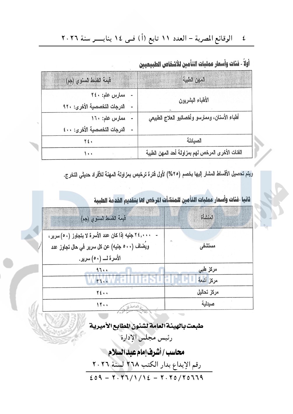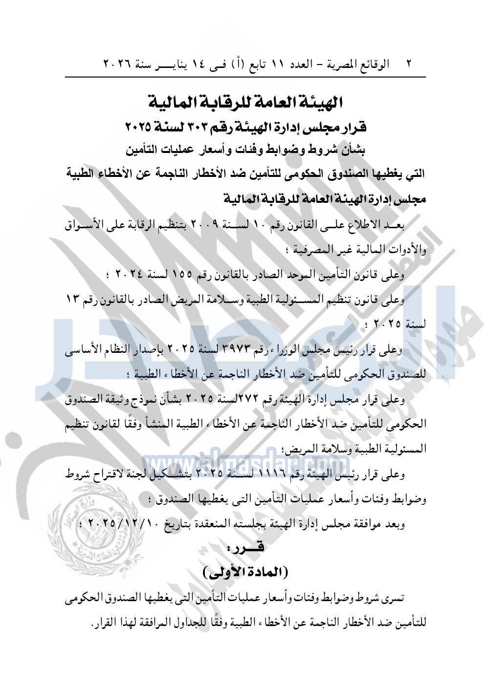 نشرت الوقائع المصرية في العدد 11 تابع "أ" الصادر في 14 يناير سنة 2026 ، الهيئة العامة للرقابة المالية قرار مجلس إدارة الهيئة رقم 303 لسنة 2025، بشأن شروط وضوابط وأسعار عمليات التأمين التي يغطيها الصندوق الحكومى للتأمين ضد الأخطار الناجمة عن الأخطاء الطبية.