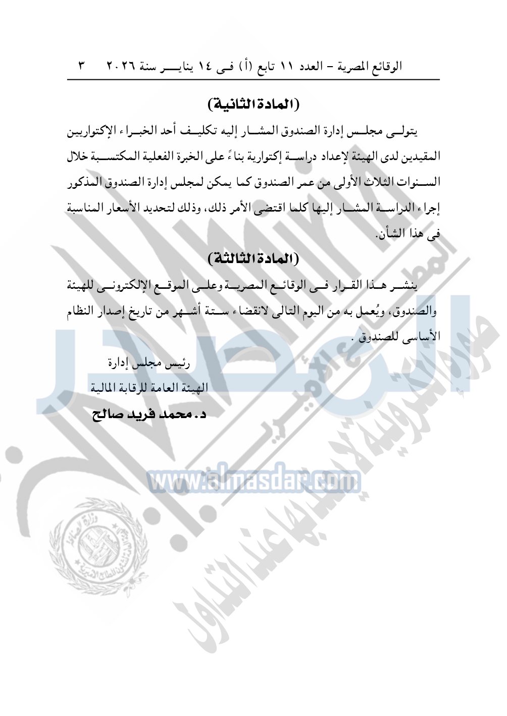 ينشر هذا القرار في الوقائع المصرية وعلى الموقع الإلكتروني للهيئة والصندوق، ويُعمل به من اليوم التالي لانقضاء ستة أشهر من تاريخ إصدار النظام الأساسي للصندوق.