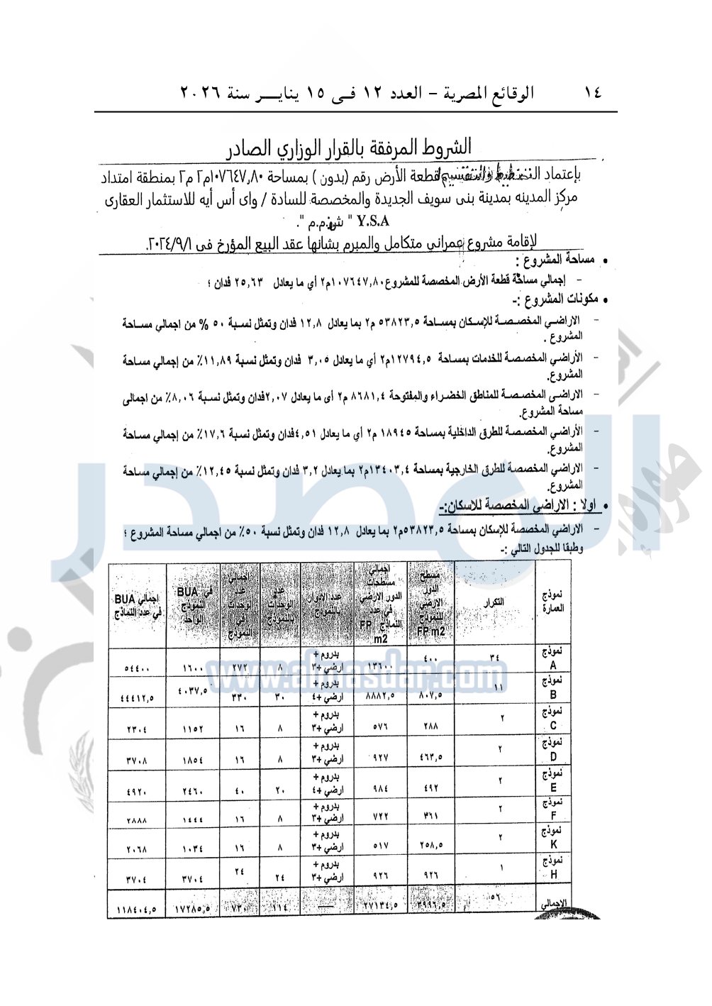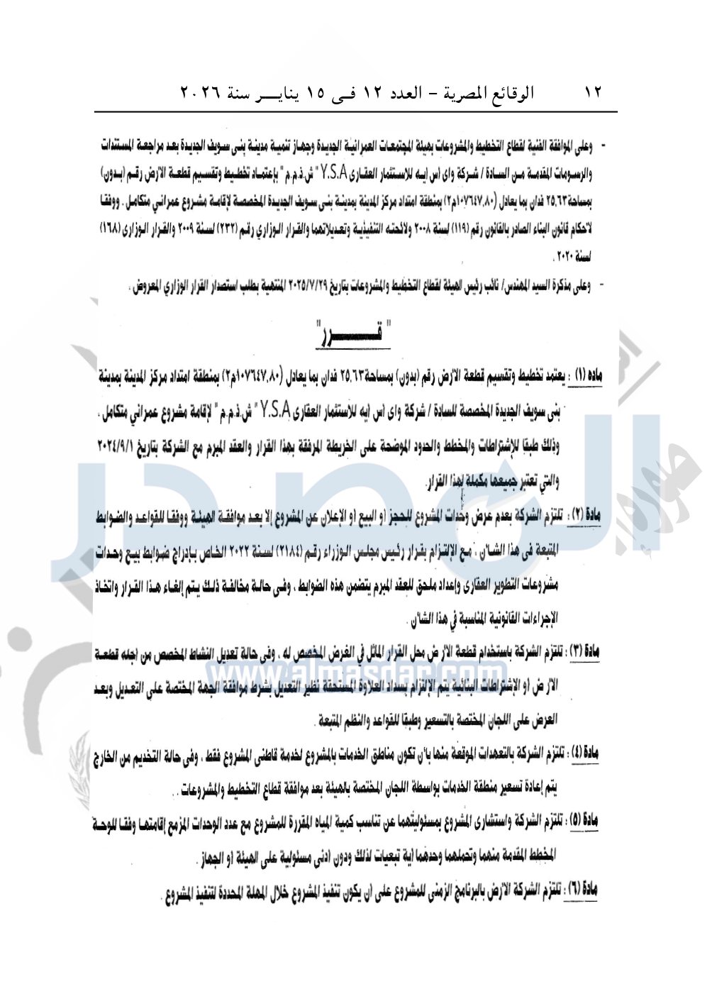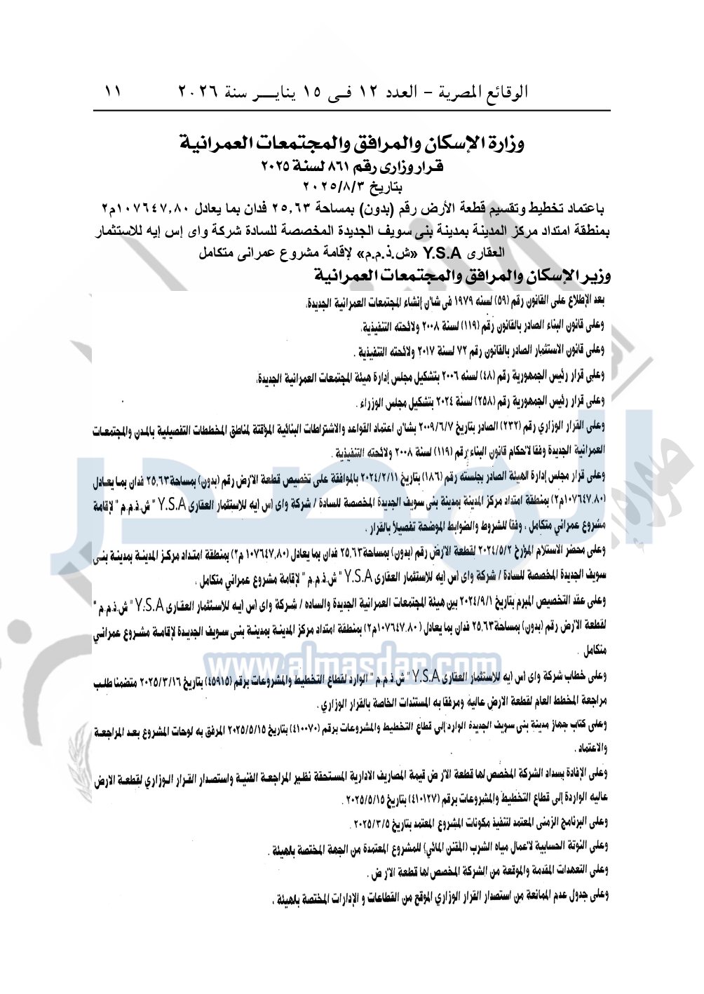 نشرت الوقائع المصرية في العدد 12، الصادر في 15 يناير 2026، قرار وزارة الإسكان والمرافق والمجتمعات العمرانية، رقم 861 لسنة 2025، بتاريخ 38-2025، بشأن اعتماد تخطيط وتقسيم قطعة الأرض رقم "بدون" بمساحة 25.63 فدان بما يعادل 107647.80م2 بمنطقة امتداد مركز المدينة بمدينة بنى سويف الجديدة المخصصة لشركة واى إس إيه للاستثمار العقارى Y.S.A «ش.ذ.م.م» لإقامة مشروع عمراني متكامل.
