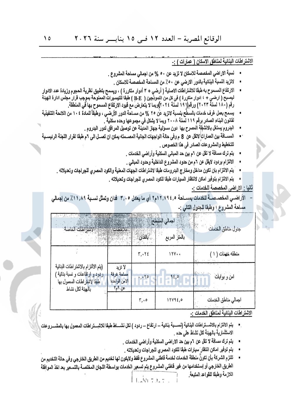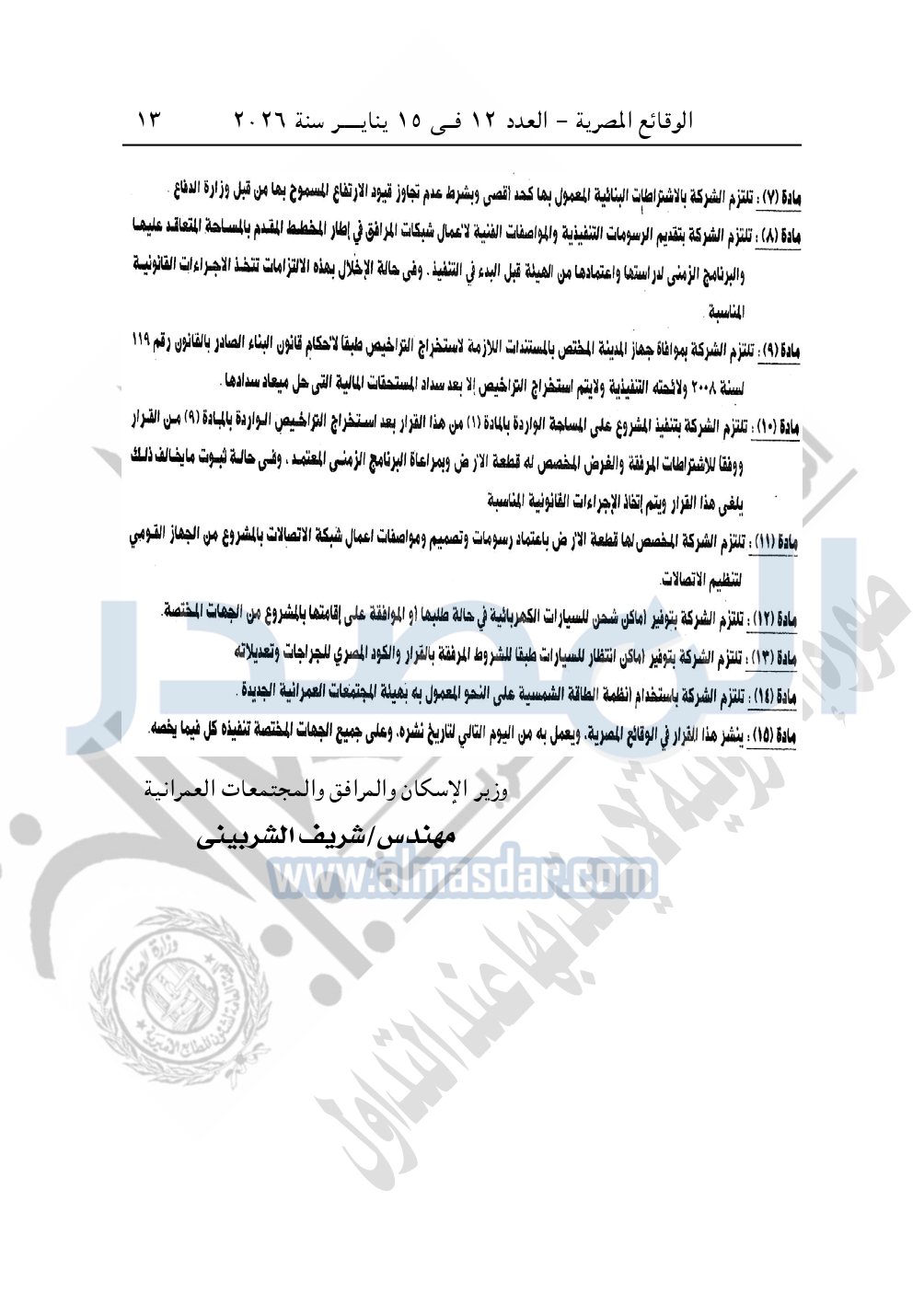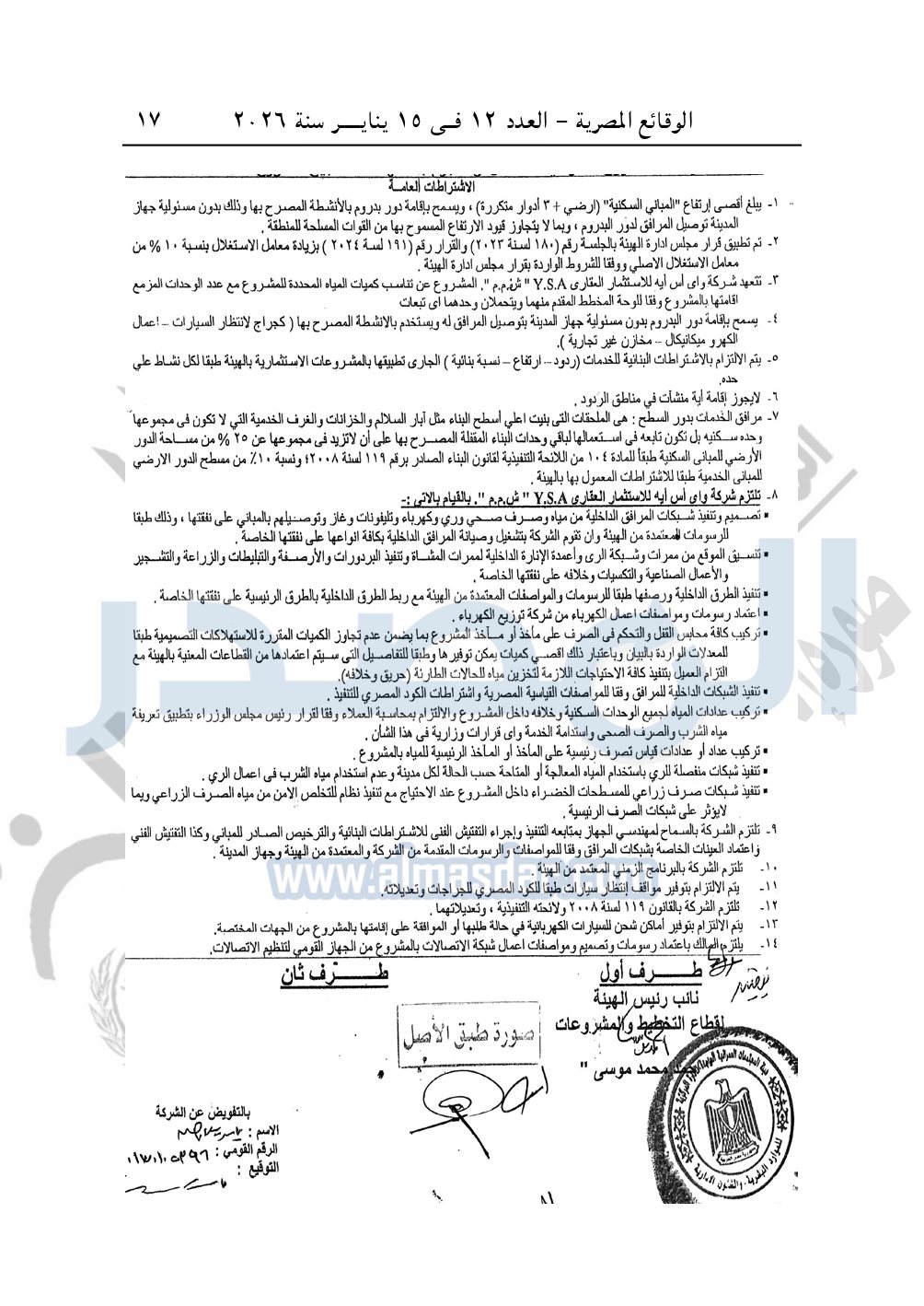 نشرت الوقائع المصرية في العدد 12، الصادر في 15 يناير 2026، قرار وزارة الإسكان والمرافق والمجتمعات العمرانية، رقم 861 لسنة 2025، بتاريخ 38-2025، بشأن اعتماد تخطيط وتقسيم قطعة الأرض رقم "بدون" بمساحة 25.63 فدان بما يعادل 107647.80م2 بمنطقة امتداد مركز المدينة بمدينة بنى سويف الجديدة المخصصة لشركة واى إس إيه للاستثمار العقارى Y.S.A «ش.ذ.م.م» لإقامة مشروع عمراني متكامل.