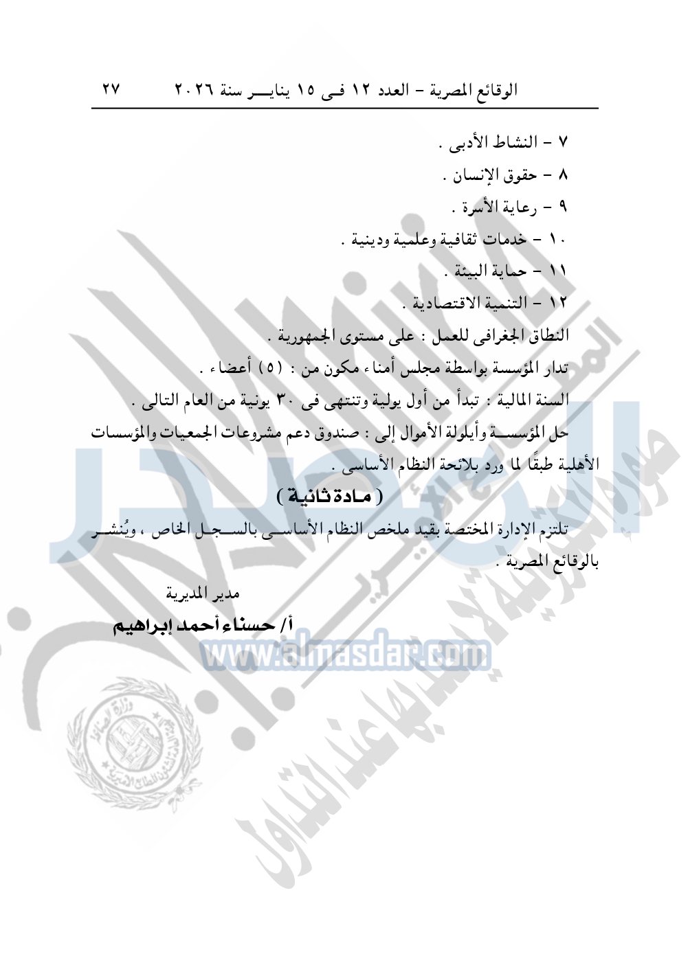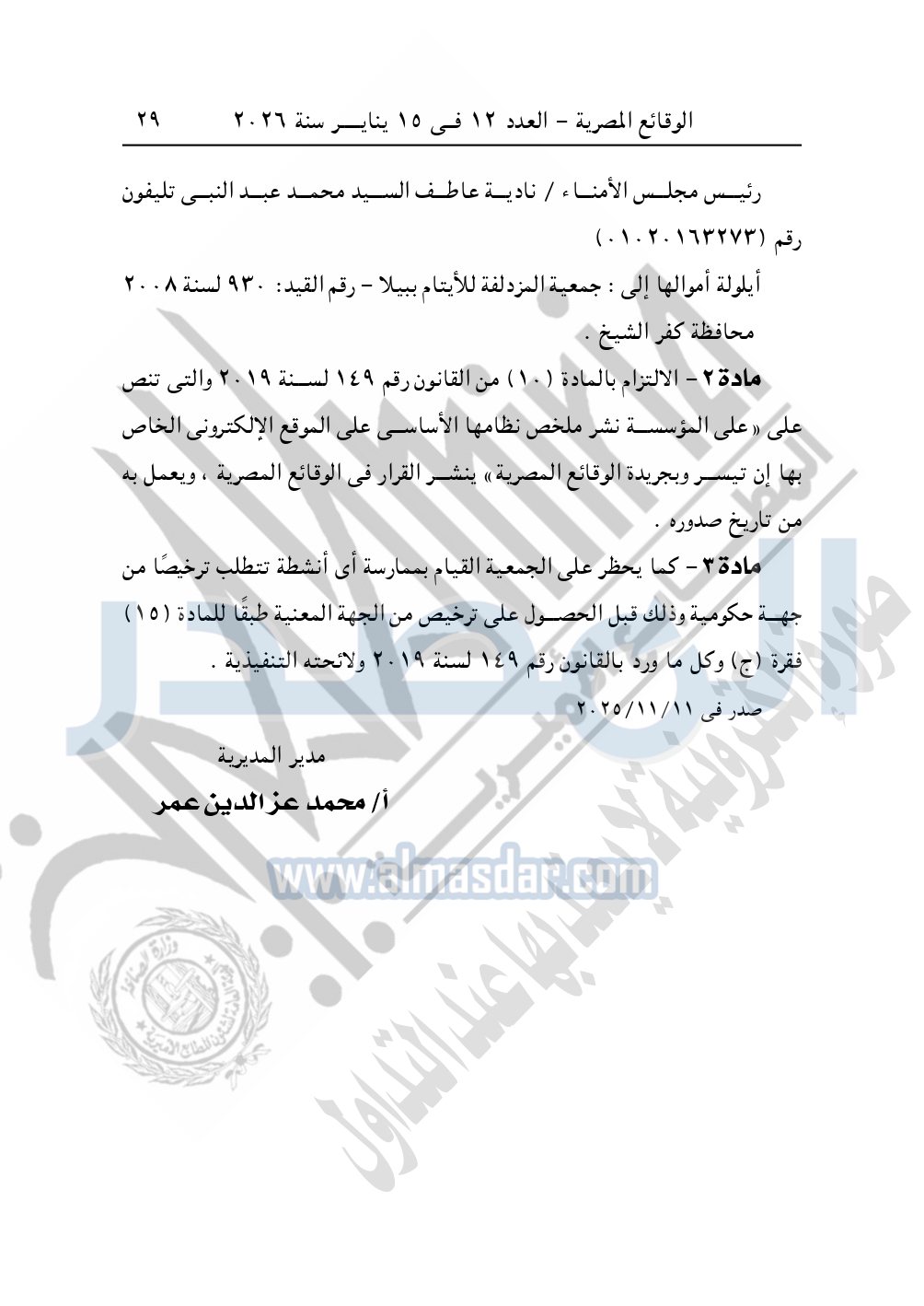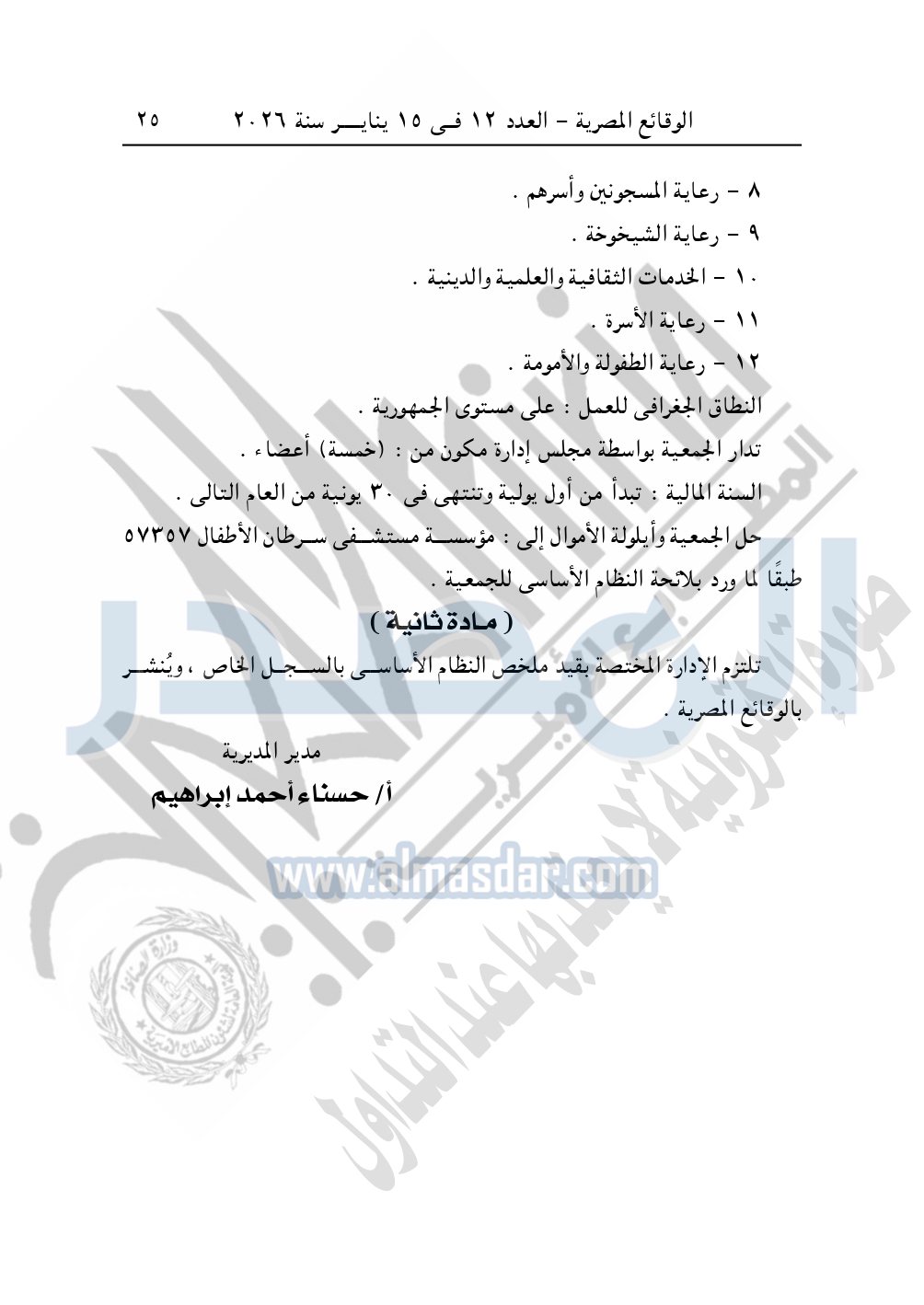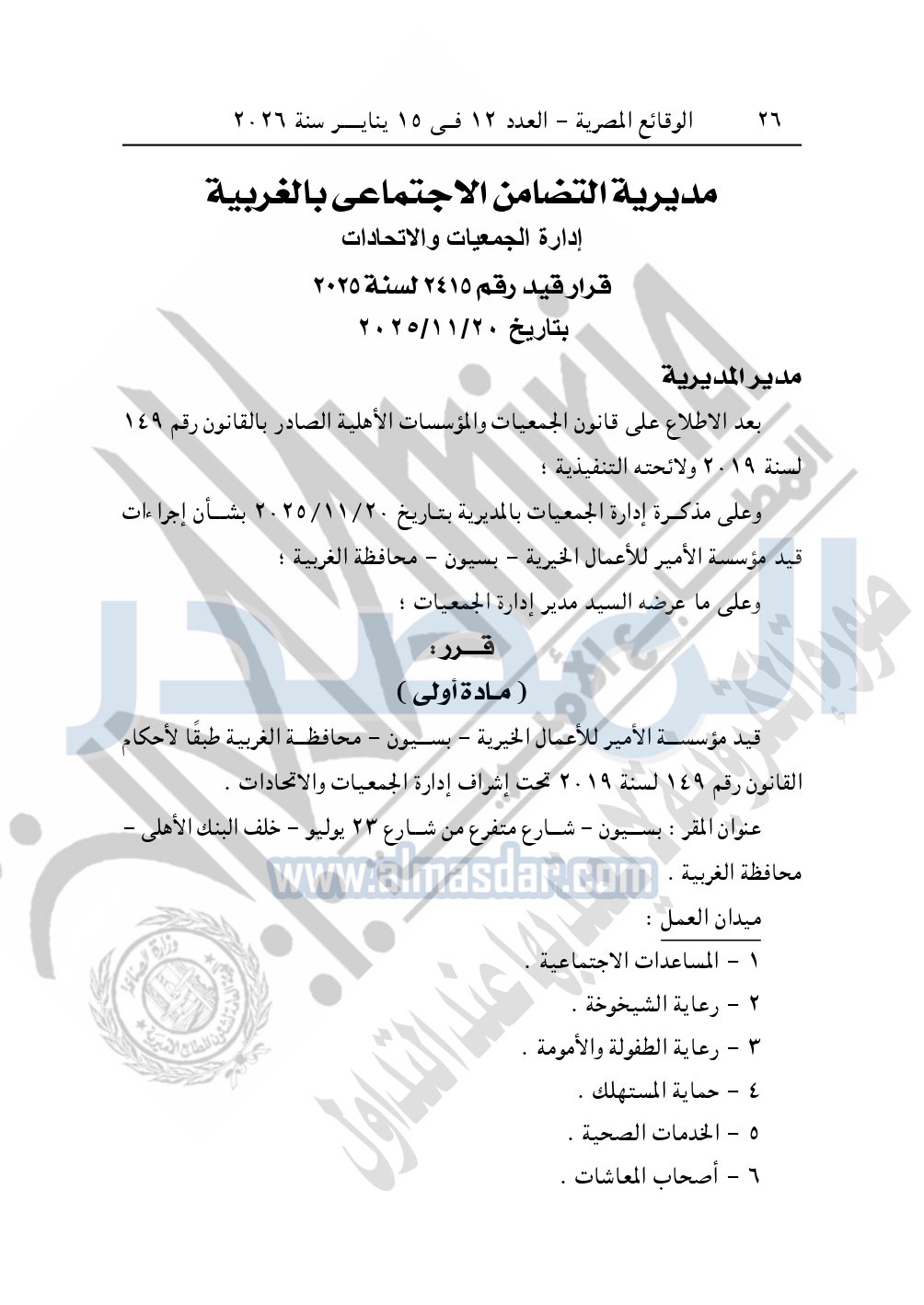 كما نشرت الوقائع المصرية في العدد 12، الصادر في 15 يناير 2026، قرار مديرية التضامن الاجتماعي بالغربية، قيد رقم 2415 لسنة 2025، بتاريخ 20-11-2025، بشأن قيد مؤسسة الأمير للأعمال الخيرية – بسيون – محافظة الغربية.