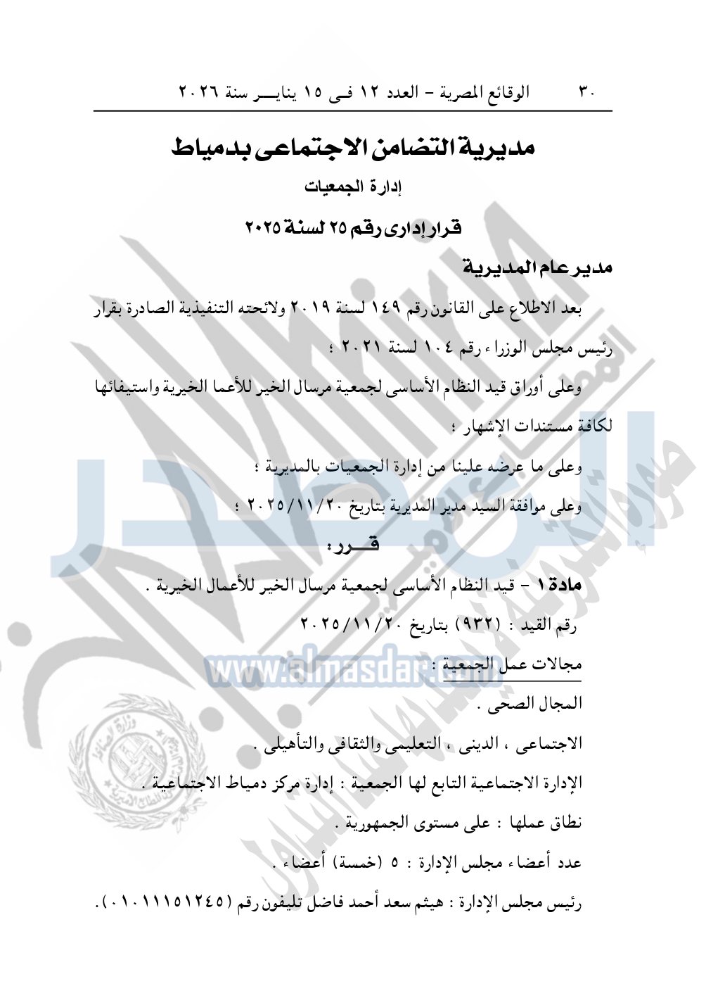 ونشرت الوقائع المصرية في العدد 12، الصادر في 15 يناير 2026، قرار مديرية التضامن الاجتماعي بدمياط، قيد رقم 932، بتاريخ 20-11-2025، بشأن قيد جمعية مرسال الخير للأعمال الخيرية.