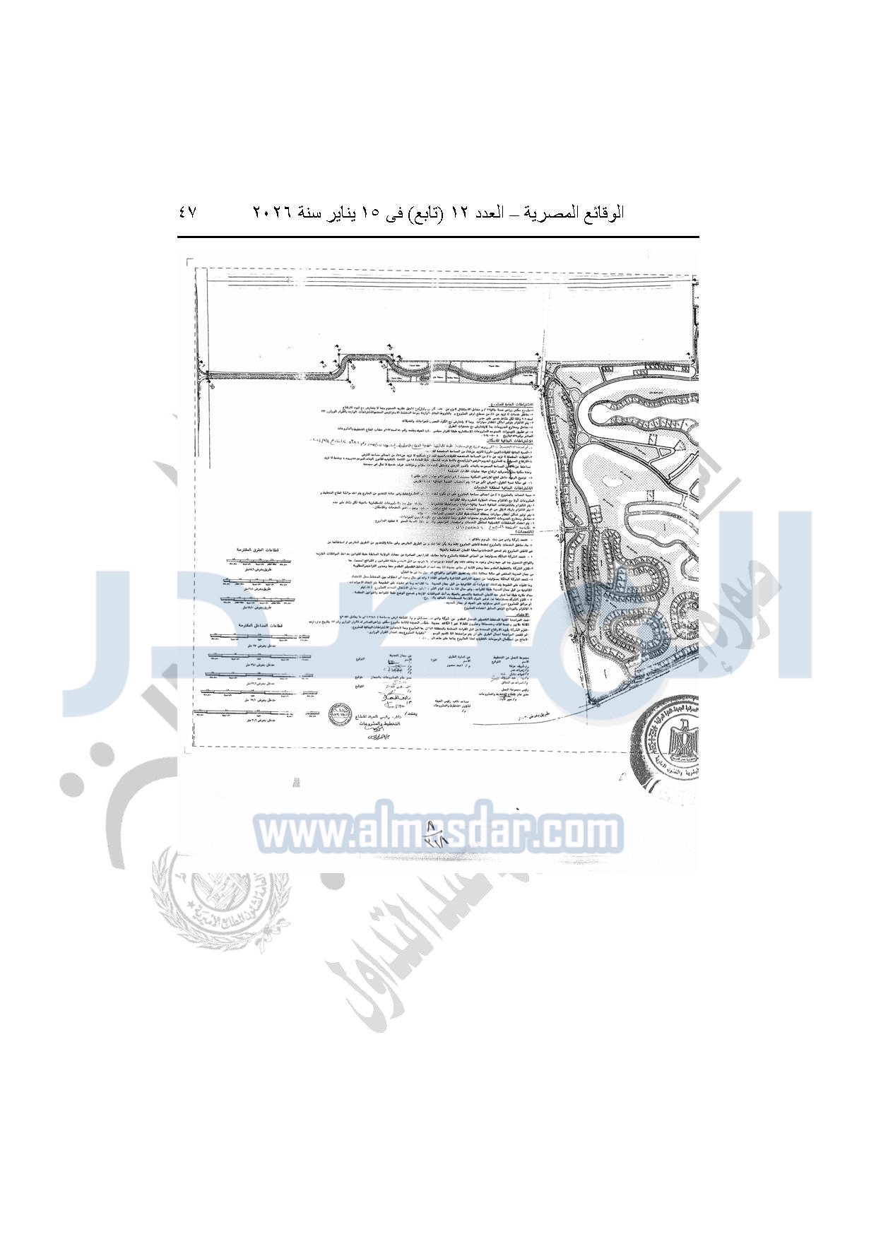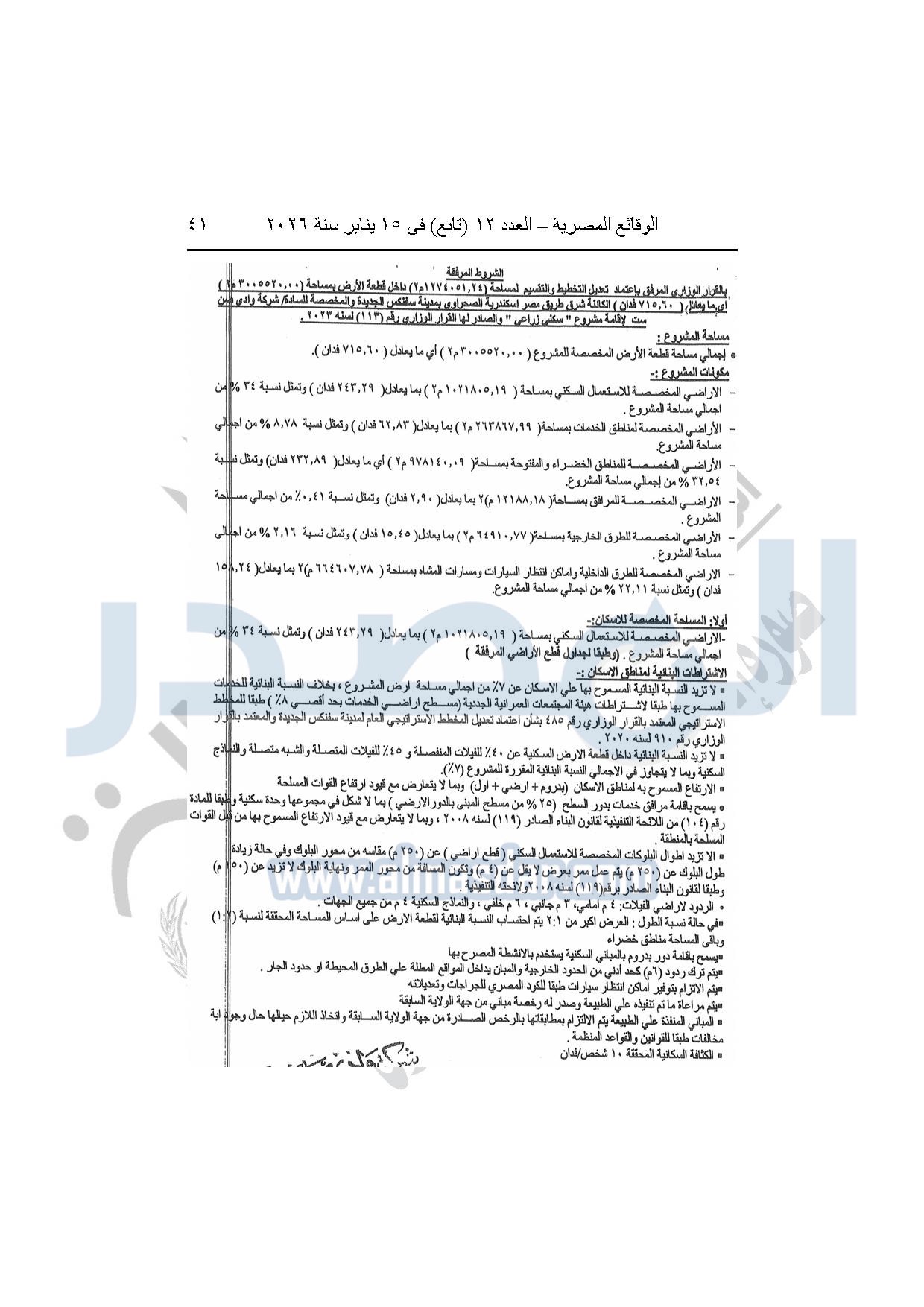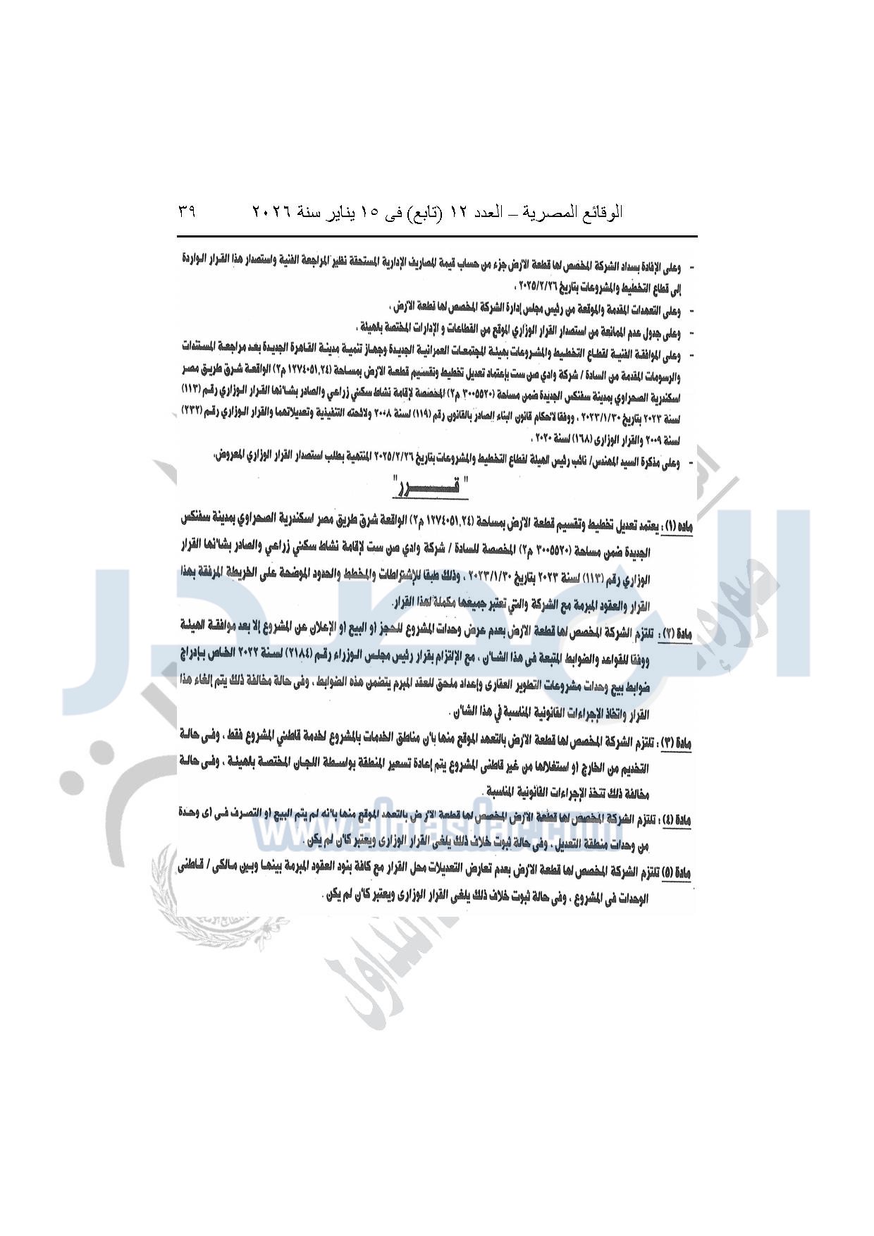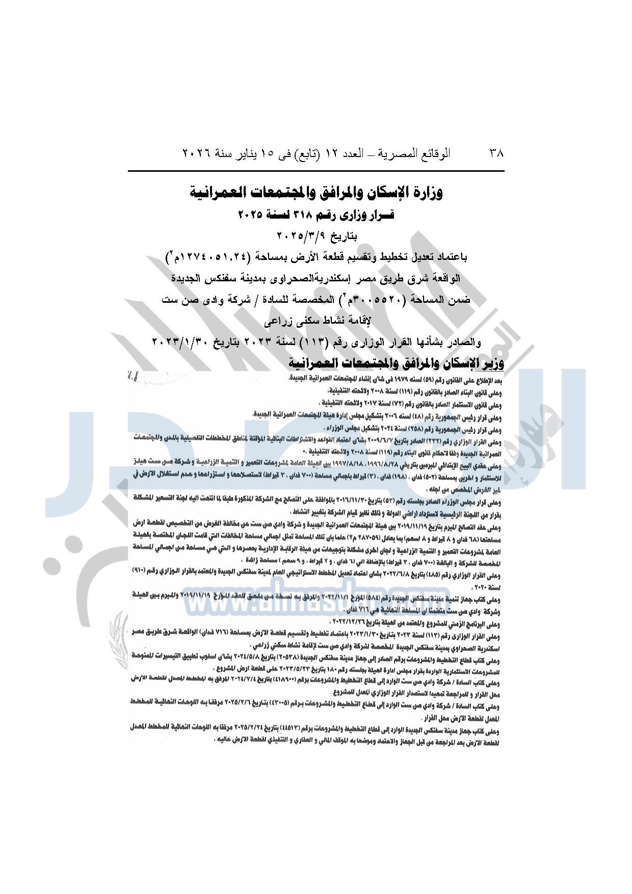 نشرت الوقائع المصرية، في العدد 12 "تابع"، الصادر بتاريخ 15 يناير 2026، قرار وزارة الإسكان والمرافق والمجتمعات العمرانية، رقم 318 لسنة 2025، بتاريخ 9-3-2025، بشأن اعتماد تعديل تخطيط وتقسيم قطعة الأرض بمساحة "1274051.24م2" الواقعة شرق طريق مصر إسكندرية الصحراوى بمدينة سفنكس الجديدة ضمن المساحة "3005520م2" المخصصة لشركة وادي صن ست لإقامة نشاط سكنى زراعى، والصادر بشأنها القرار الوزارى رقم "113" لسنة 2023 بتاريخ 30-1-2023.