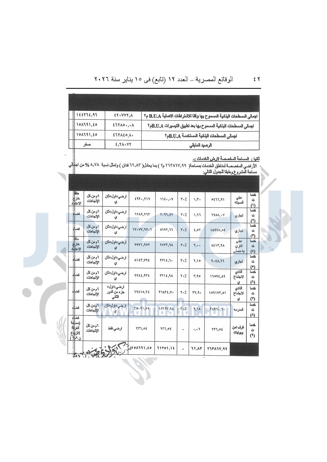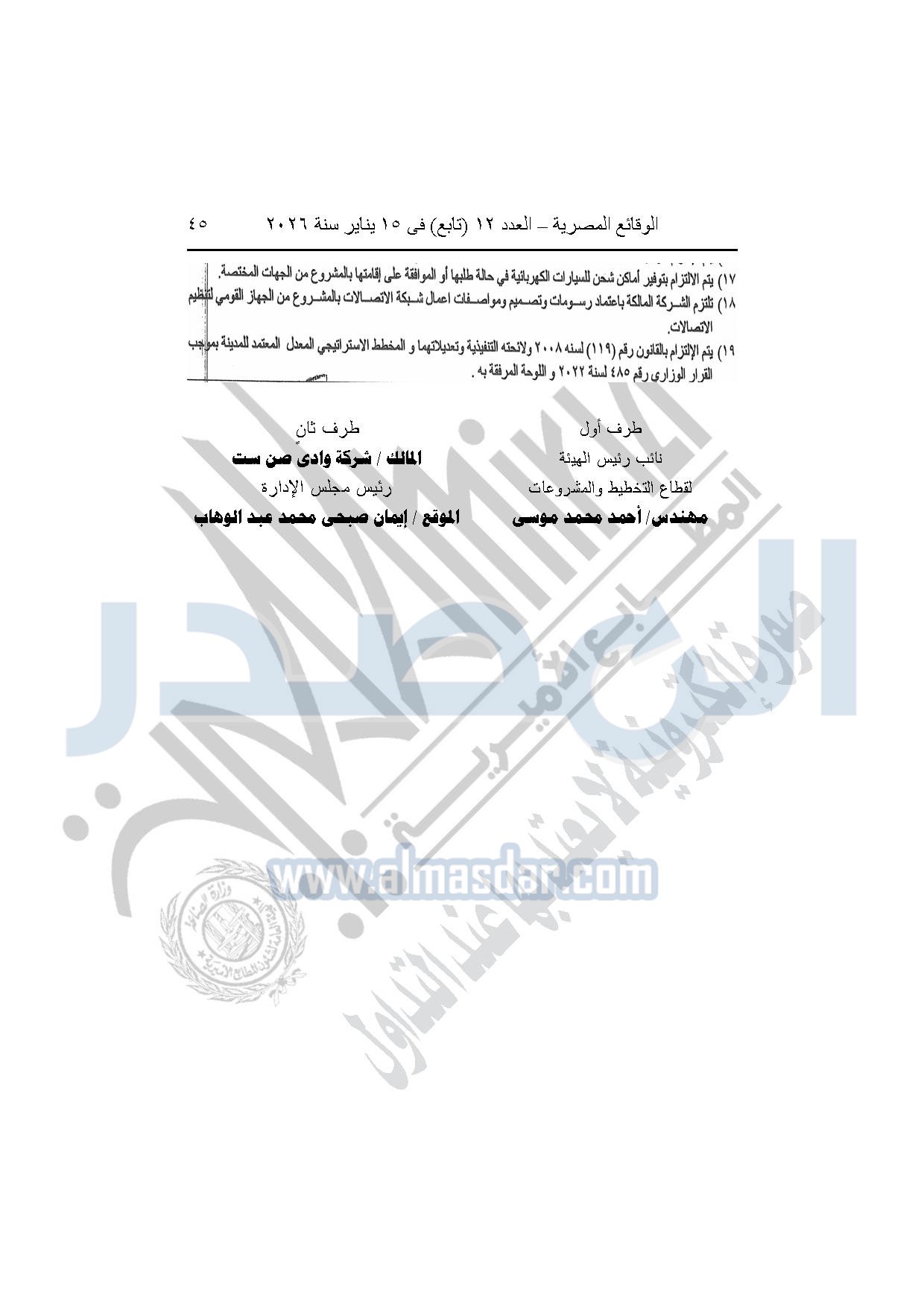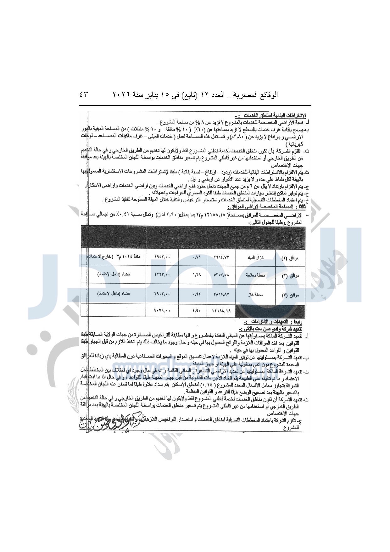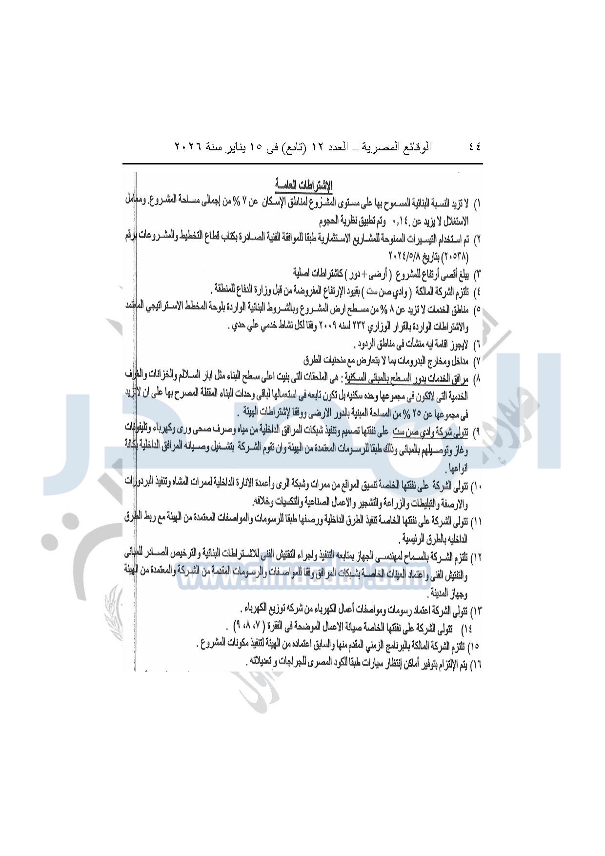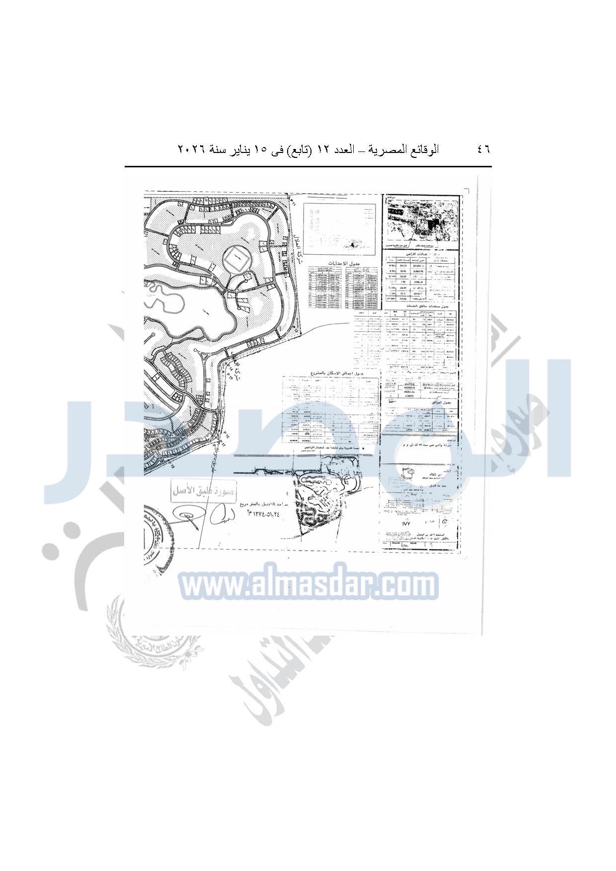 نشرت الوقائع المصرية، في العدد 12 "تابع"، الصادر بتاريخ 15 يناير 2026، قرار وزارة الإسكان والمرافق والمجتمعات العمرانية، رقم 318 لسنة 2025، بتاريخ 9-3-2025، بشأن اعتماد تعديل تخطيط وتقسيم قطعة الأرض بمساحة "1274051.24م2" الواقعة شرق طريق مصر إسكندرية الصحراوى بمدينة سفنكس الجديدة ضمن المساحة "3005520م2" المخصصة لشركة وادي صن ست لإقامة نشاط سكنى زراعى، والصادر بشأنها القرار الوزارى رقم "113" لسنة 2023 بتاريخ 30-1-2023.