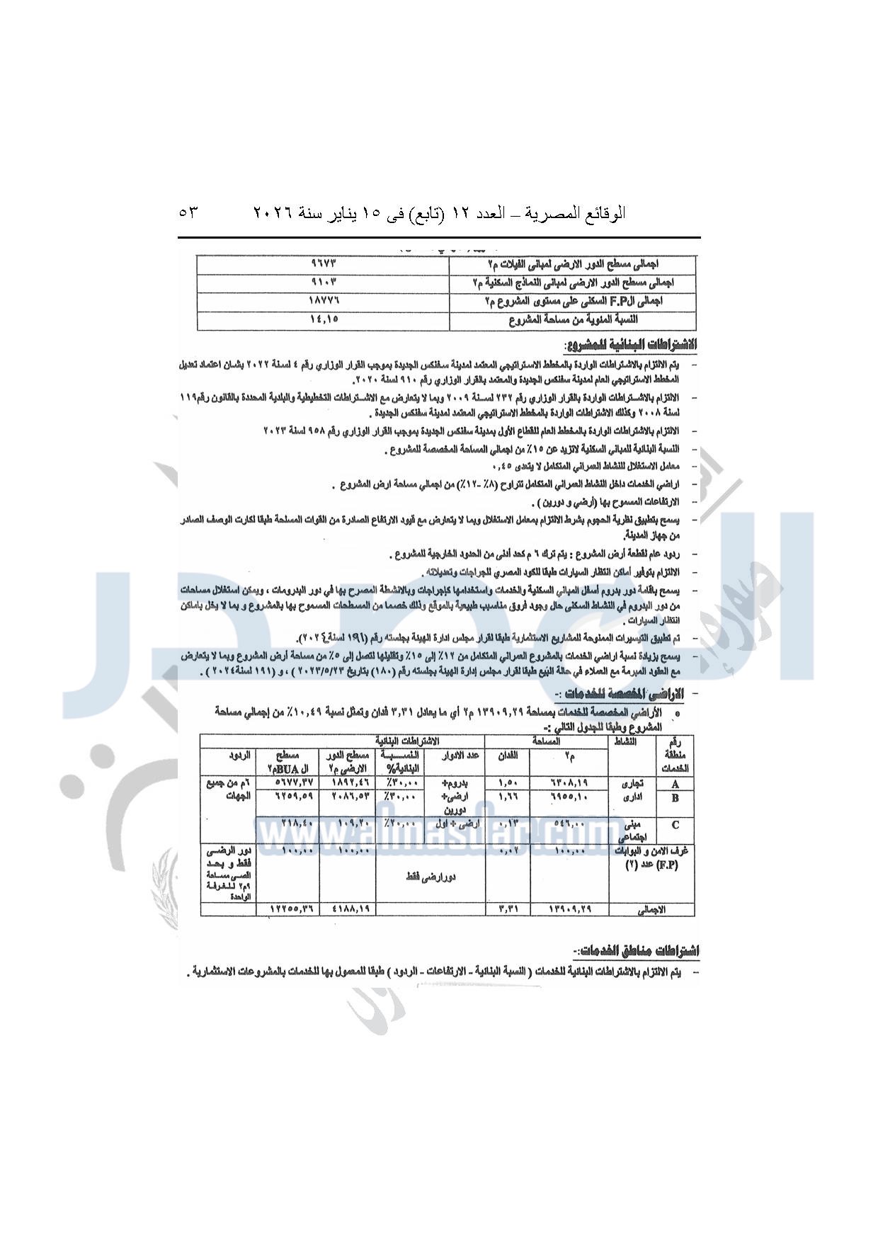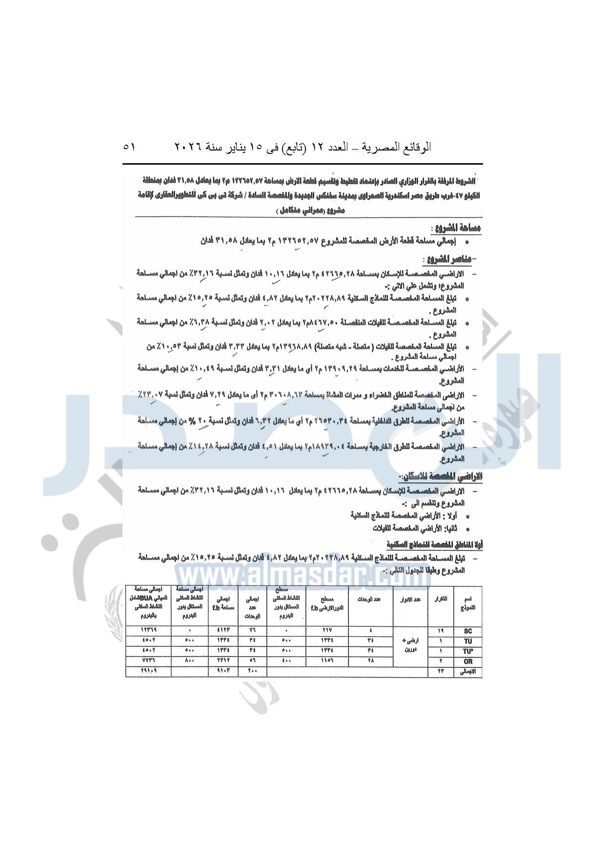 نشرت الوقائع المصرية، في العدد 12 "تابع"، الصادر بتاريخ 15 يناير 2026، قرار وزارة الإسكان والمرافق والمجتمعات العمرانية، رقم 344 لسنة 2025، بتاريخ 13-3-2025، بشأن اعتماد تخطيط وتقسيم قطعة الأرض بمساحة 132652.57م2 بما يعادل 31.58 فدان الواقعة بمنطقة الكيلو 47 - غرب طريق مصر إسكندرية الصحراوى مدينة سفنكس الجديدة المخصصة لشركة تي بي كي للتطوير العقارى "TBK Developments" لإقامة مشروع عمراني متكامل.