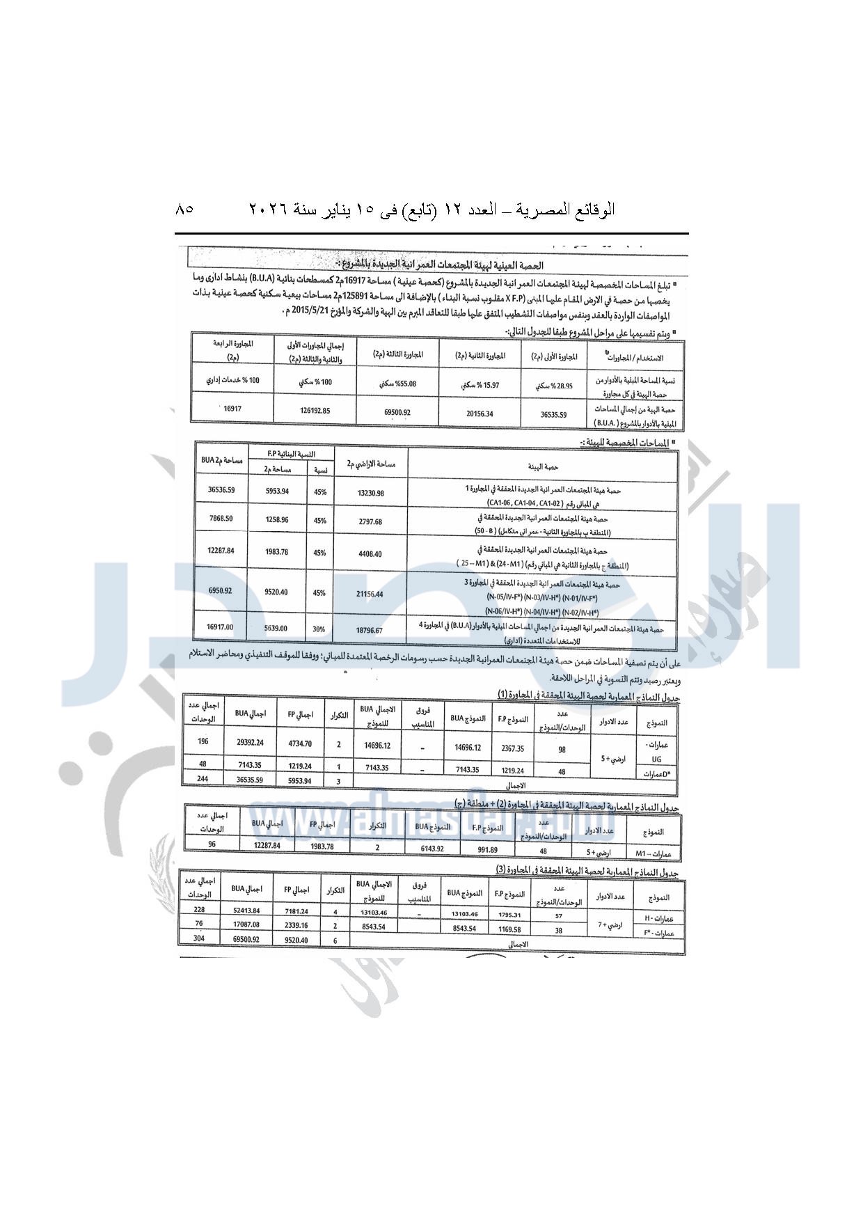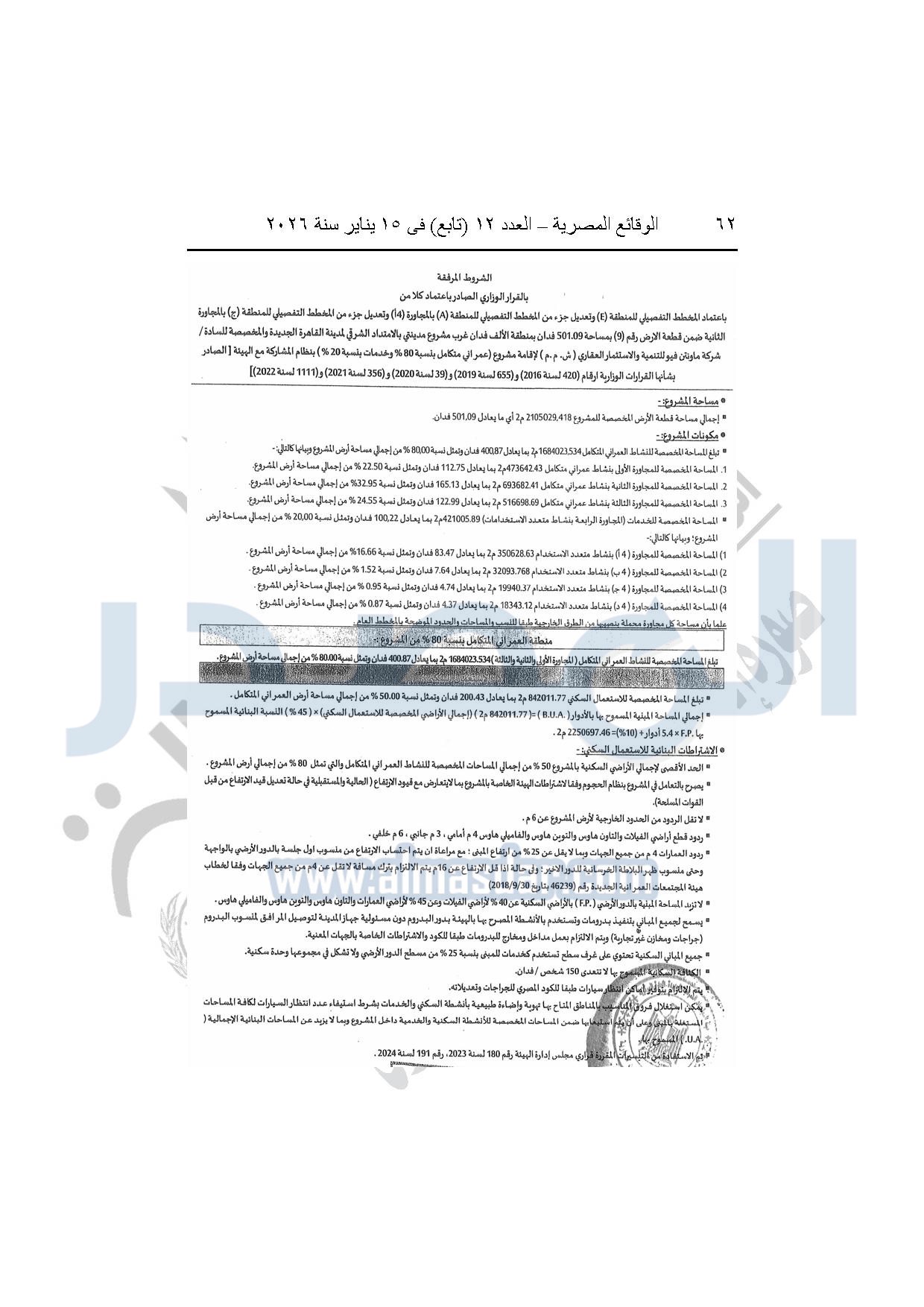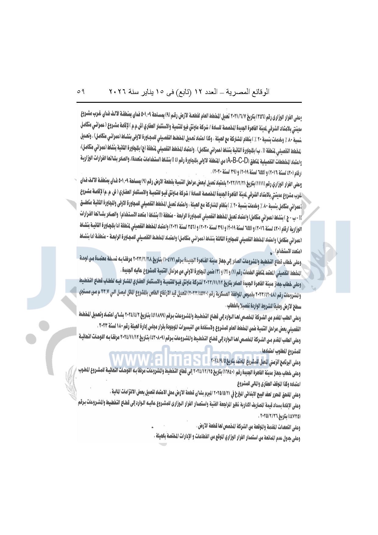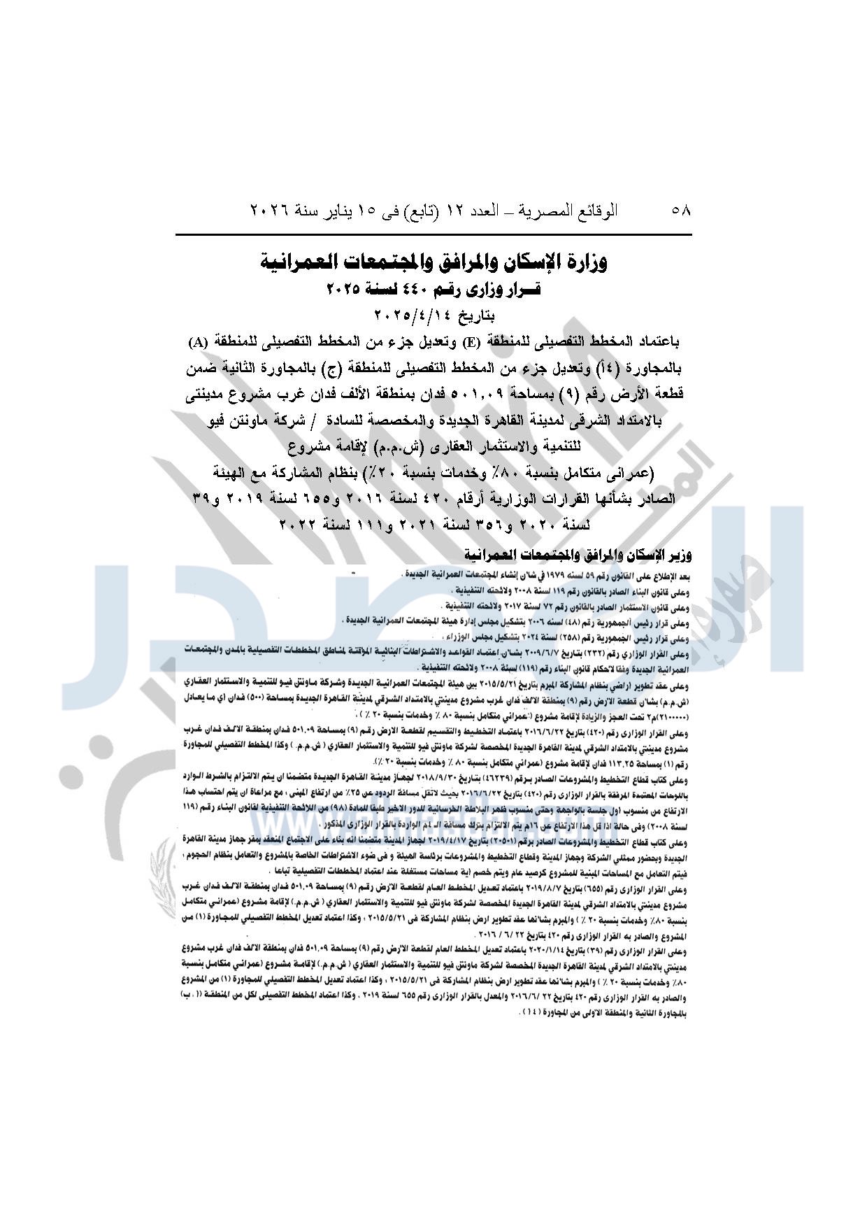 نشرت الوقائع المصرية، في العدد 12 "تابع"، الصادر بتاريخ 15 يناير 2026، قرار وزارة الإسكان والمرافق والمجتمعات العمرانية، رقم 440 لسنة 2025، بتاريخ 14-4-2025، بشأن اعتماد المخطط التفصيلي للمنطقة "E" وتعديل جزء من المخطط التفصيلي للمنطقة "A" بالمجاورة "4 أ" وتعديل جزء من المخطط التفصيلي للمنطقة "ج" بالمجاورة الثانية ضمن قطعة الأرض رقم "9" بمساحة 501.09 فدان بمنطقة الألف فدان غرب مشروع مدينتى بالامتداد الشرقي لمدينة القاهرة الجديدة والمخصصة لشركة ماونتن فيو للتنمية والاستثمار العقارى لإقامة مشروع "عمرانى متكامل بنسبة 80% وخدمات بنسبة 20%" بنظام المشاركة مع الهيئة.