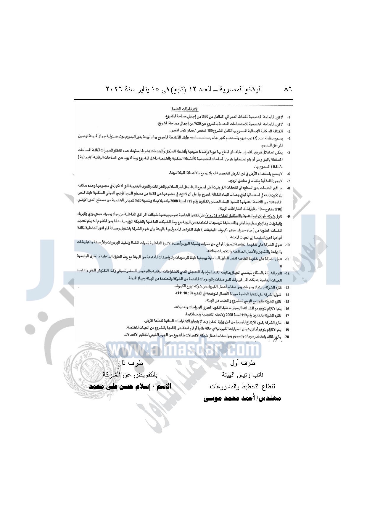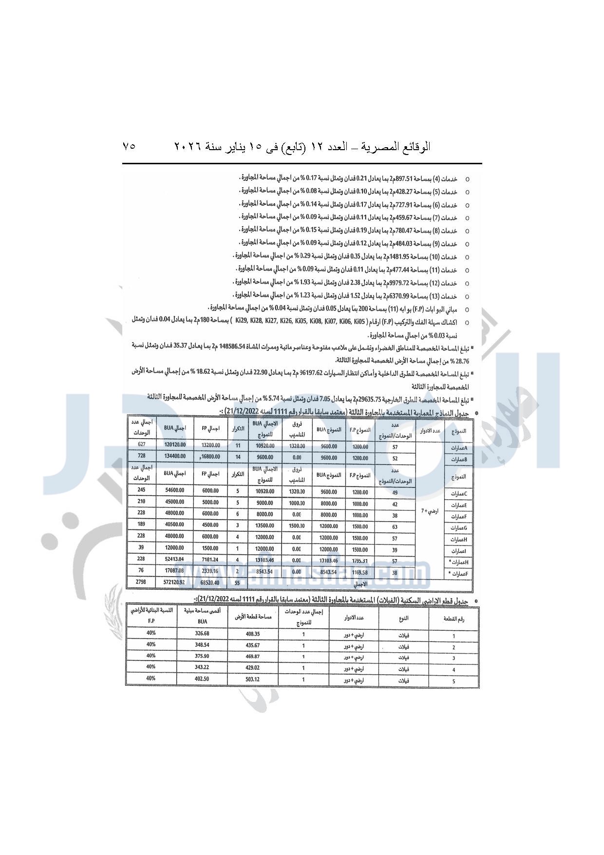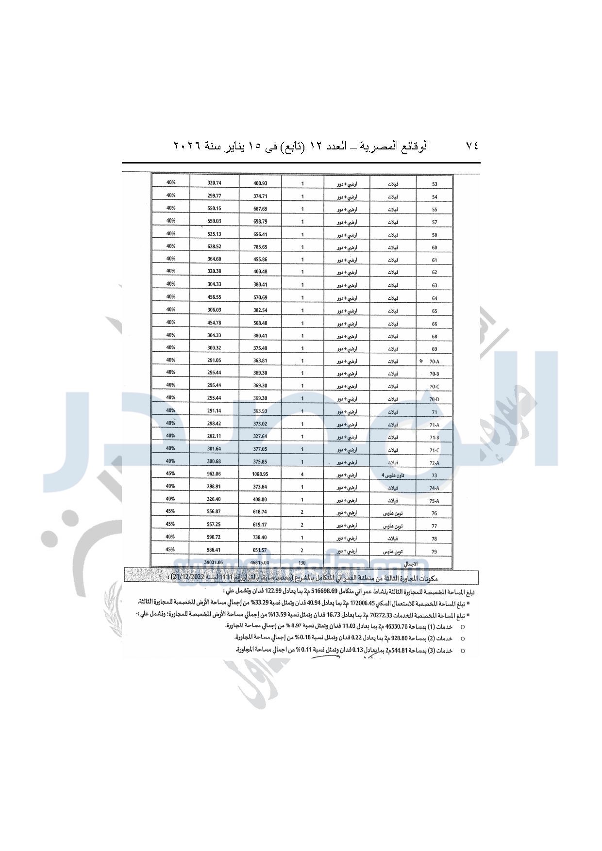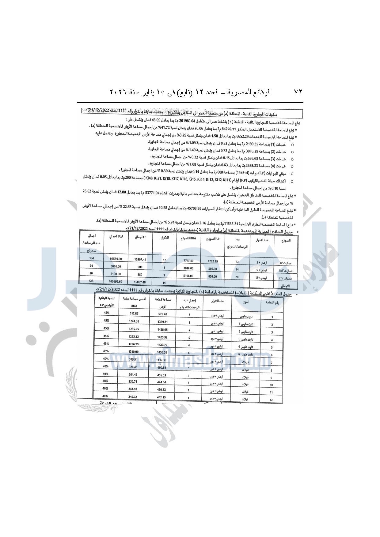 نشرت الوقائع المصرية، في العدد 12 "تابع"، الصادر بتاريخ 15 يناير 2026، قرار وزارة الإسكان والمرافق والمجتمعات العمرانية، رقم 440 لسنة 2025، بتاريخ 14-4-2025، بشأن اعتماد المخطط التفصيلي للمنطقة "E" وتعديل جزء من المخطط التفصيلي للمنطقة "A" بالمجاورة "4 أ" وتعديل جزء من المخطط التفصيلي للمنطقة "ج" بالمجاورة الثانية ضمن قطعة الأرض رقم "9" بمساحة 501.09 فدان بمنطقة الألف فدان غرب مشروع مدينتى بالامتداد الشرقي لمدينة القاهرة الجديدة والمخصصة لشركة ماونتن فيو للتنمية والاستثمار العقارى لإقامة مشروع "عمرانى متكامل بنسبة 80% وخدمات بنسبة 20%" بنظام المشاركة مع الهيئة.