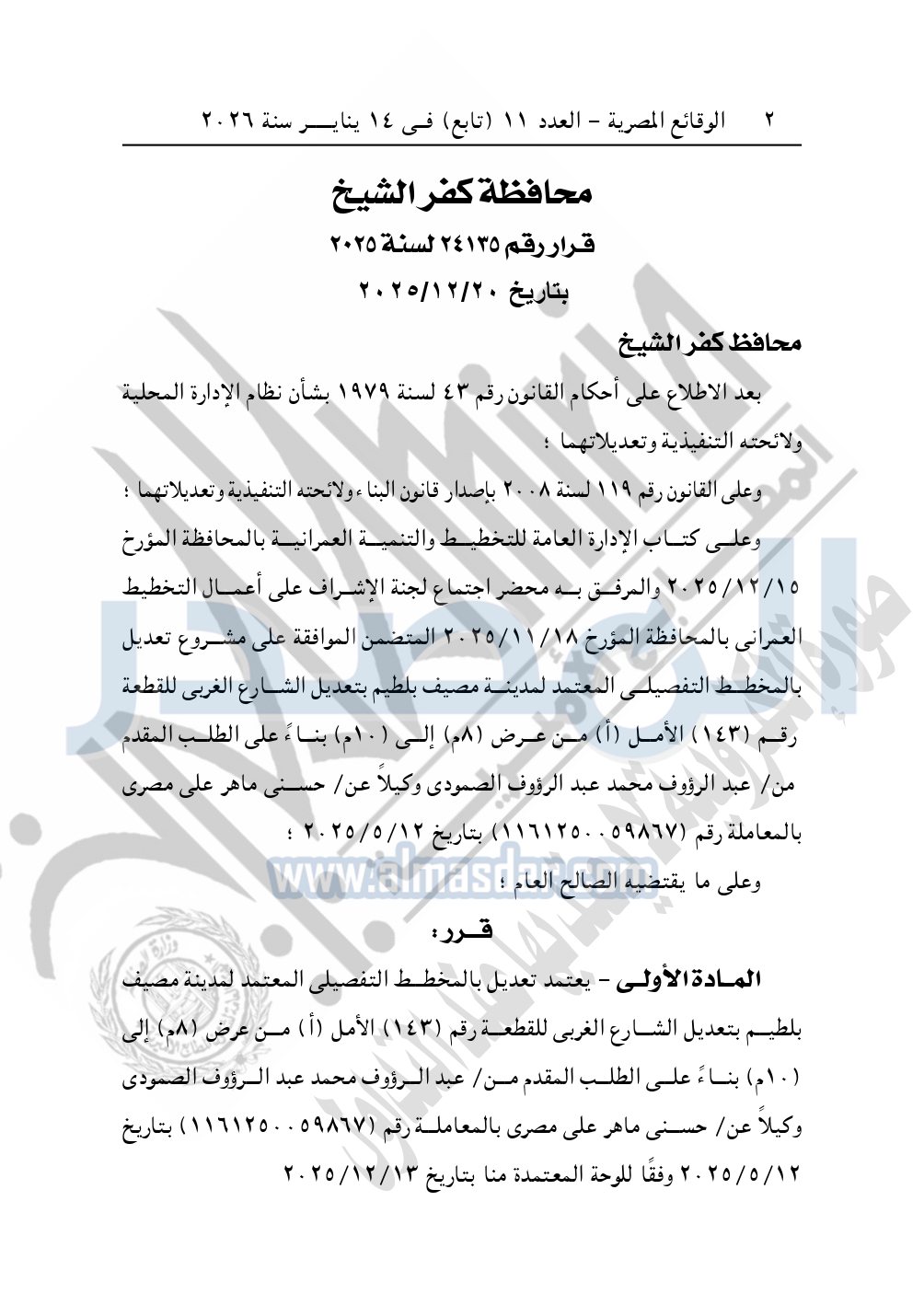 كما نشرت الوقائع المصرية، في العدد 11 "تابع"، الصادر بتاريخ 14 يناير 2026، قرار محافظة كفر الشيخ، رقم 24135 لسنة 2025، بتاريخ 20-12-2025، بشأن إعتماد تعديل بالمخطط التفصيلي المعتمد لمدينة مصيف بلطيم.