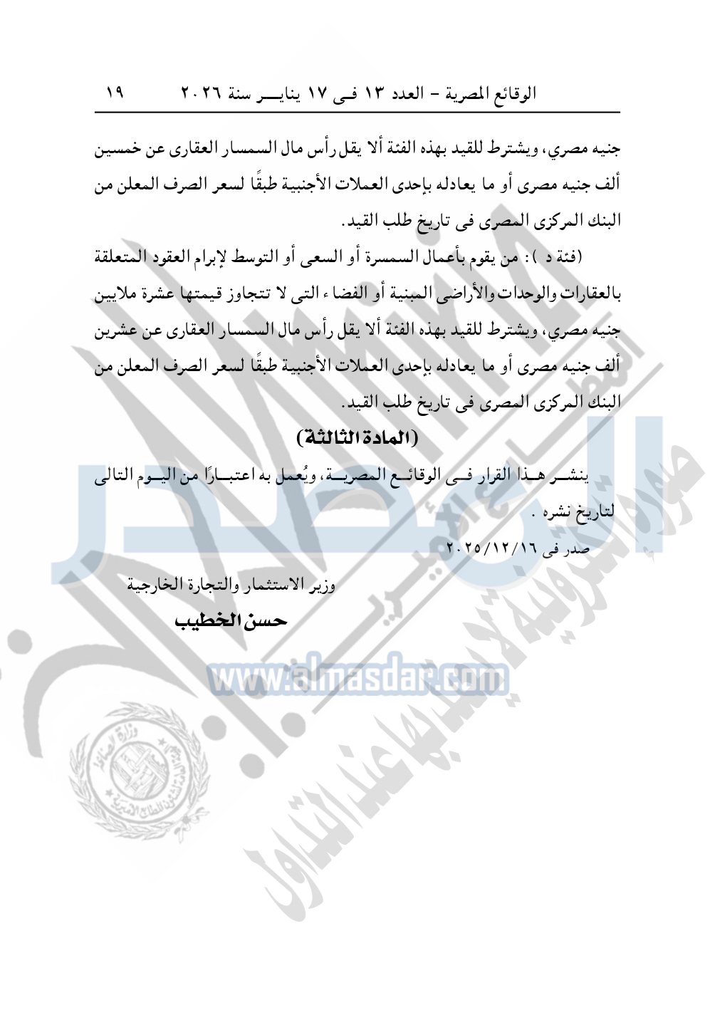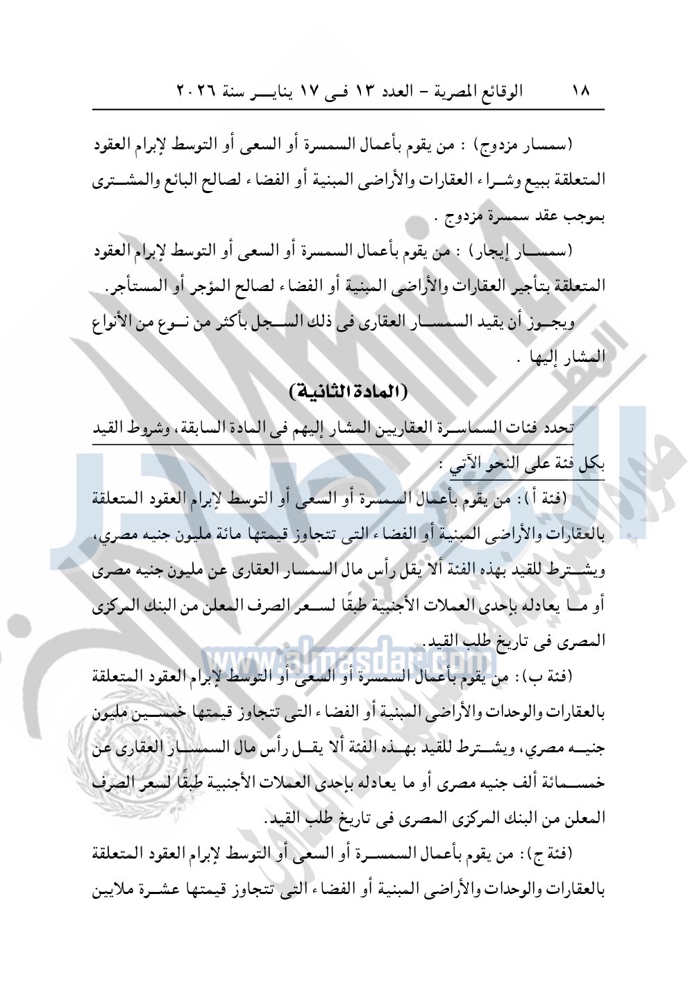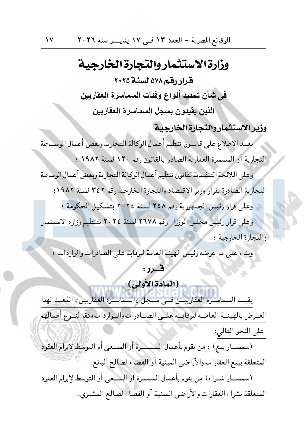 نشرت الوقائع المصرية في العدد 13، الصادر في 17 يناير سنة 2026، قرار وزارة الاستثمار والتجارة الخارجية، رقم 578 لسنة 2025، بشأن تحديد أنواع وفئات السماسرة العقاريين الذين يقيدون بسجل السماسرة العقاريين.