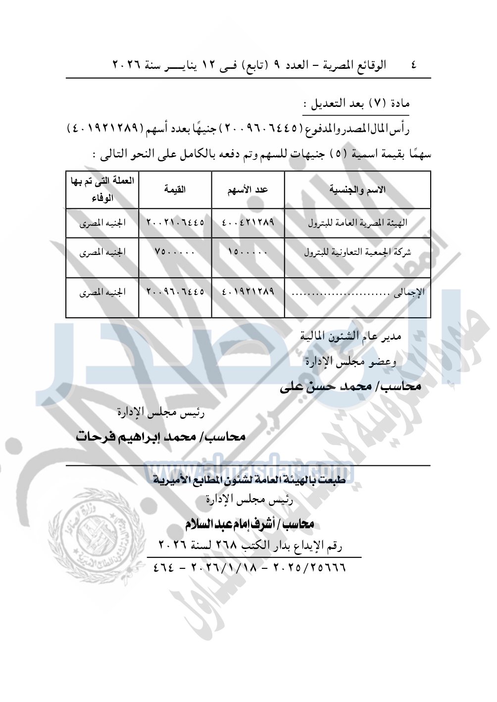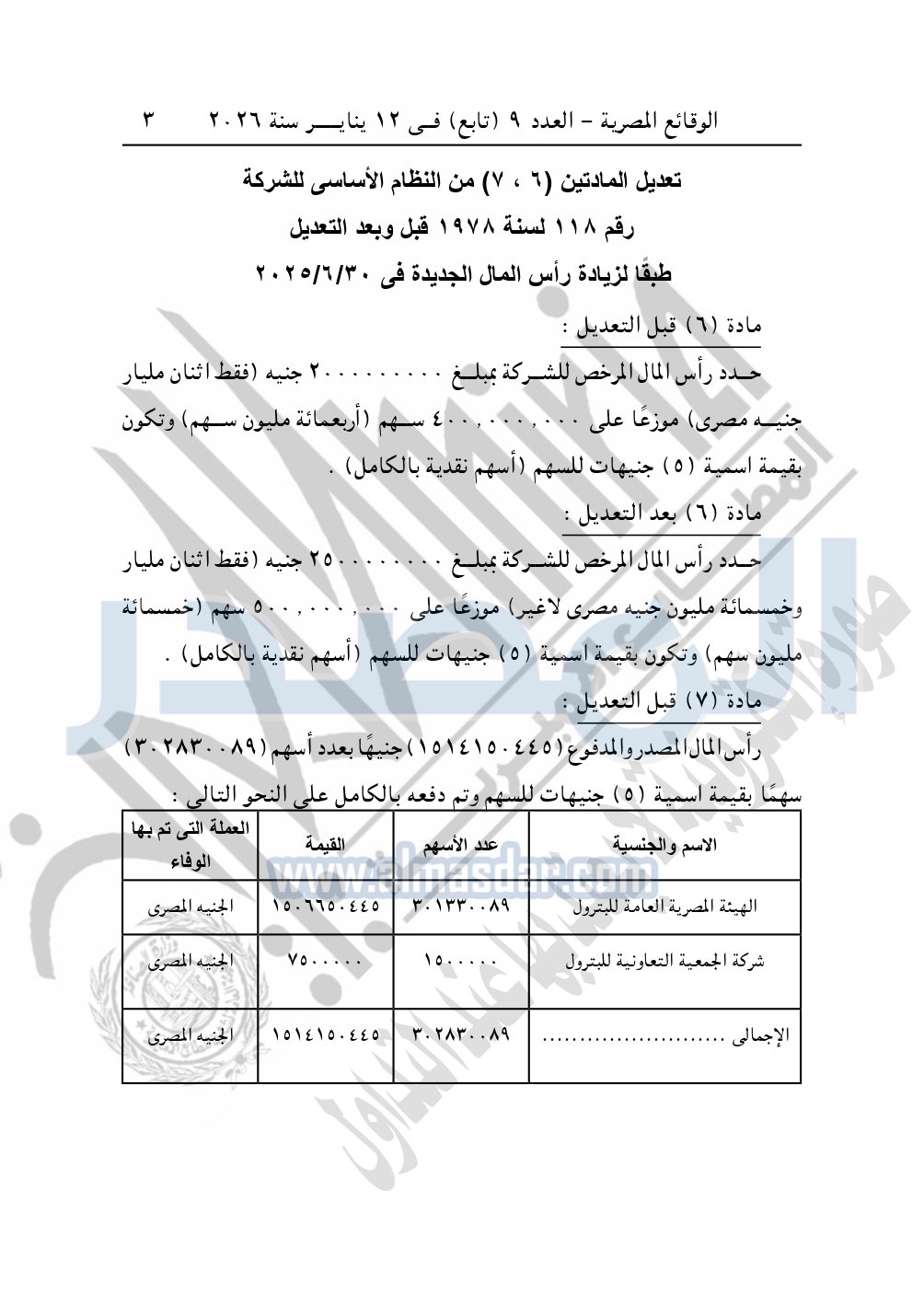 نشرت الوقائع المصرية، في العدد 9 "تابع"، الصادر في 12 يناير سنة 2026، قرار شركة الغازات البترولية «بتروجاس» أمانة سر مجلس الإدارة، بشأن زيادة رأسمال الغازات البترولية «بتروجاس» إلى 2 مليار جنيه.