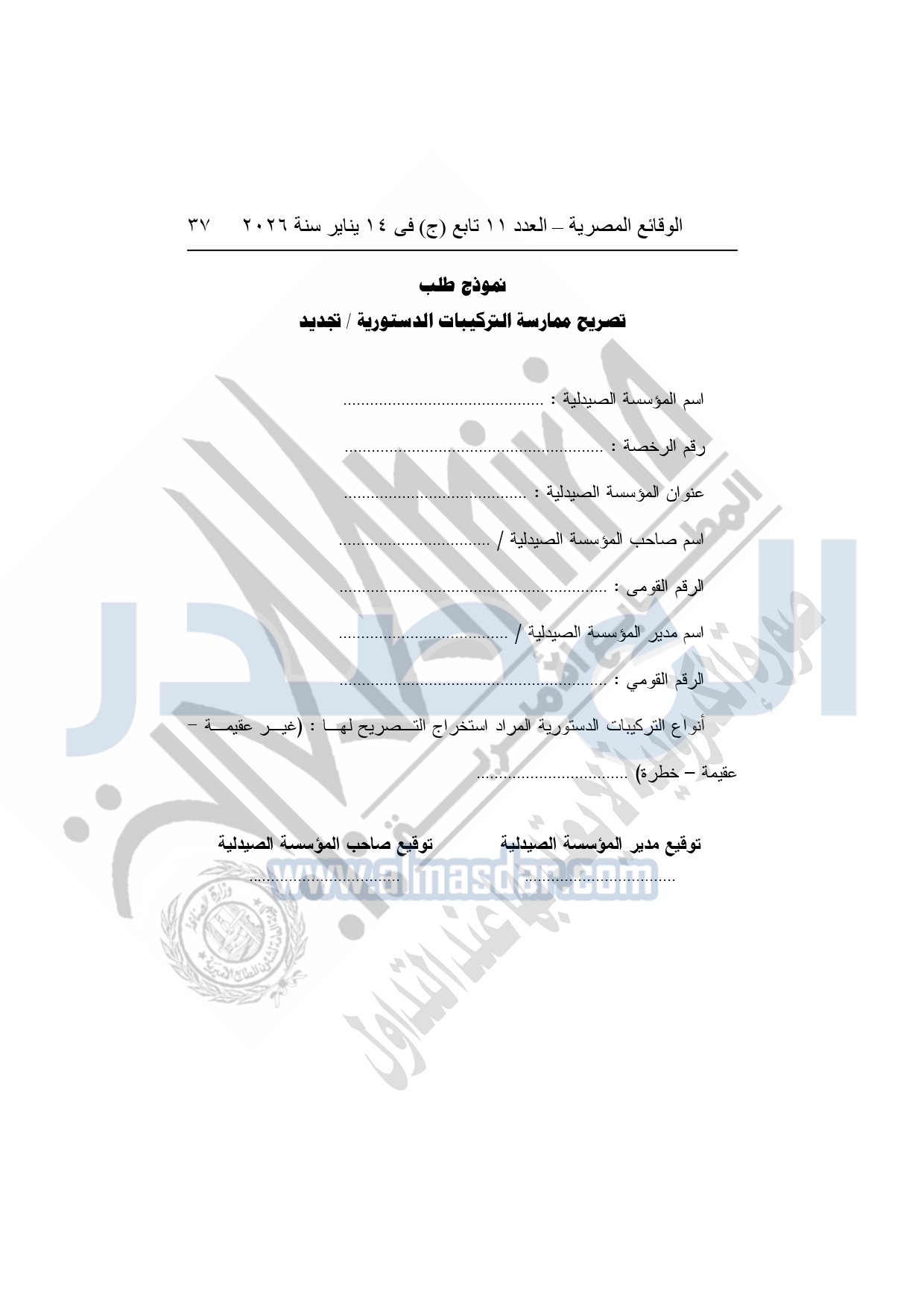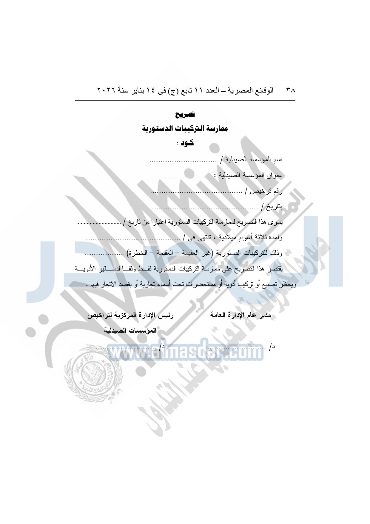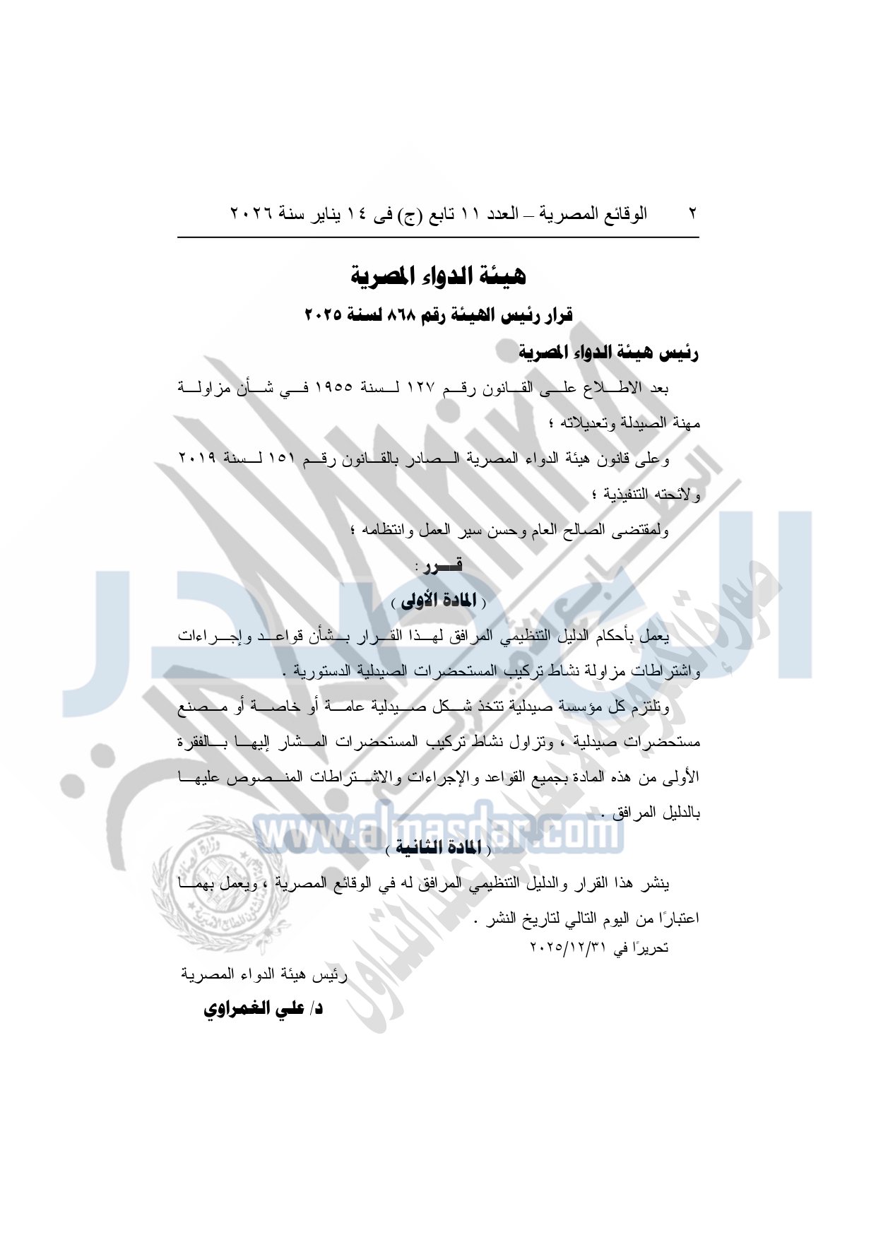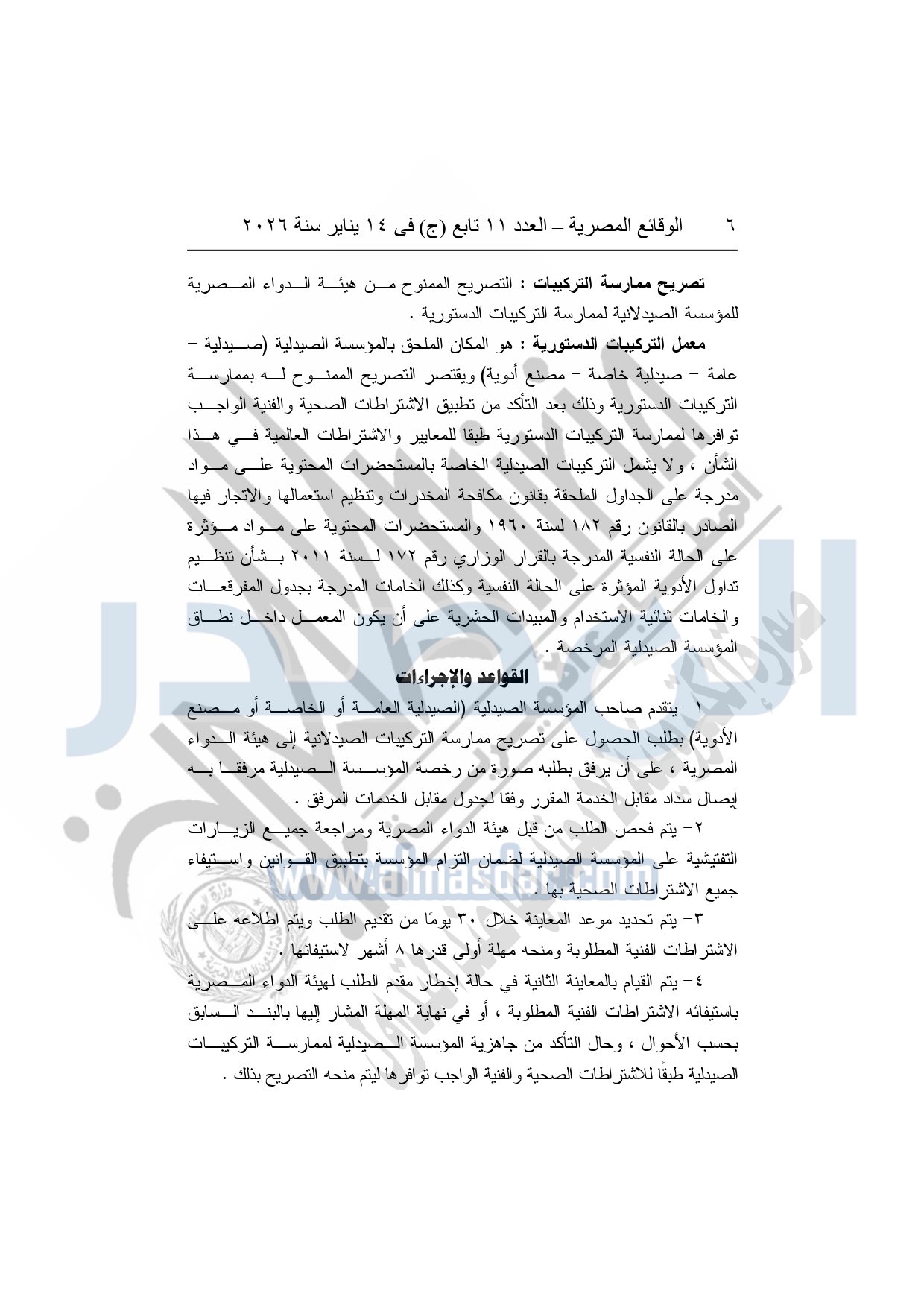 نشرت الوقائع المصرية، في العدد 11 تابع "ج"، الصادر في 14 يناير سنة 2026، قرار هيئة الدواء المصرية، قرار رئيس الهيئة رقم 868 لسنة 2025، بشأن قواعد وإجراءات واشتراطات مزاولة نشاط تركيب المستحضرات الصيدلية الدستورية.