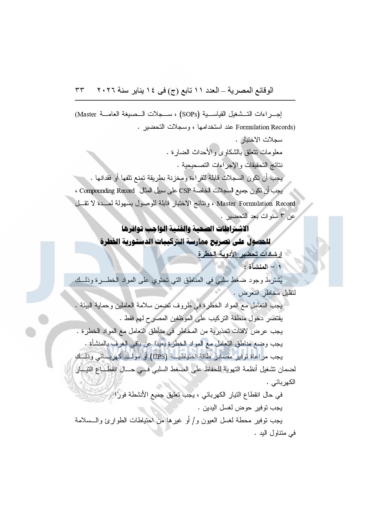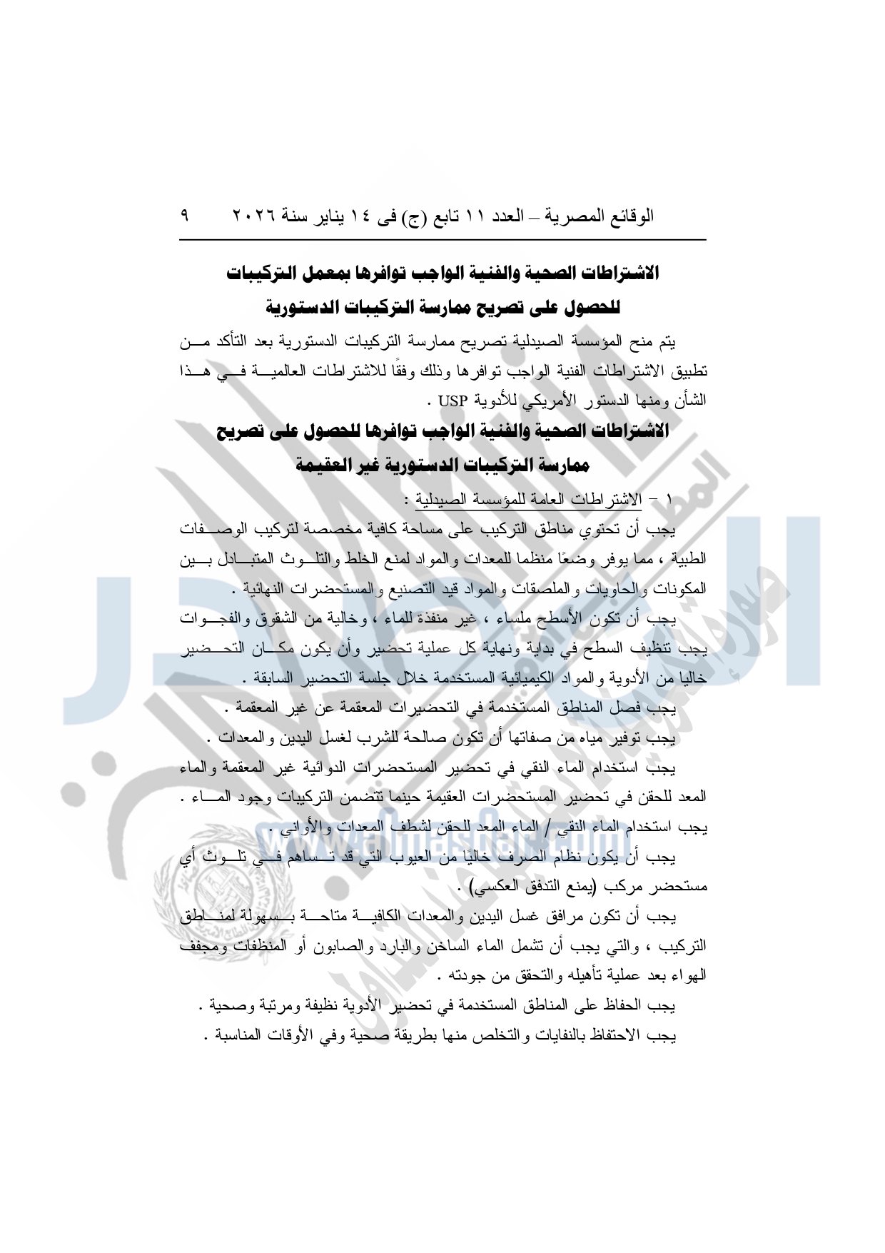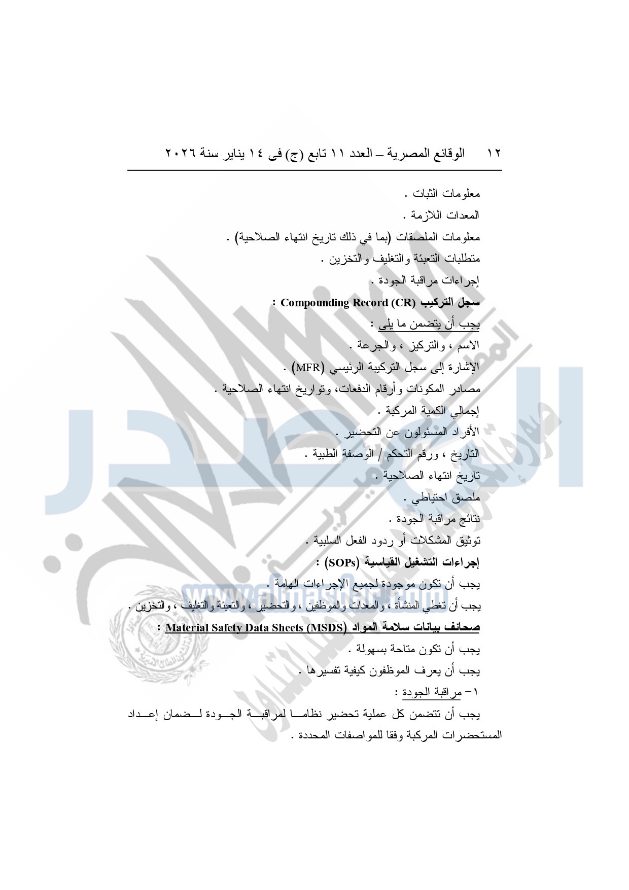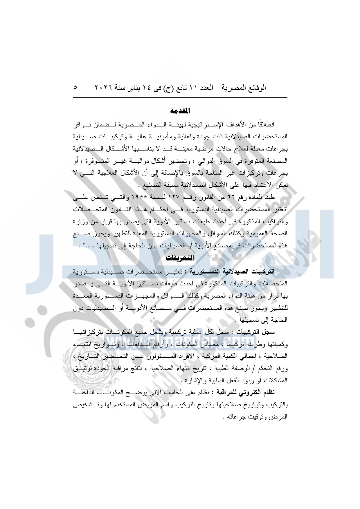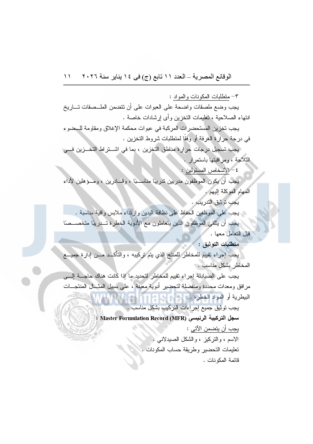 نشرت الوقائع المصرية، في العدد 11 تابع "ج"، الصادر في 14 يناير سنة 2026، قرار هيئة الدواء المصرية، قرار رئيس الهيئة رقم 868 لسنة 2025، بشأن قواعد وإجراءات واشتراطات مزاولة نشاط تركيب المستحضرات الصيدلية الدستورية.