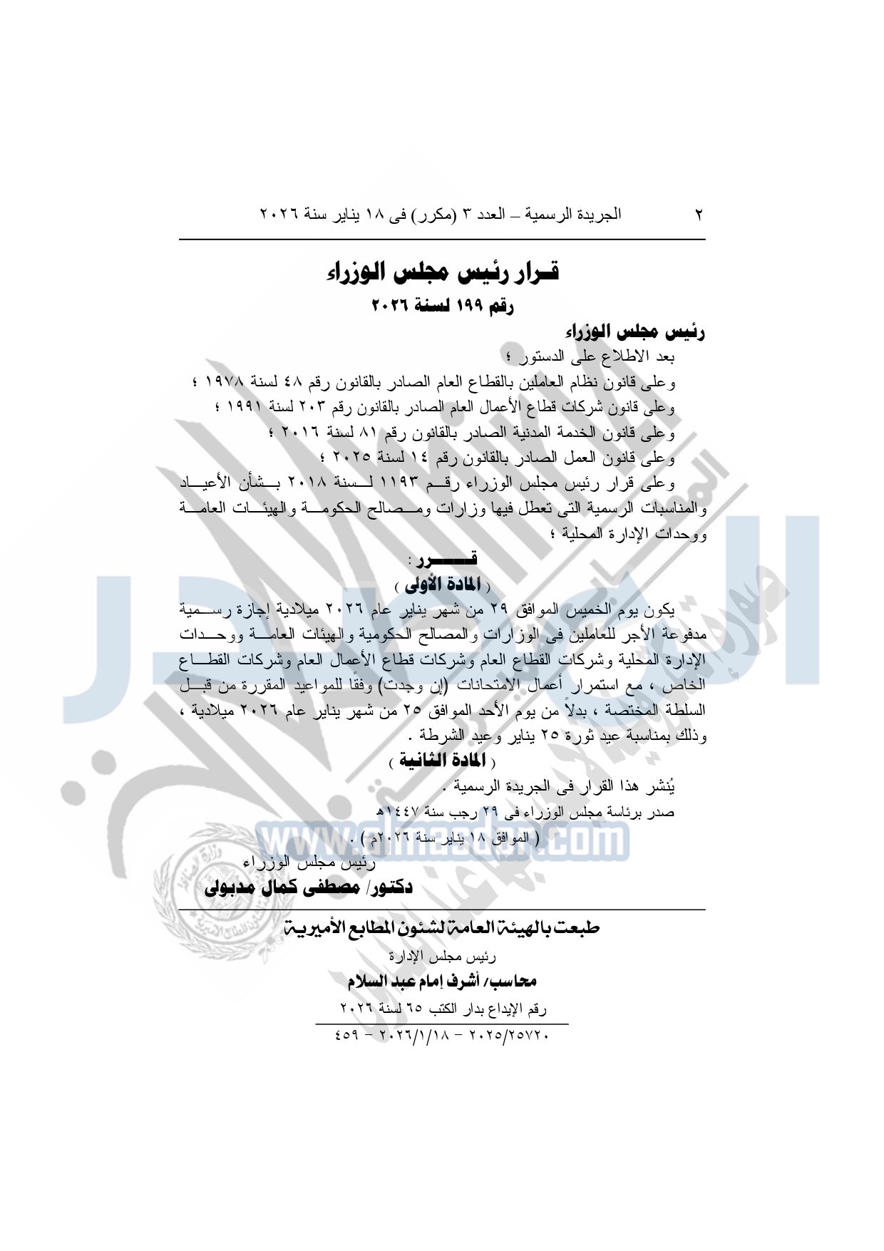 أصدر الدكتور مصطفى مدبولي، رئيس مجلس الوزراء، قراراً بأن يكون يوم الخميس الموافق 29 من شهر يناير عام 2026 ميلادية إجازة رسمية مدفوعة الأجر للعاملين في الوزارات والمصالح الحكومية والهيئات العامة ووحدات الإدارة المحلية وشركات القطاع العام وشركات قطاع الأعمال العام وشركات القطاع الخاص.