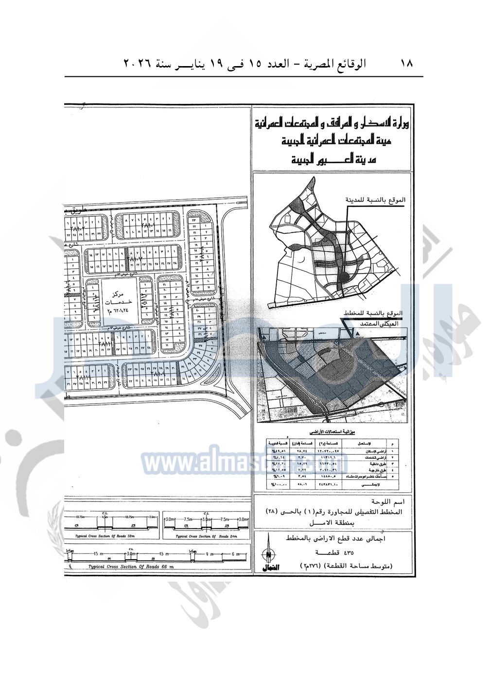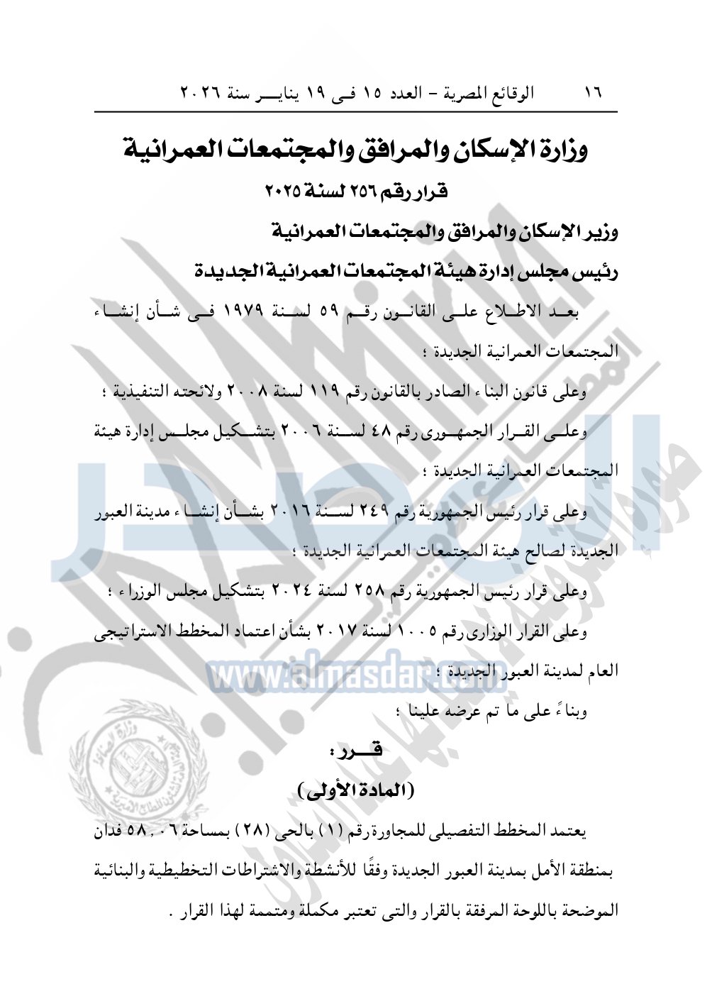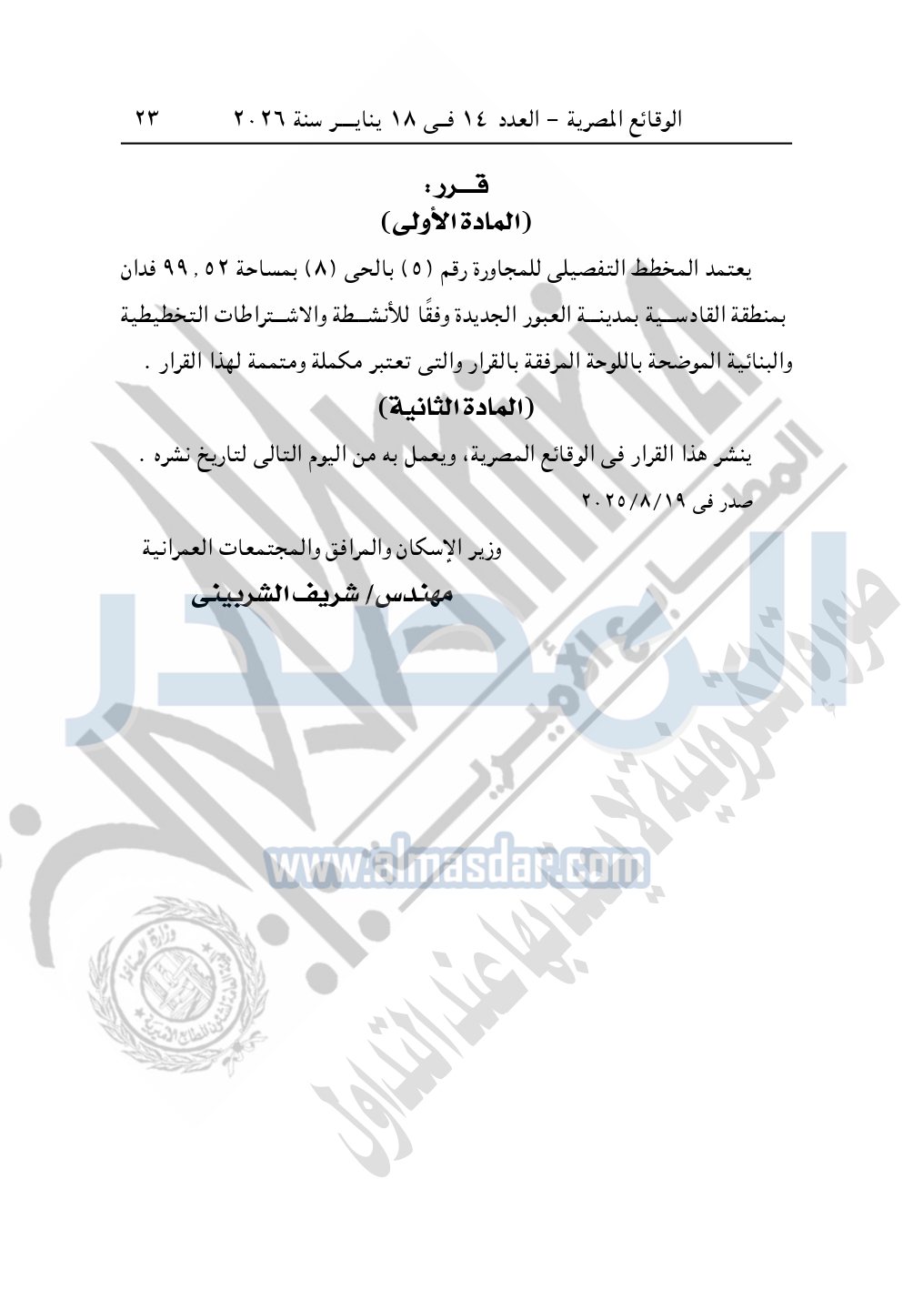 كما نشرت الوقائع المصرية، في العدد 14، الصادر في 18 يناير سنة 2026، قرار وزارة الإسكان والمرافق والمجتمعات العمرانية، قرار وزاري رقم 912 لسنة 2025، بشأن اعتماد المخطط التفصيلي للمجاورة رقم "5" بالحى "8" بمدينة العبور الجديدة.