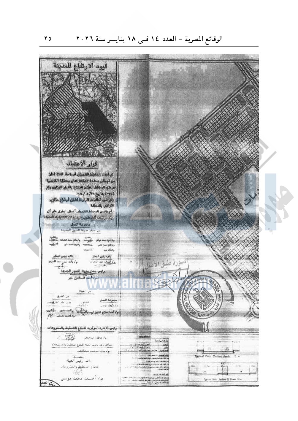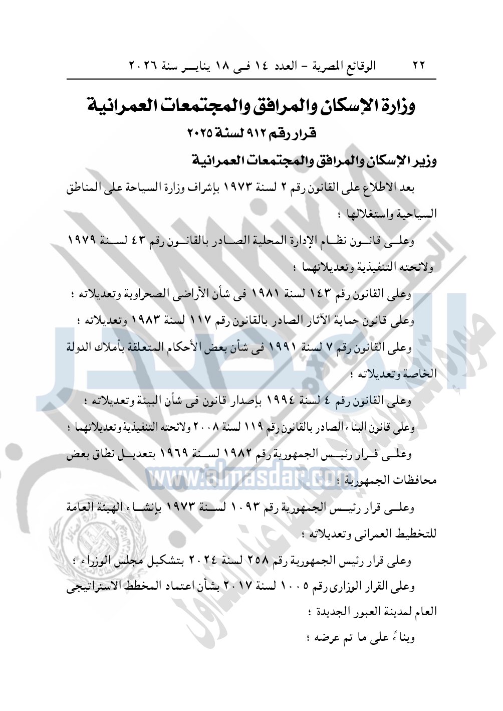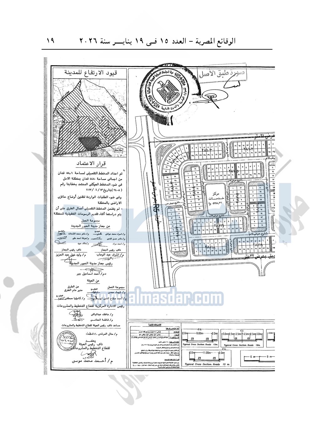 كما نشرت الوقائع المصرية، في العدد 14، الصادر في 18 يناير سنة 2026، قرار وزارة الإسكان والمرافق والمجتمعات العمرانية، قرار وزاري رقم 912 لسنة 2025، بشأن اعتماد المخطط التفصيلي للمجاورة رقم "5" بالحى "8" بمدينة العبور الجديدة.