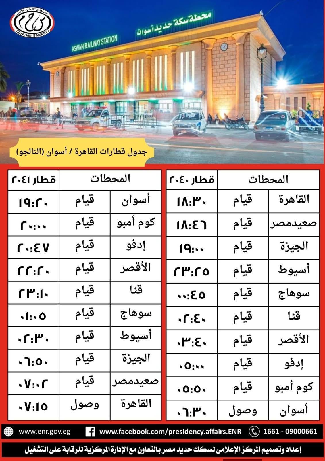 - اعتباراً من يوم الجمعه الموافق 23-1-2026 تشغيل قطار 2041 "تالجو" من أسوان - القاهرة "يوم بعد يوم" حتى يوم الأثنين الموافق 16-2-2026 حيث يقوم من أسوان الساعة 19:20 ويصل القاهرة 07:15 طبقاً للجدول المرفق.