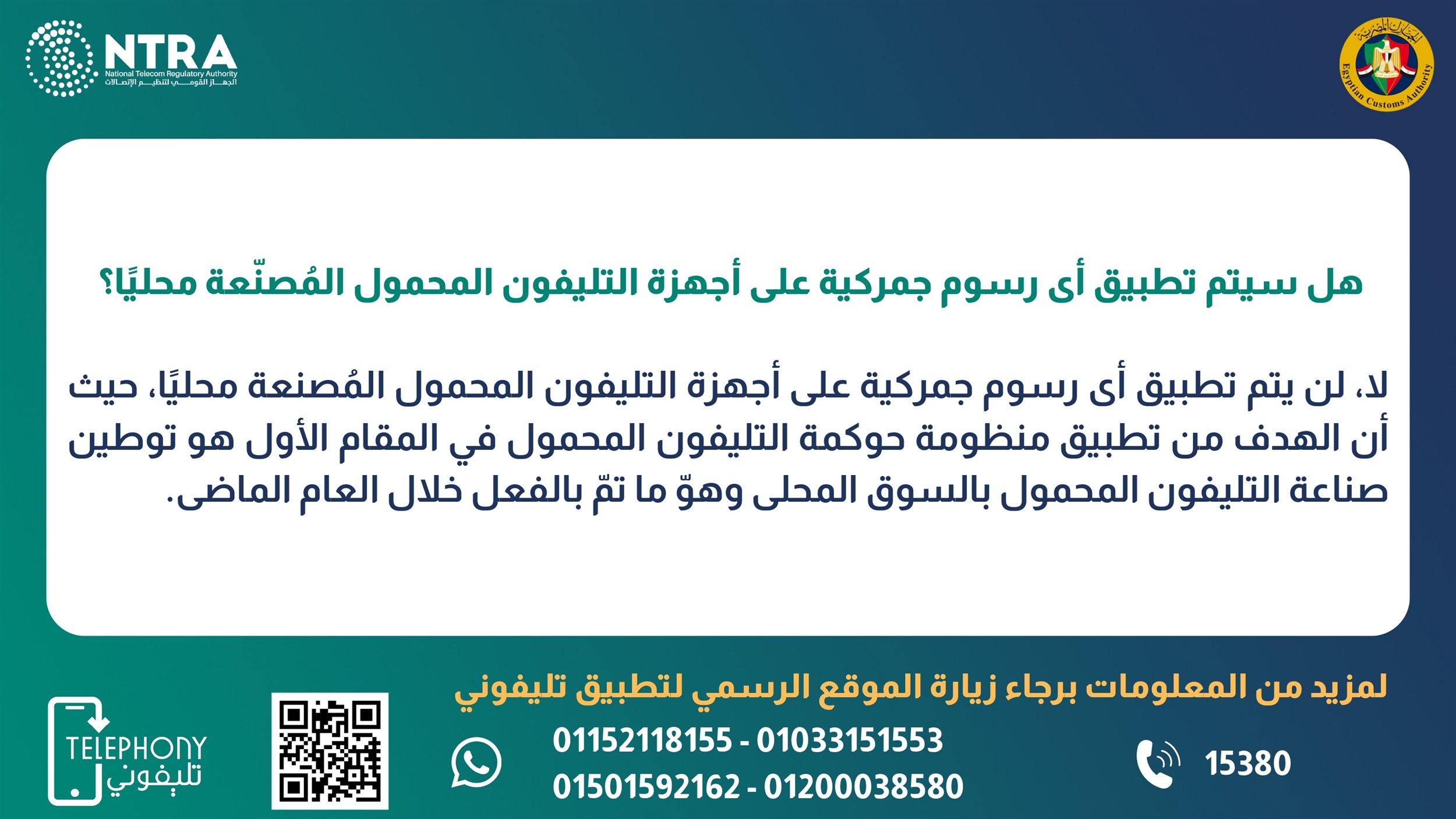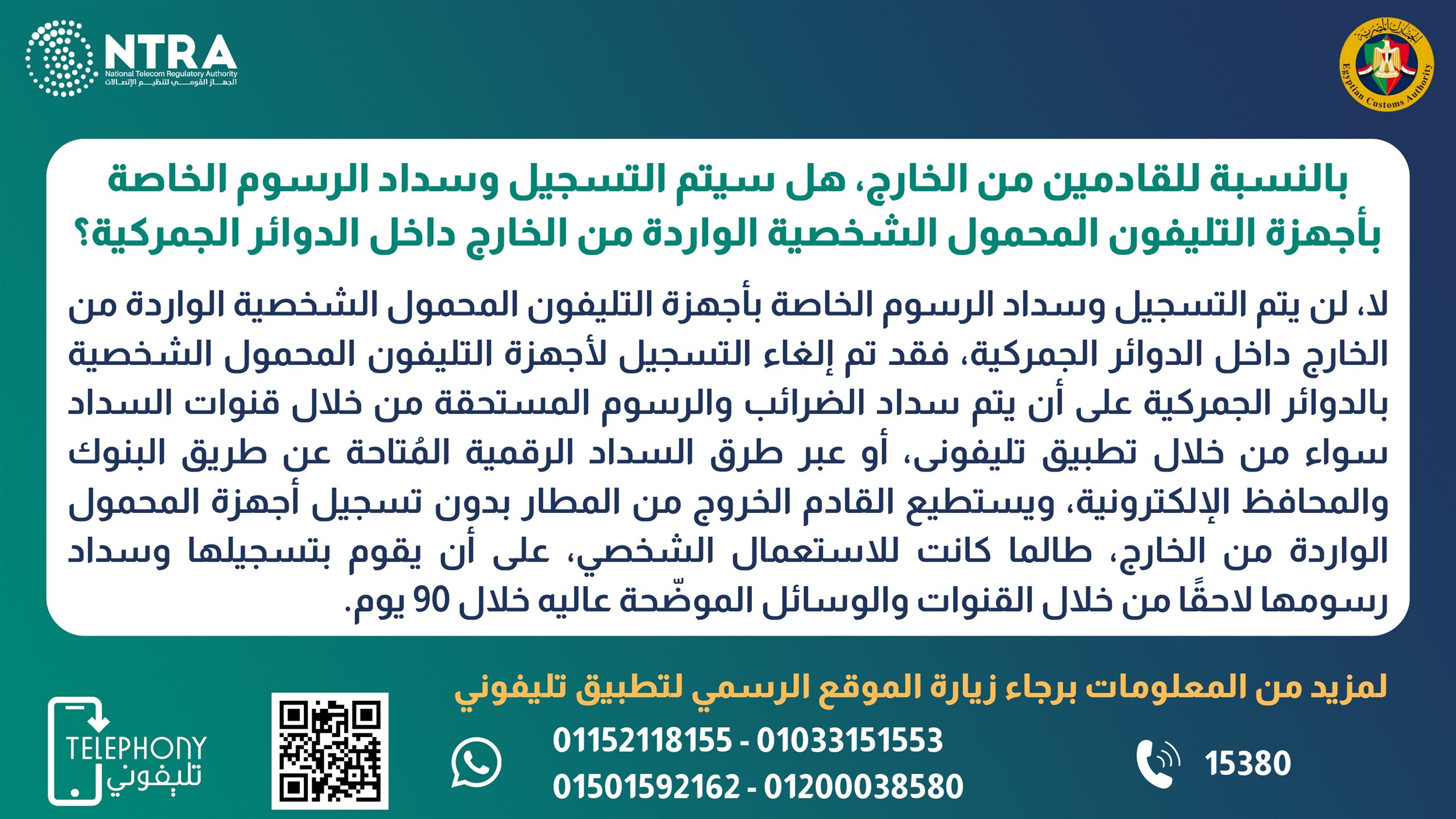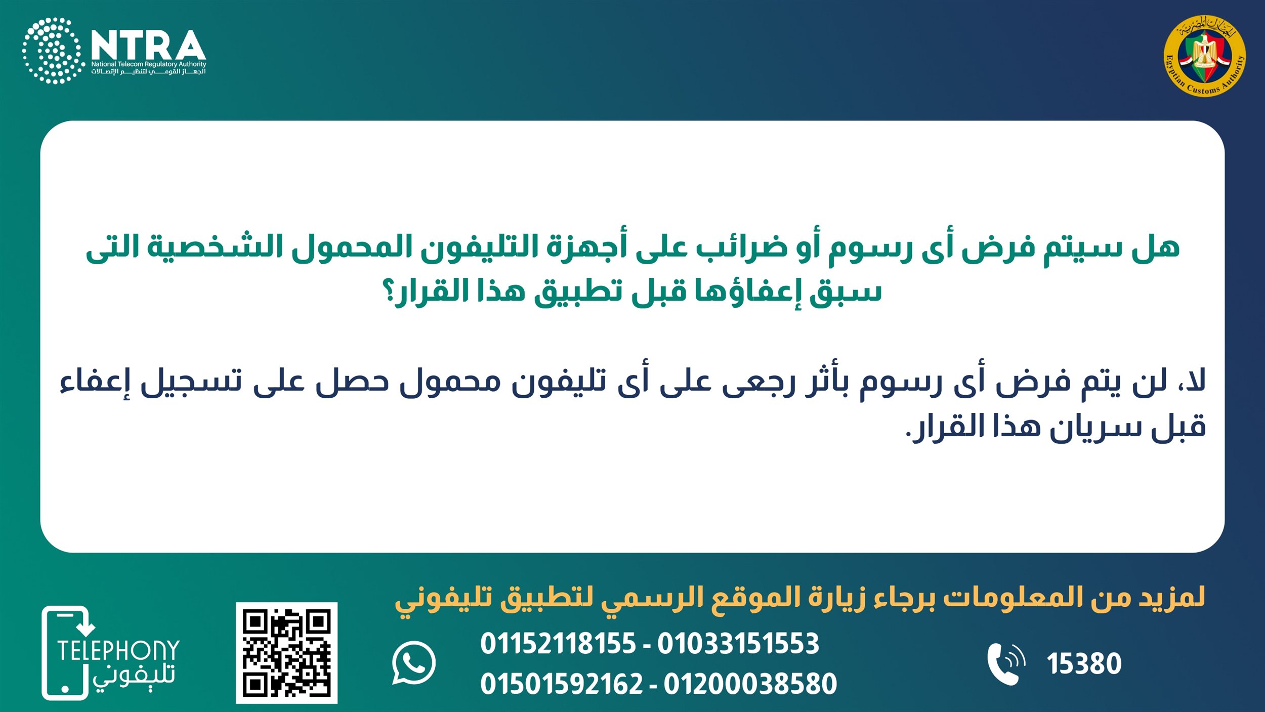 وأكدت مصلحة الجمارك والجهاز القومي لتنظيم الاتصالات، على عدم تطبيق هذه الضرائب والرسوم بأثر رجعى على الأجهزة التى تم إعفائها قبل بدء تطبيق هذا القرار، كما تحيط مصلحة الجمارك القادمين من الخارج علماً بأنه تم إلغاء تسجيل أجهزة الهاتف المحمول الشخصية بالدوائر الجمركية لانتفاء الغرض منه وأن سداد الضرائب والرسوم المستحقة يتم من خلال قنوات السداد المبينة بعاليه.