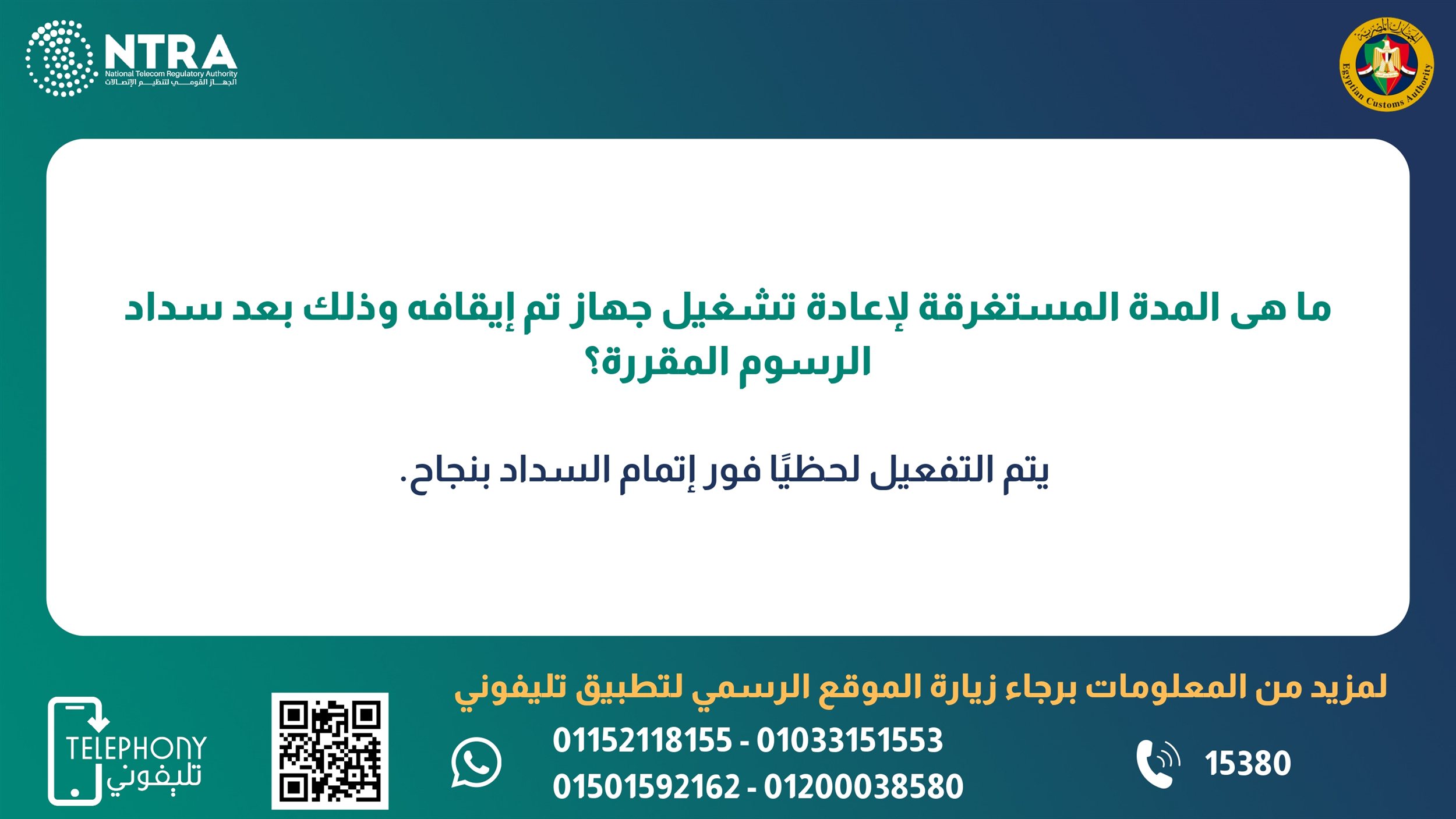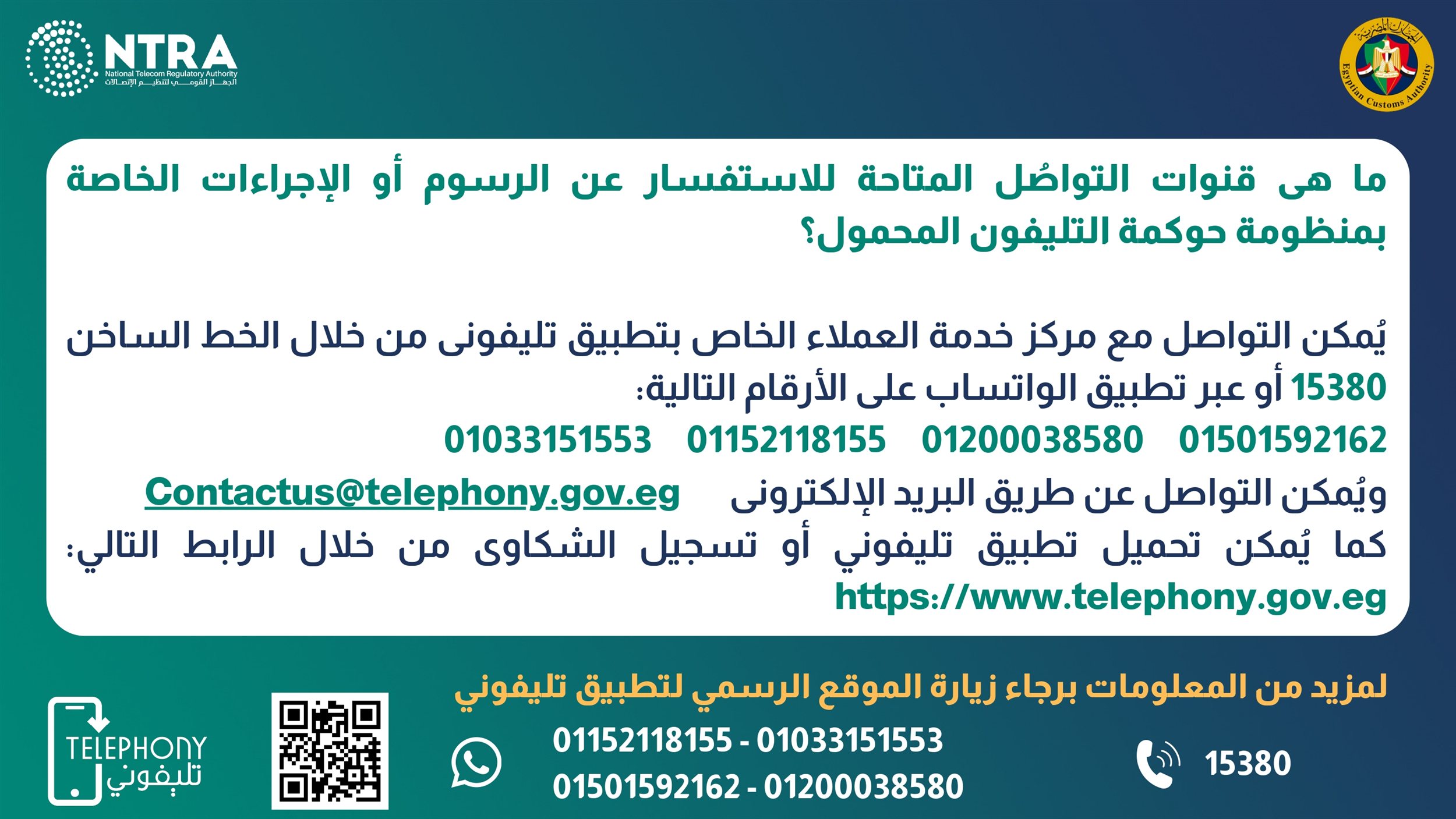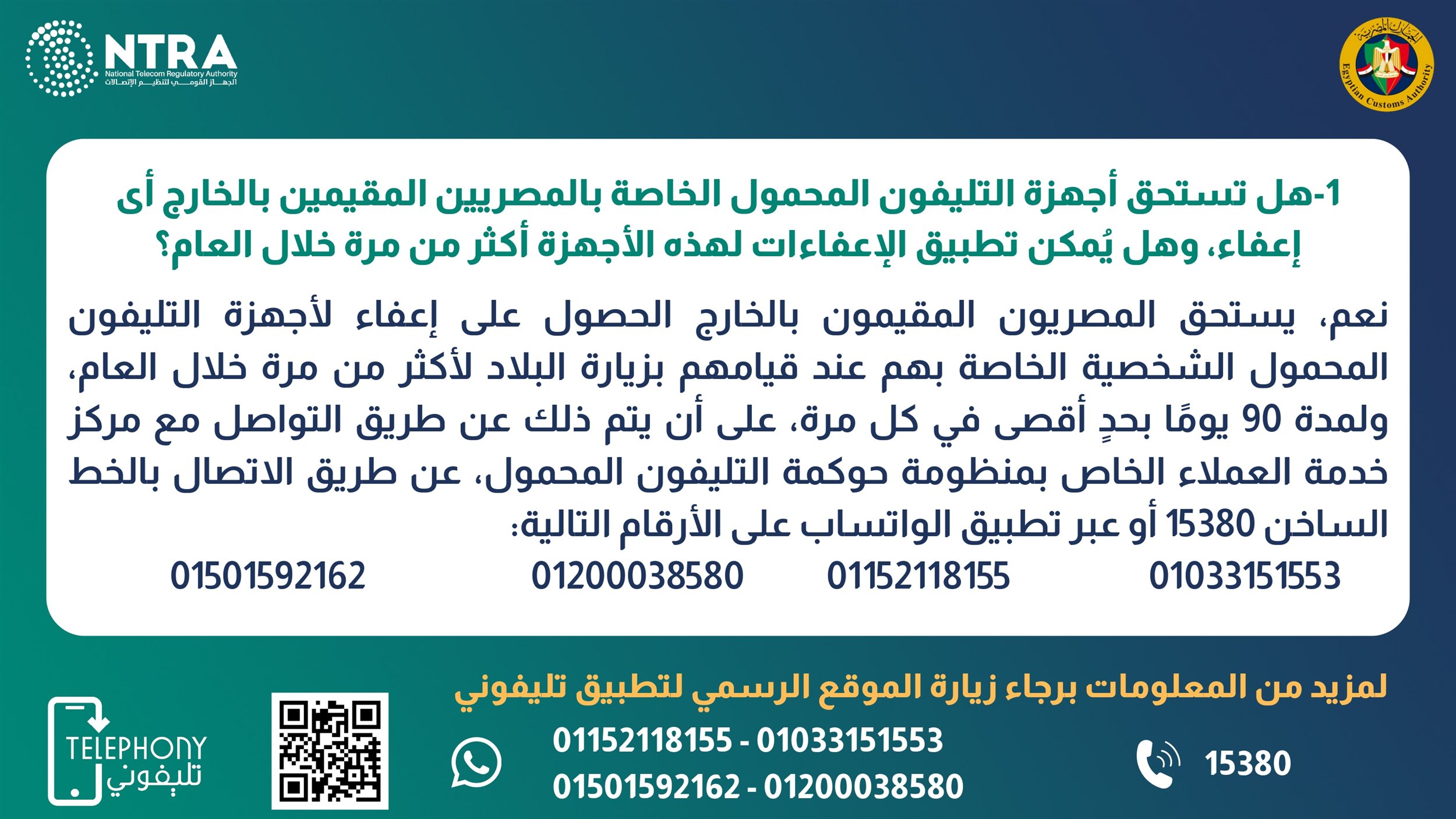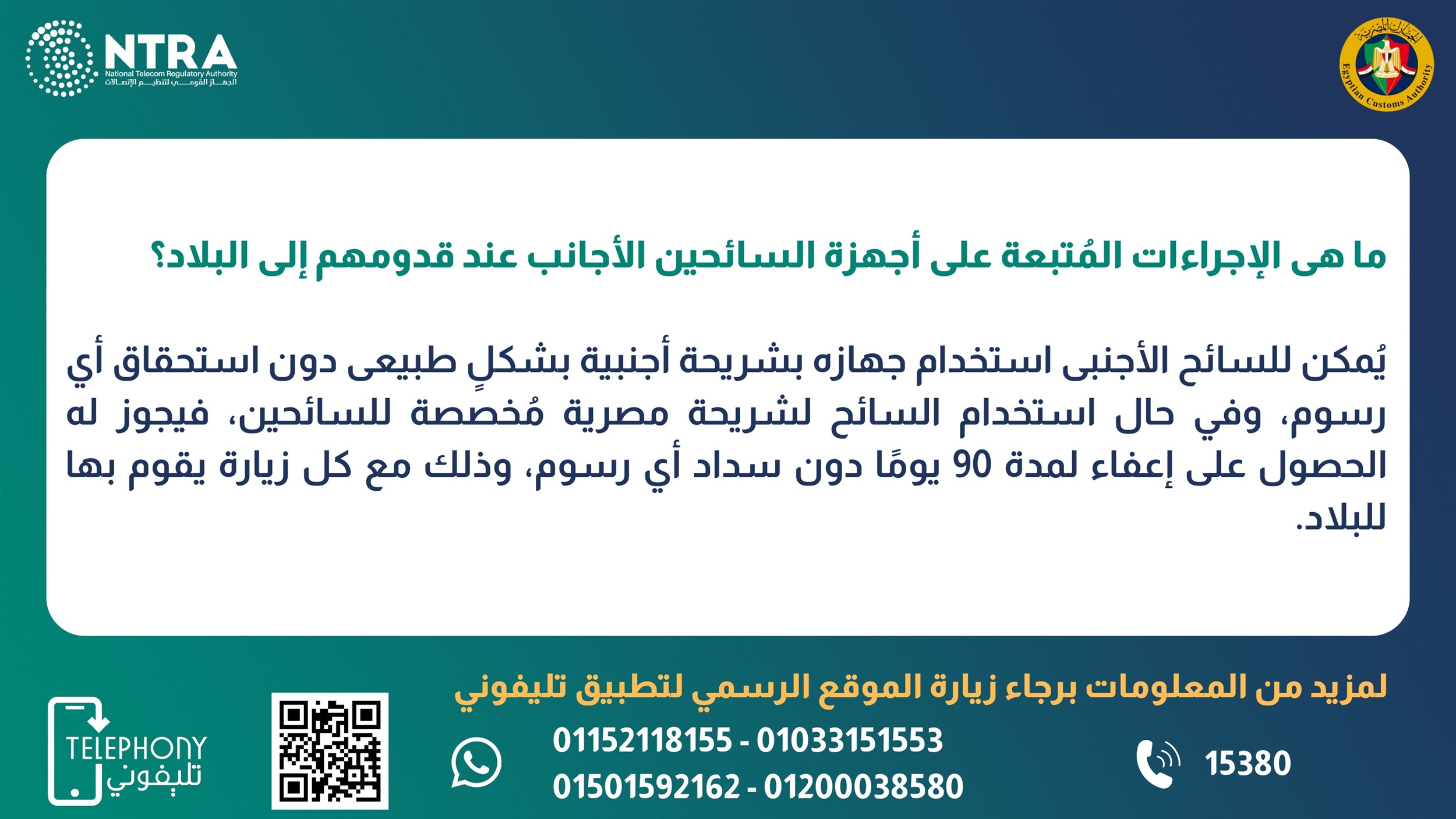 وأكدت مصلحة الجمارك والجهاز القومي لتنظيم الاتصالات، على عدم تطبيق هذه الضرائب والرسوم بأثر رجعى على الأجهزة التى تم إعفائها قبل بدء تطبيق هذا القرار، كما تحيط مصلحة الجمارك القادمين من الخارج علماً بأنه تم إلغاء تسجيل أجهزة الهاتف المحمول الشخصية بالدوائر الجمركية لانتفاء الغرض منه وأن سداد الضرائب والرسوم المستحقة يتم من خلال قنوات السداد المبينة بعاليه.