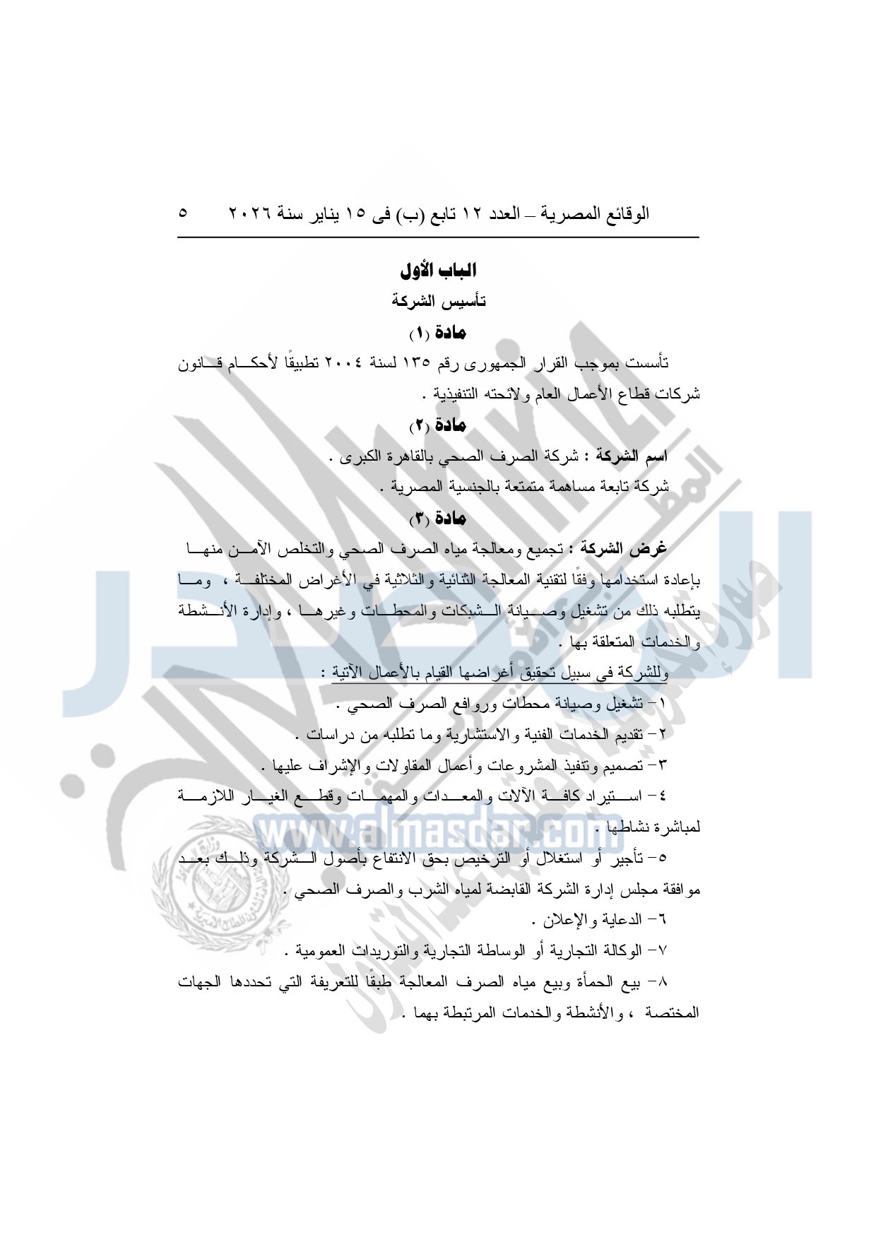 نشرت الوقائع المصرية، في العدد 12 تابع "ب"، الصادر في 15 يناير سنة 2026، قرار الشركة القابضة لمياه الشرب والصرف الصحى "ش.م.ق.م"، بشأن إعتماد النظام الأساسي المعدل لشركة الصرف الصحي بالقاهرة الكبرى.