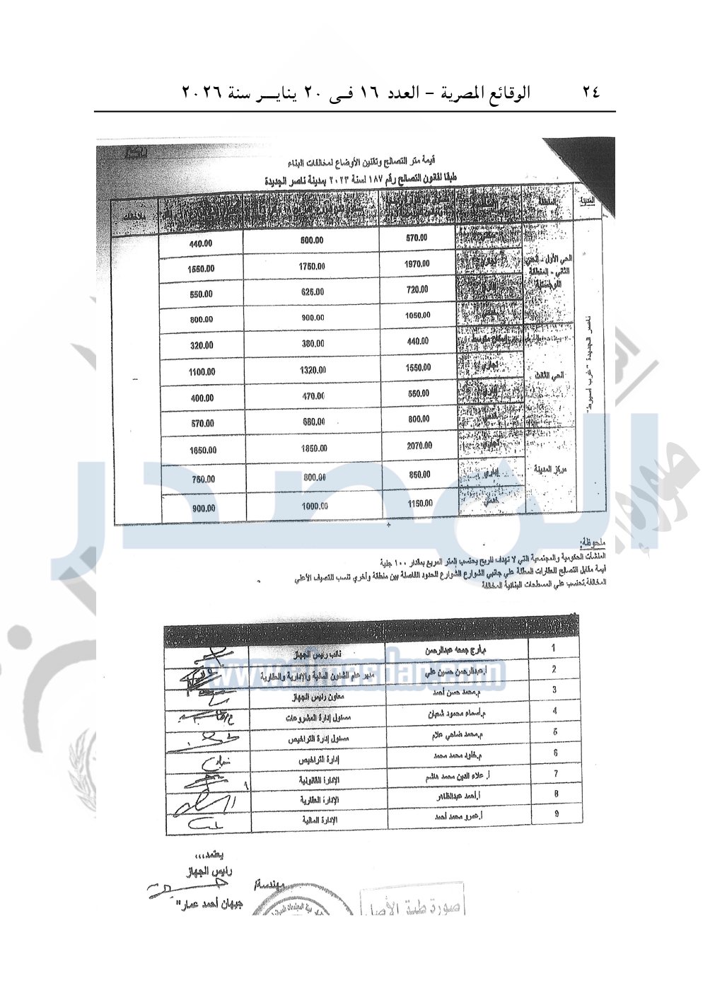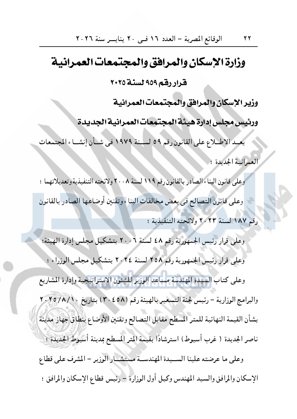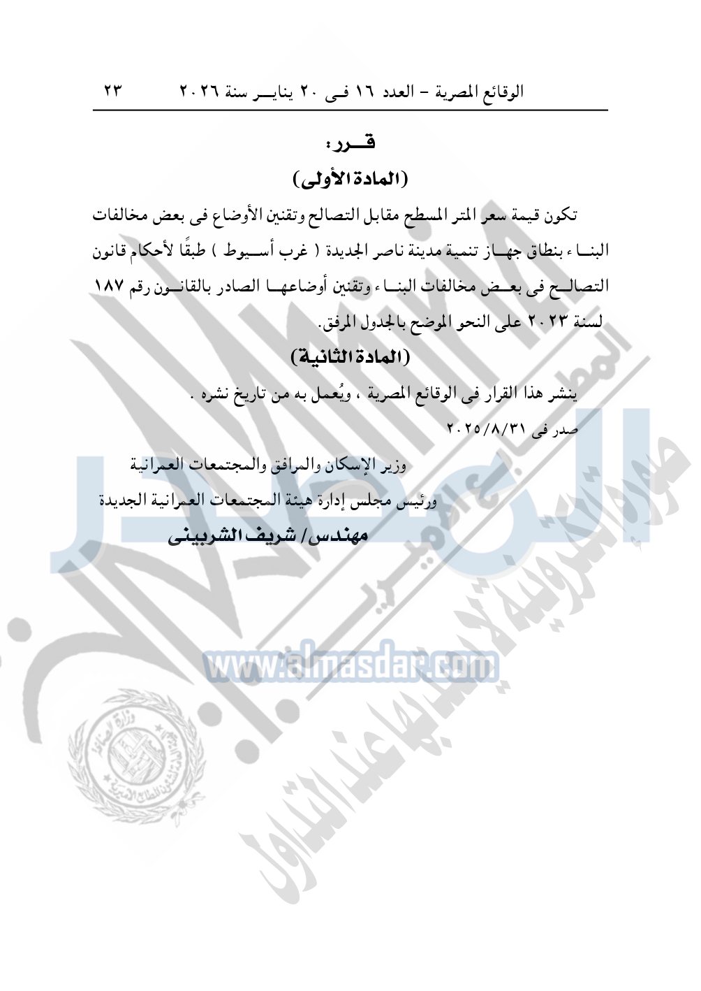 نشرت الوقائع المصرية في العدد 16، الصادر بتاريخ 20 يناير 2026، قرار وزارة الإسكان والمرافق والمجتمعات العمرانية، رقم 959 لسنة 2025، بشأن تحديد مقابل التصالح في مخالفات البناء وتقنين الأوضاع بمدينة ناصر الجديدة.