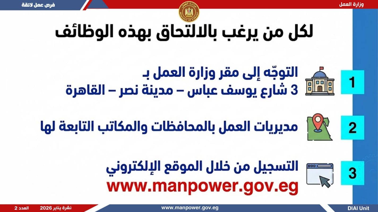 ونوهت الوزارة، إلى أن التقديم على هذه الفرص يتم من خلال الإدارة العامة للتشغيل بمقر الوزارة القديم بمدينة نصر، أو عبر مديريات العمل بالمحافظات ، كما يمكن التقديم مباشرة من خلال بيانات الشركات المرفقة بالنشرة، أو عبر الموقع الرسمي لوزارة العمل على شبكة الإنترنت.