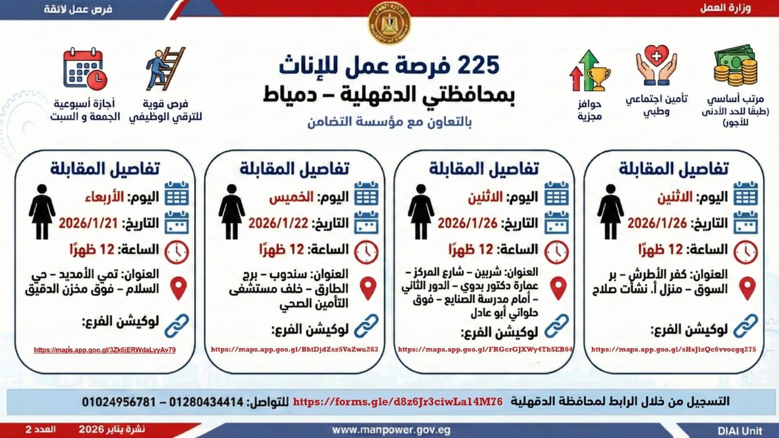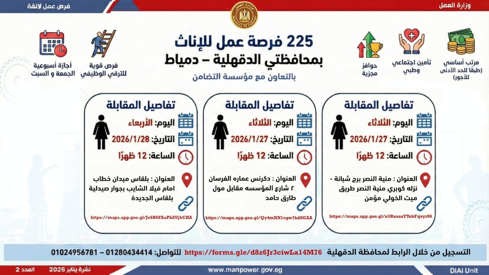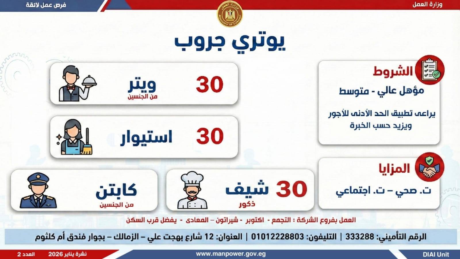 وأوضحت وزارة العمل، أن الفرص المتاحة تشمل وظائف متنوعة في عدد من التخصصات والمهن، من بينها فرص مخصصة لذوي الهمم، برواتب مجزية تُحدد وفقًا لطبيعة الوظيفة والمقابلة الشخصية، مع الالتزام الكامل بتطبيق الحد الأدنى للأجور، إلى جانب الاستفادة من مظلة التأمينات الاجتماعية والصحية.