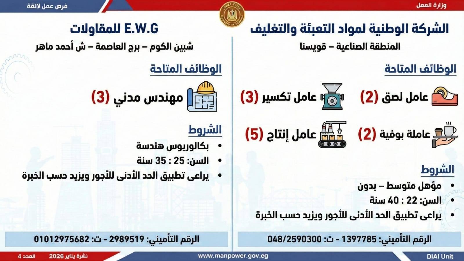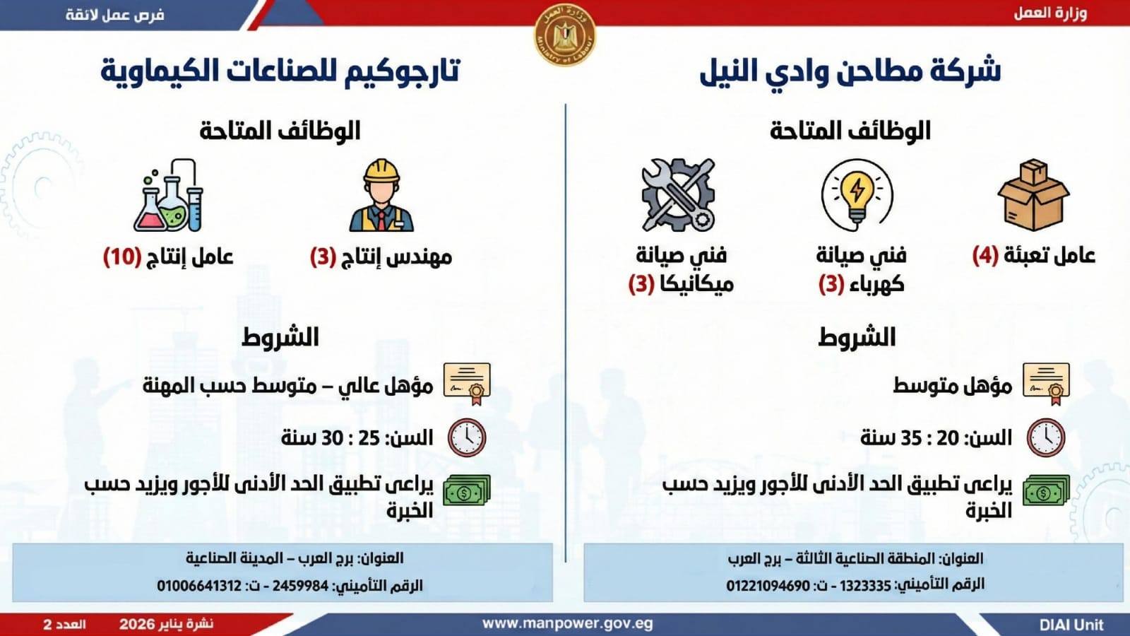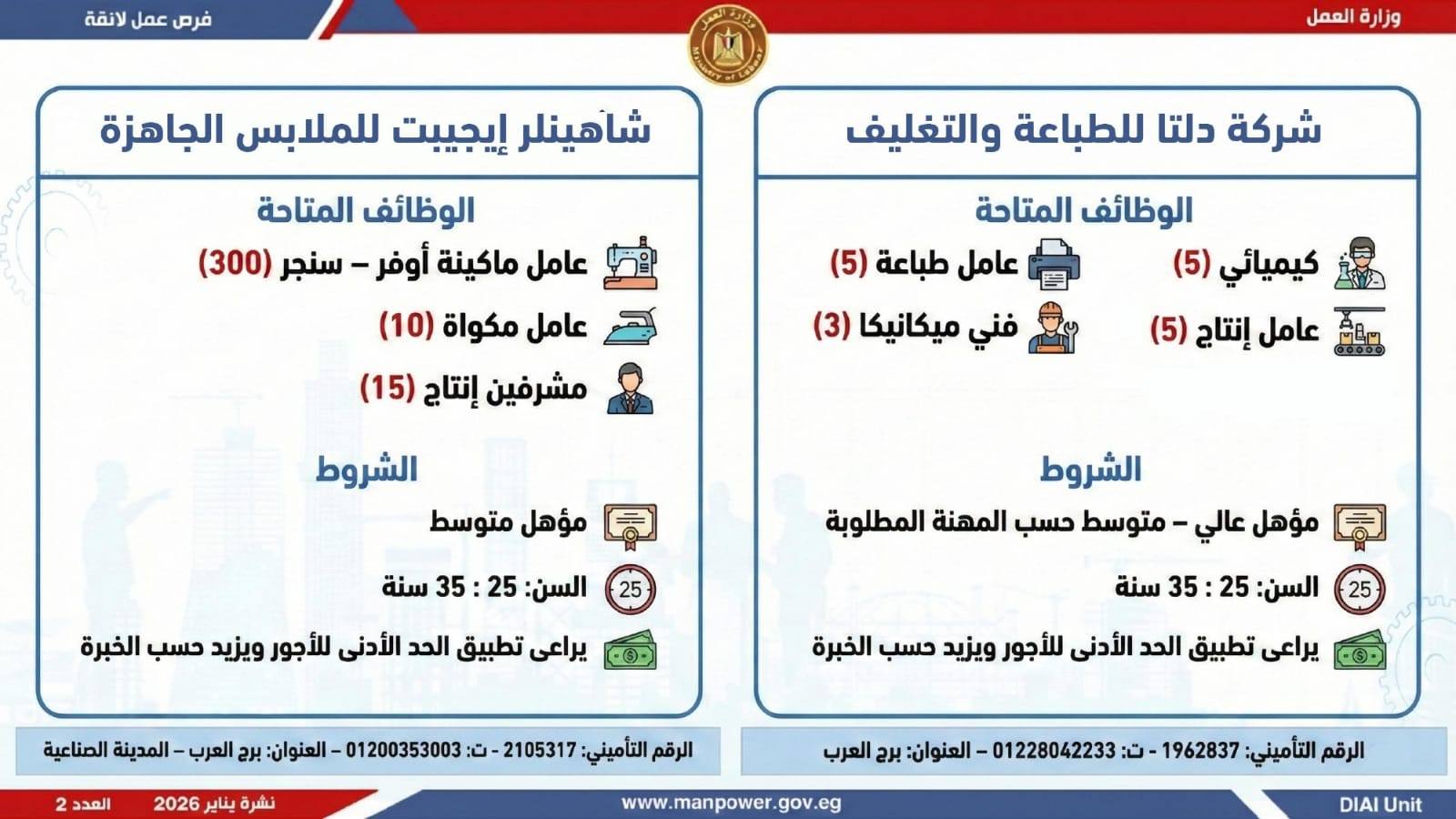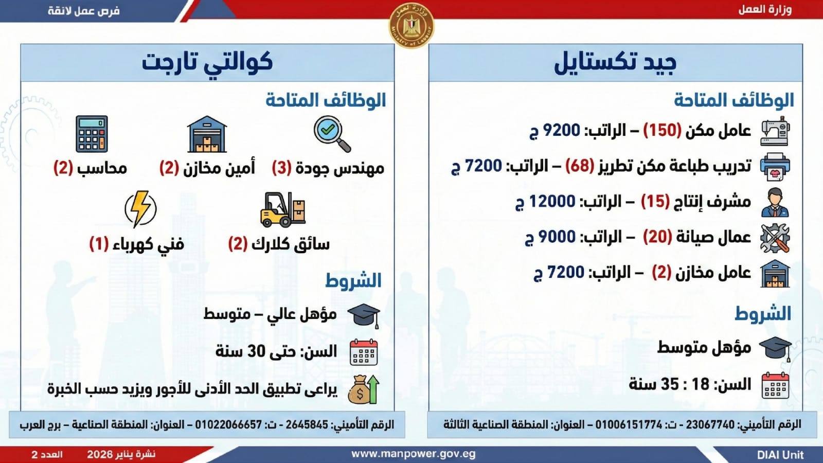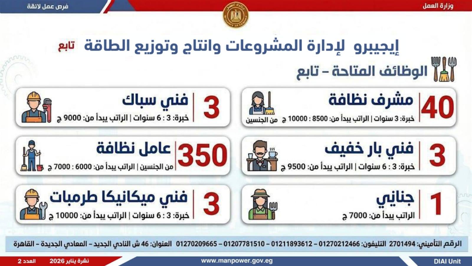 وتغطي النشرة الحالية فرص عمل بمحافظات: القاهرة، الشرقية، الإسكندرية، الغربية، الإسماعيلية، دمياط، المنيا، أسيوط، بني سويف، والمنوفية، وتشمل تخصصات متعددة، من بينها: أخصائيو تسويق وموارد بشرية، مهندسو اتصالات وكهرباء، مشرفو ميكانيكا وتحكم كهربائي،مديرو صيانة، محاسبون، مشرفو مواقع وتنجيد، "ليدي جارد – إناث"، مشرفو إنتاج، شيفات، أخصائيو مشتريات، بائعون، مقدمو طلبات، أمناء مخازن، مندوبو مبيعات، مراقبو جودة، فنيون بمختلف التخصصات، سائقون برخص أولى وثانية وثالثة، أفراد أمن، إلى جانب فرص في قطاع الفندقة والمطاعم، وأعمال إنتاج ونظافة وتخصصات أخرى.