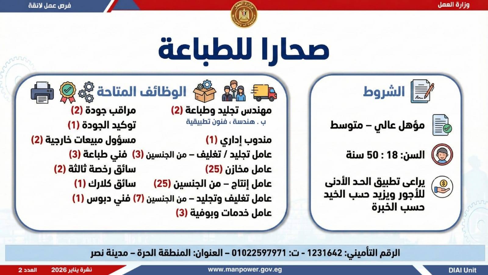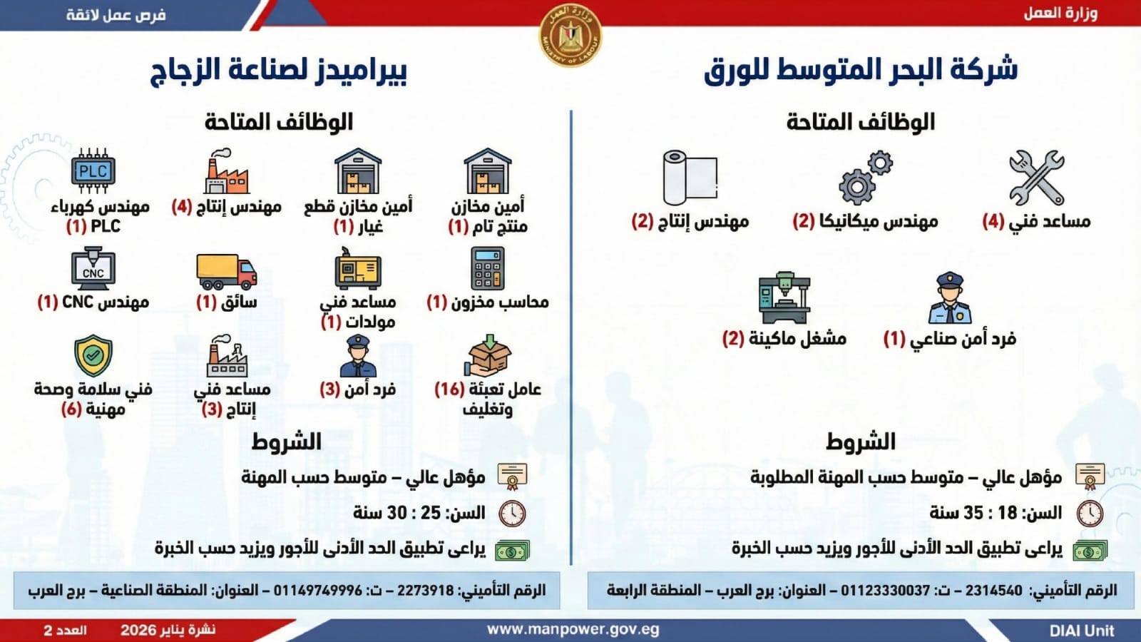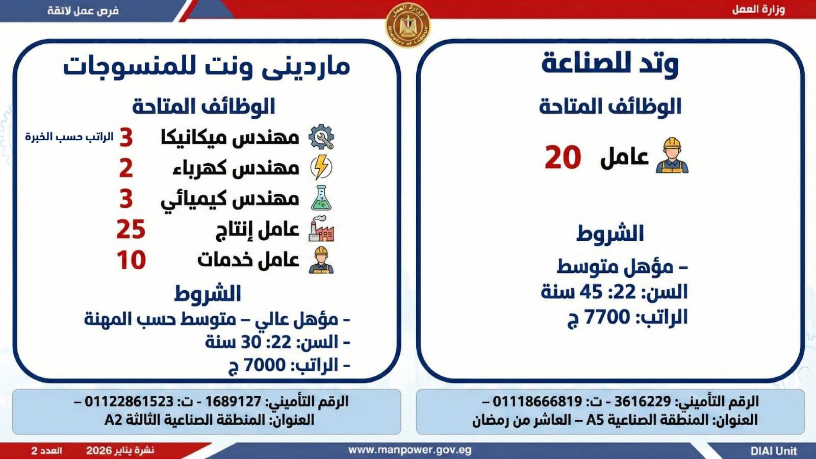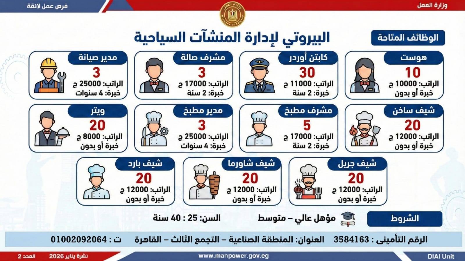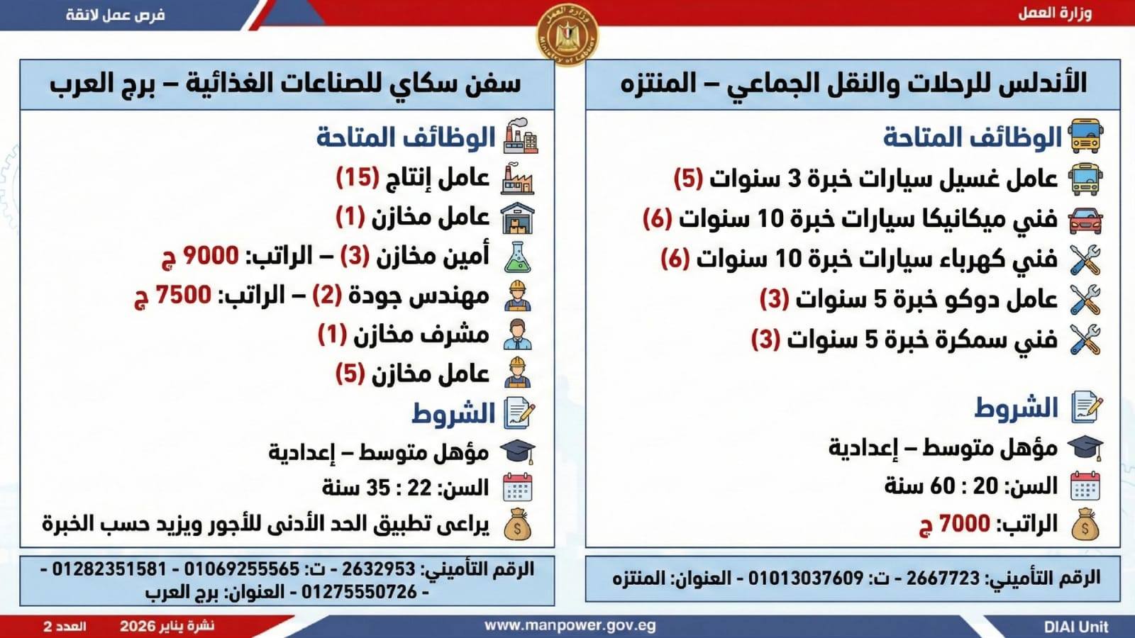 وتغطي النشرة الحالية فرص عمل بمحافظات: القاهرة، الشرقية، الإسكندرية، الغربية، الإسماعيلية، دمياط، المنيا، أسيوط، بني سويف، والمنوفية، وتشمل تخصصات متعددة، من بينها: أخصائيو تسويق وموارد بشرية، مهندسو اتصالات وكهرباء، مشرفو ميكانيكا وتحكم كهربائي،مديرو صيانة، محاسبون، مشرفو مواقع وتنجيد، "ليدي جارد – إناث"، مشرفو إنتاج، شيفات، أخصائيو مشتريات، بائعون، مقدمو طلبات، أمناء مخازن، مندوبو مبيعات، مراقبو جودة، فنيون بمختلف التخصصات، سائقون برخص أولى وثانية وثالثة، أفراد أمن، إلى جانب فرص في قطاع الفندقة والمطاعم، وأعمال إنتاج ونظافة وتخصصات أخرى.