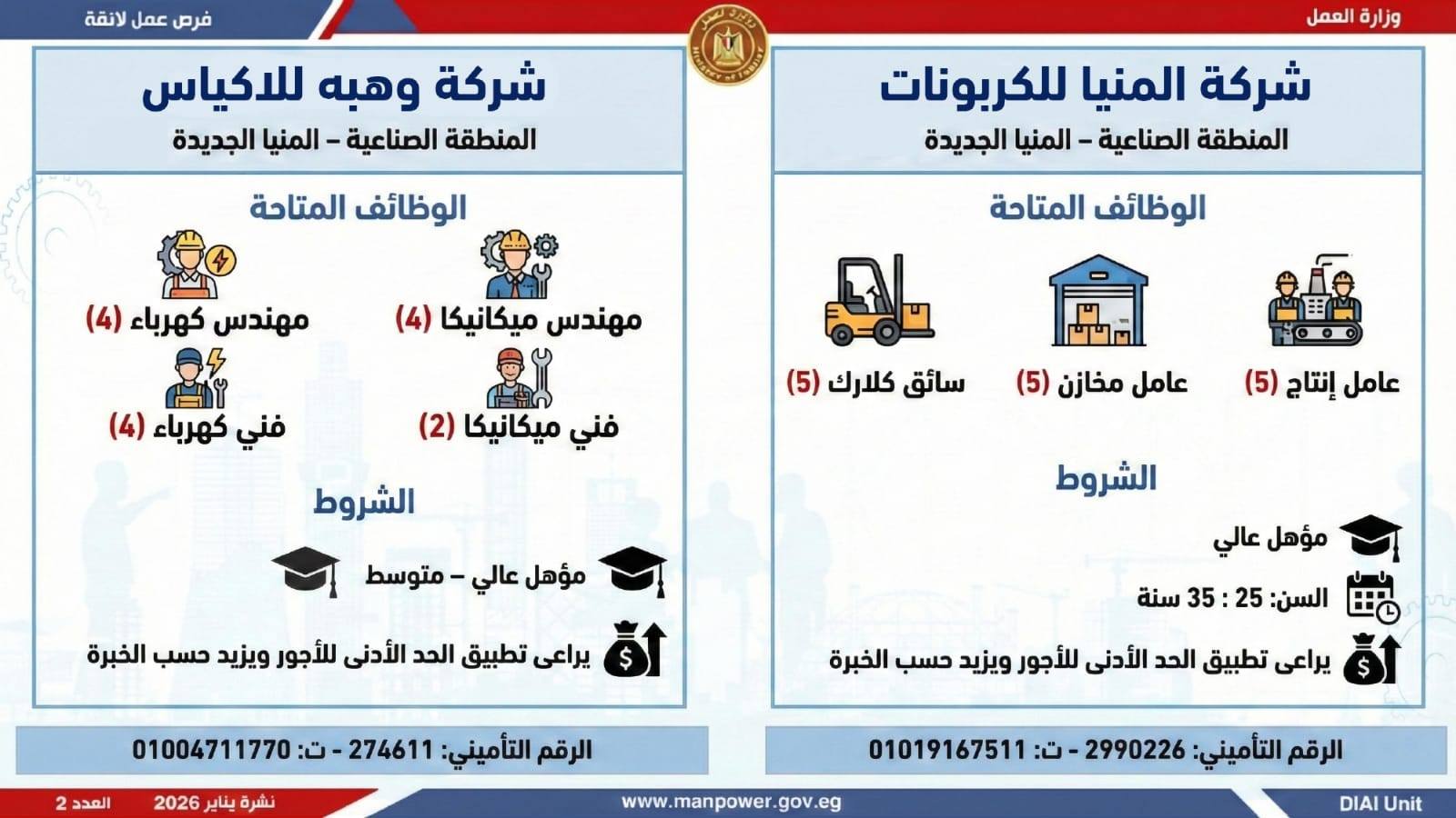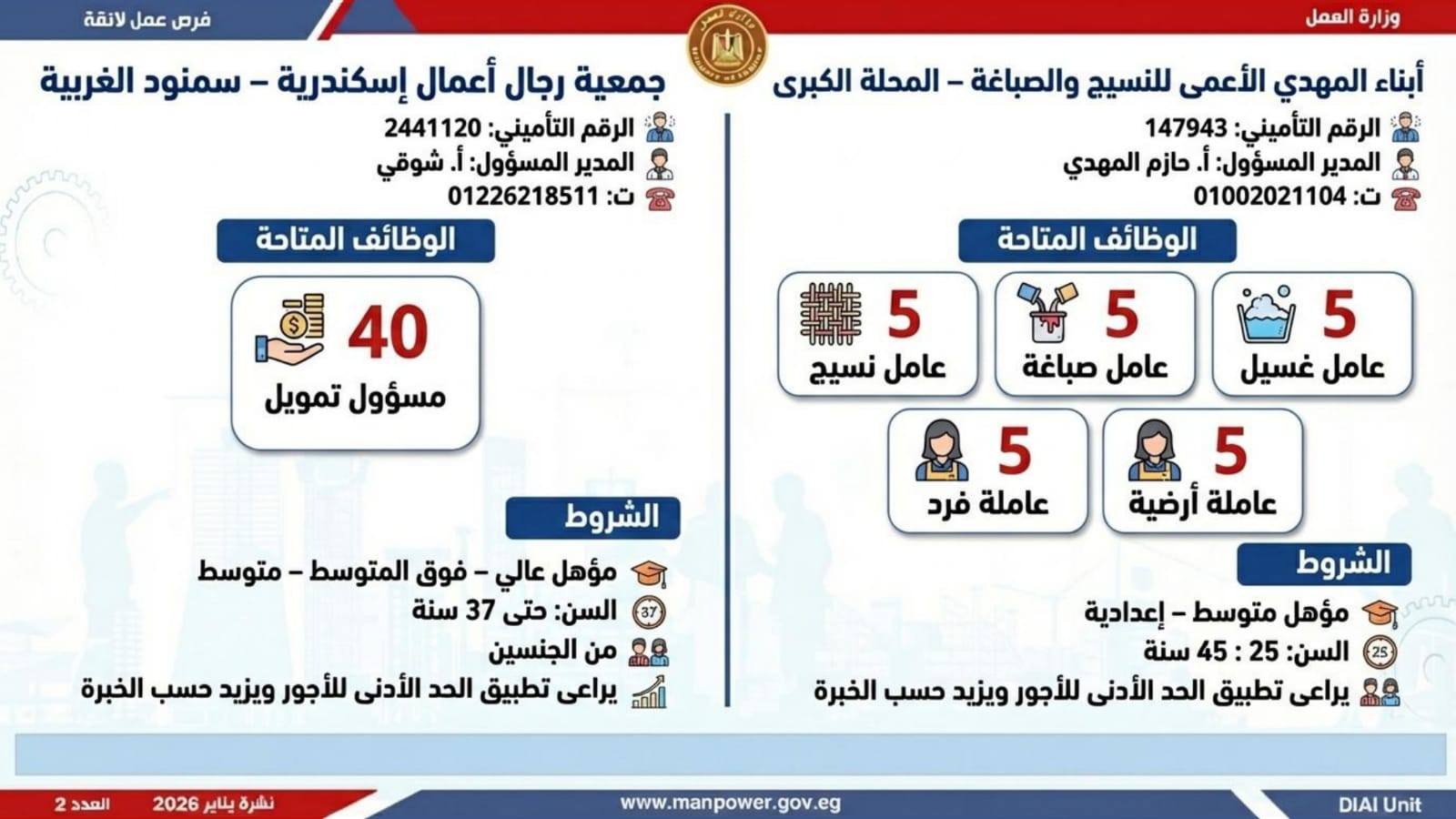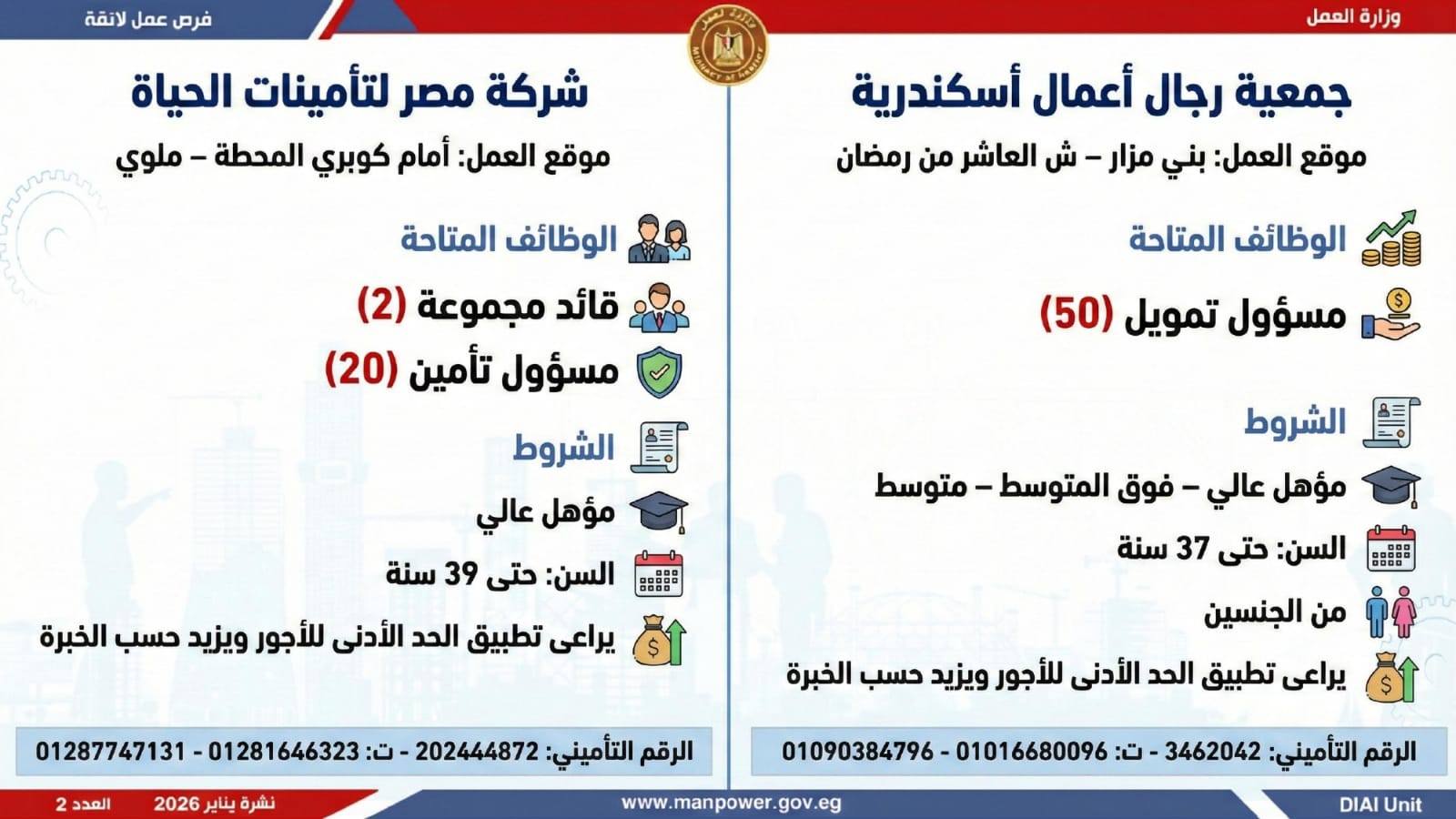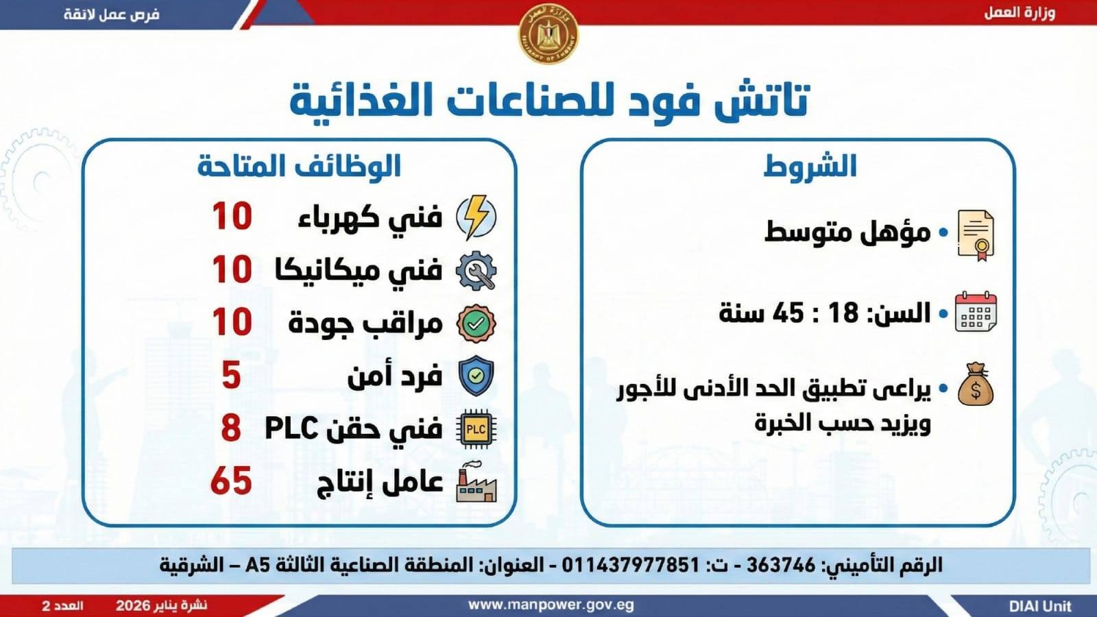 وتغطي النشرة الحالية فرص عمل بمحافظات: القاهرة، الشرقية، الإسكندرية، الغربية، الإسماعيلية، دمياط، المنيا، أسيوط، بني سويف، والمنوفية، وتشمل تخصصات متعددة، من بينها: أخصائيو تسويق وموارد بشرية، مهندسو اتصالات وكهرباء، مشرفو ميكانيكا وتحكم كهربائي،مديرو صيانة، محاسبون، مشرفو مواقع وتنجيد، "ليدي جارد – إناث"، مشرفو إنتاج، شيفات، أخصائيو مشتريات، بائعون، مقدمو طلبات، أمناء مخازن، مندوبو مبيعات، مراقبو جودة، فنيون بمختلف التخصصات، سائقون برخص أولى وثانية وثالثة، أفراد أمن، إلى جانب فرص في قطاع الفندقة والمطاعم، وأعمال إنتاج ونظافة وتخصصات أخرى.