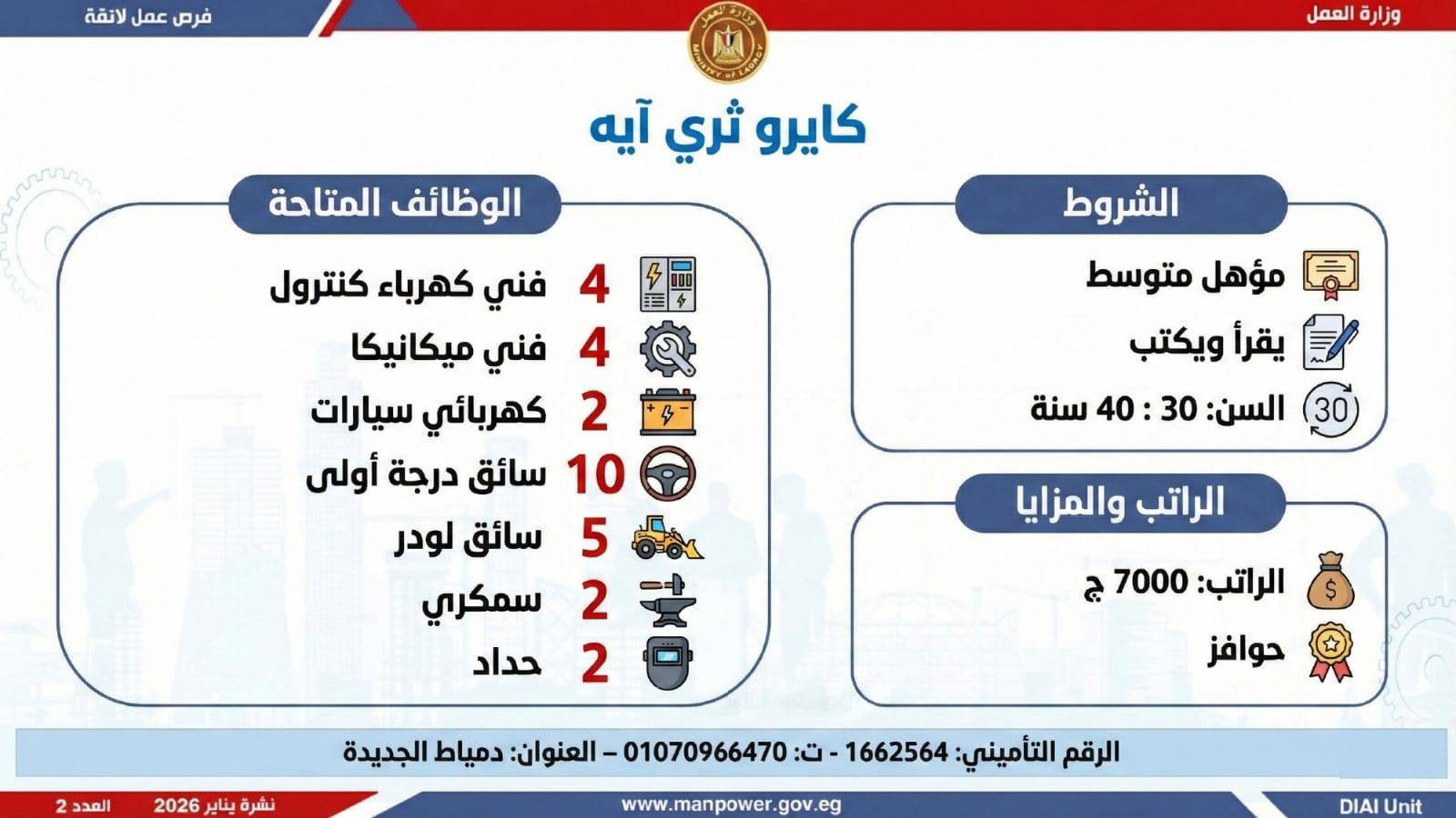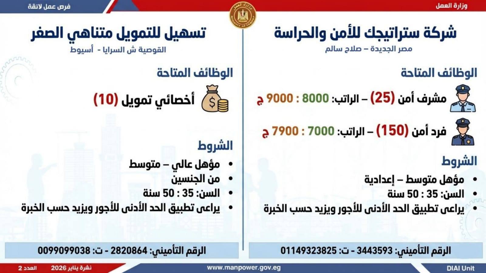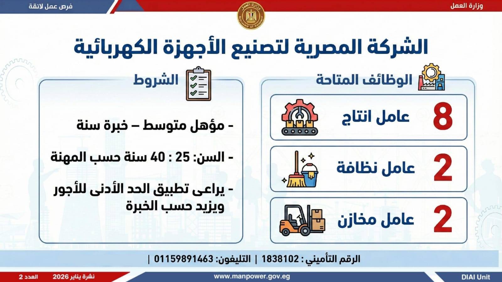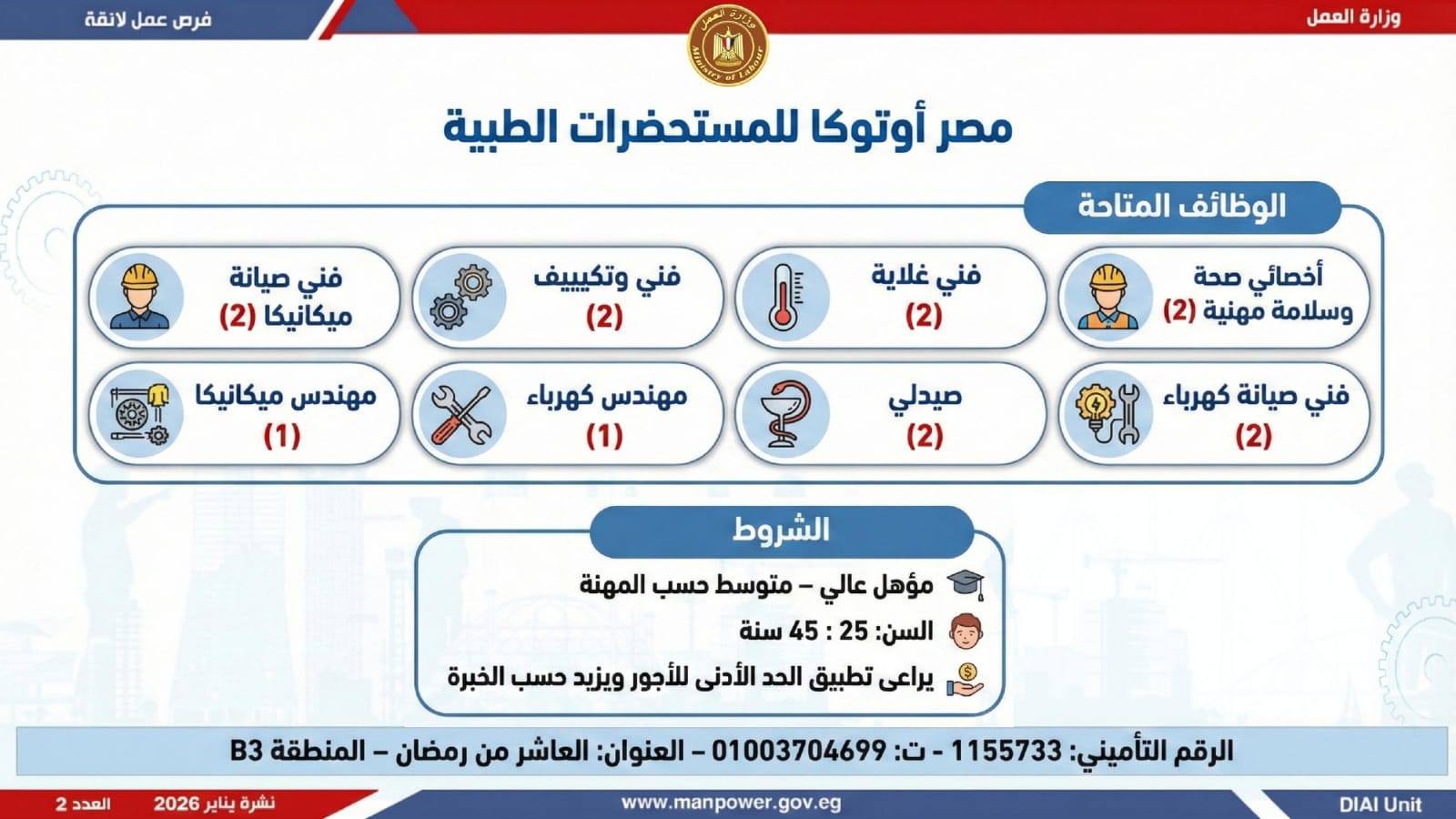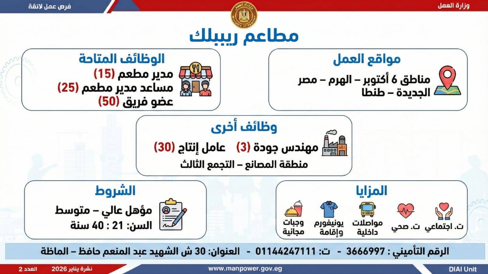 وتغطي النشرة الحالية فرص عمل بمحافظات: القاهرة، الشرقية، الإسكندرية، الغربية، الإسماعيلية، دمياط، المنيا، أسيوط، بني سويف، والمنوفية، وتشمل تخصصات متعددة، من بينها: أخصائيو تسويق وموارد بشرية، مهندسو اتصالات وكهرباء، مشرفو ميكانيكا وتحكم كهربائي،مديرو صيانة، محاسبون، مشرفو مواقع وتنجيد، "ليدي جارد – إناث"، مشرفو إنتاج، شيفات، أخصائيو مشتريات، بائعون، مقدمو طلبات، أمناء مخازن، مندوبو مبيعات، مراقبو جودة، فنيون بمختلف التخصصات، سائقون برخص أولى وثانية وثالثة، أفراد أمن، إلى جانب فرص في قطاع الفندقة والمطاعم، وأعمال إنتاج ونظافة وتخصصات أخرى.