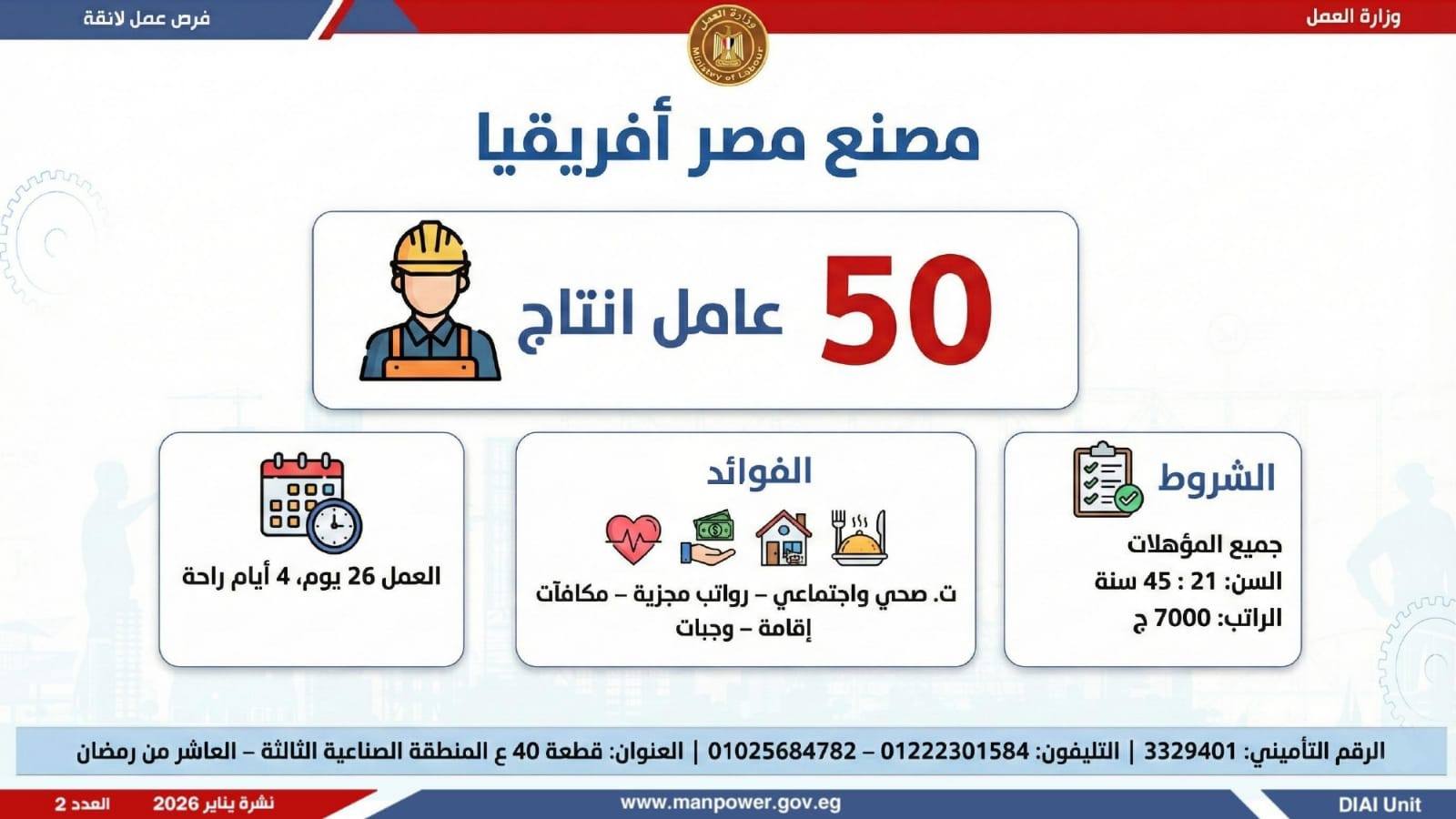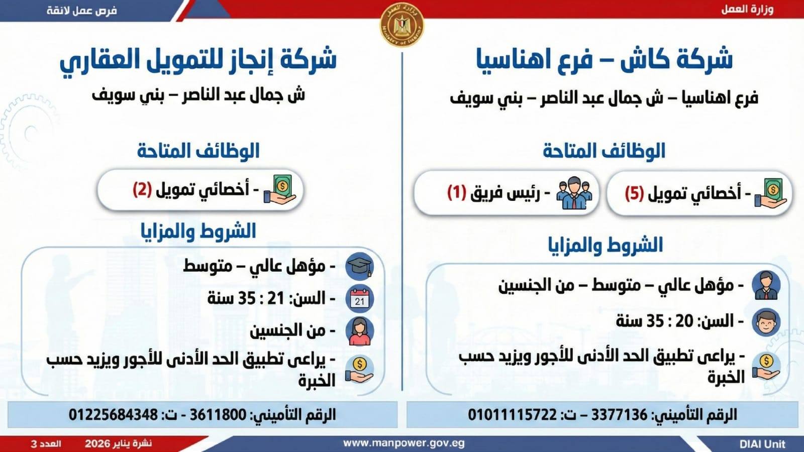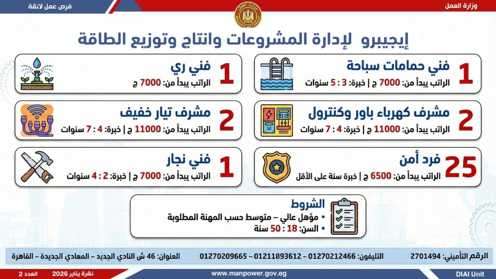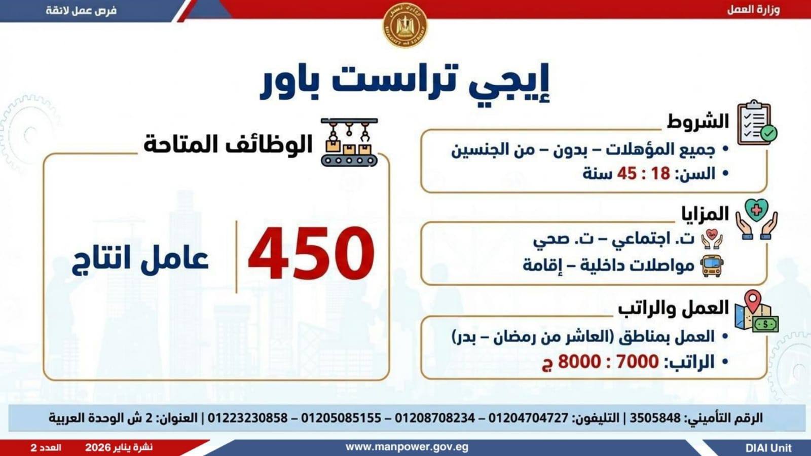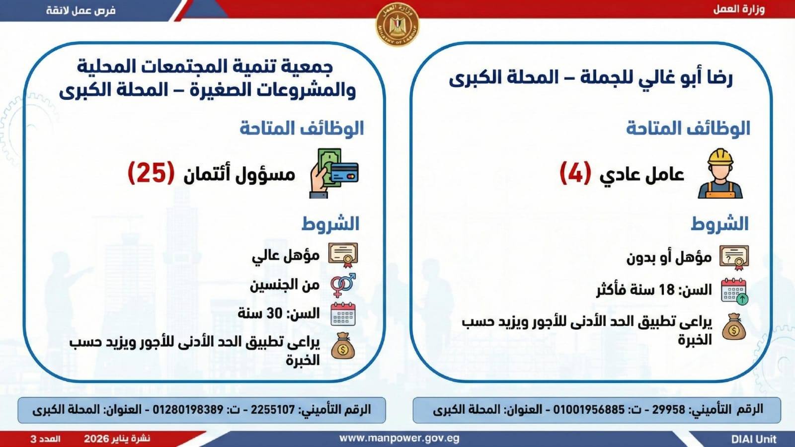 وتغطي النشرة الحالية فرص عمل بمحافظات: القاهرة، الشرقية، الإسكندرية، الغربية، الإسماعيلية، دمياط، المنيا، أسيوط، بني سويف، والمنوفية، وتشمل تخصصات متعددة، من بينها: أخصائيو تسويق وموارد بشرية، مهندسو اتصالات وكهرباء، مشرفو ميكانيكا وتحكم كهربائي،مديرو صيانة، محاسبون، مشرفو مواقع وتنجيد، "ليدي جارد – إناث"، مشرفو إنتاج، شيفات، أخصائيو مشتريات، بائعون، مقدمو طلبات، أمناء مخازن، مندوبو مبيعات، مراقبو جودة، فنيون بمختلف التخصصات، سائقون برخص أولى وثانية وثالثة، أفراد أمن، إلى جانب فرص في قطاع الفندقة والمطاعم، وأعمال إنتاج ونظافة وتخصصات أخرى.