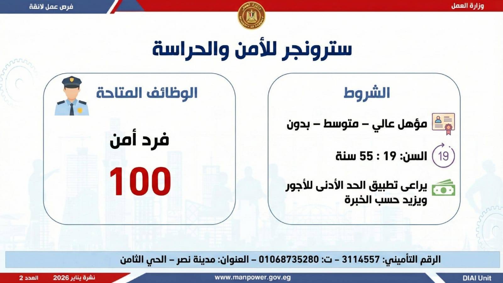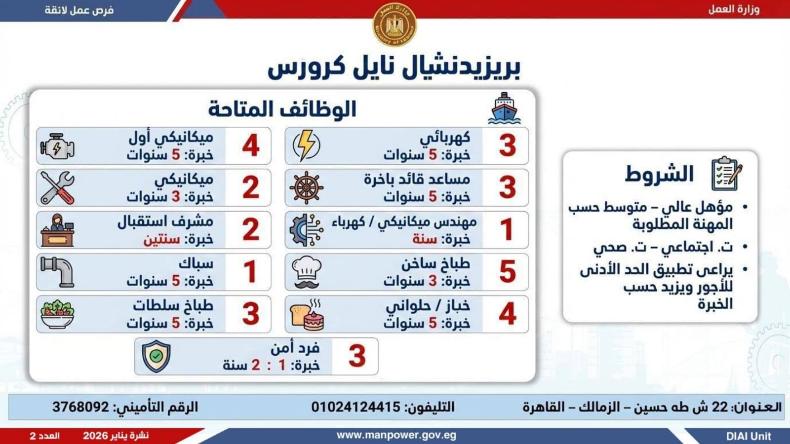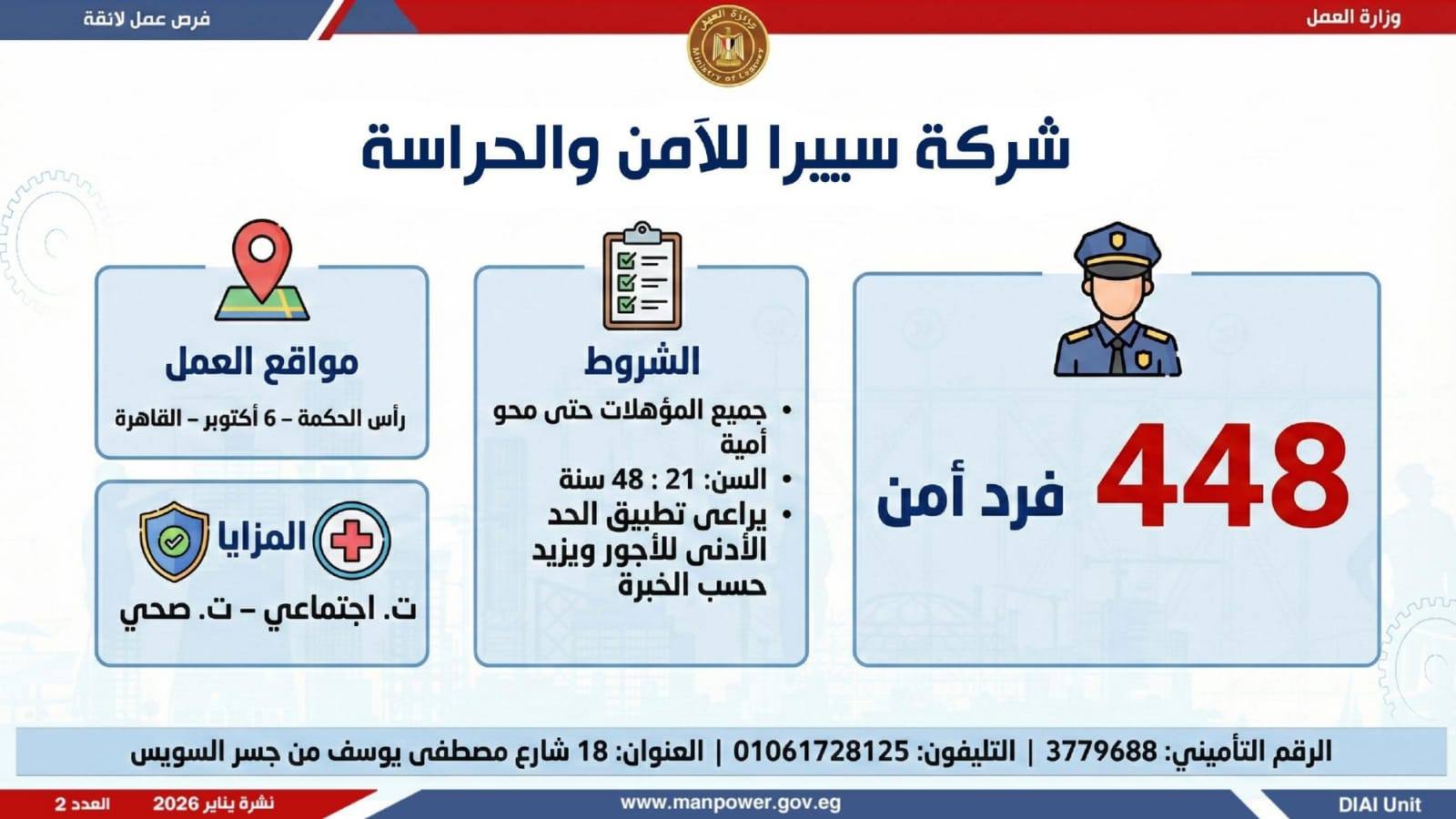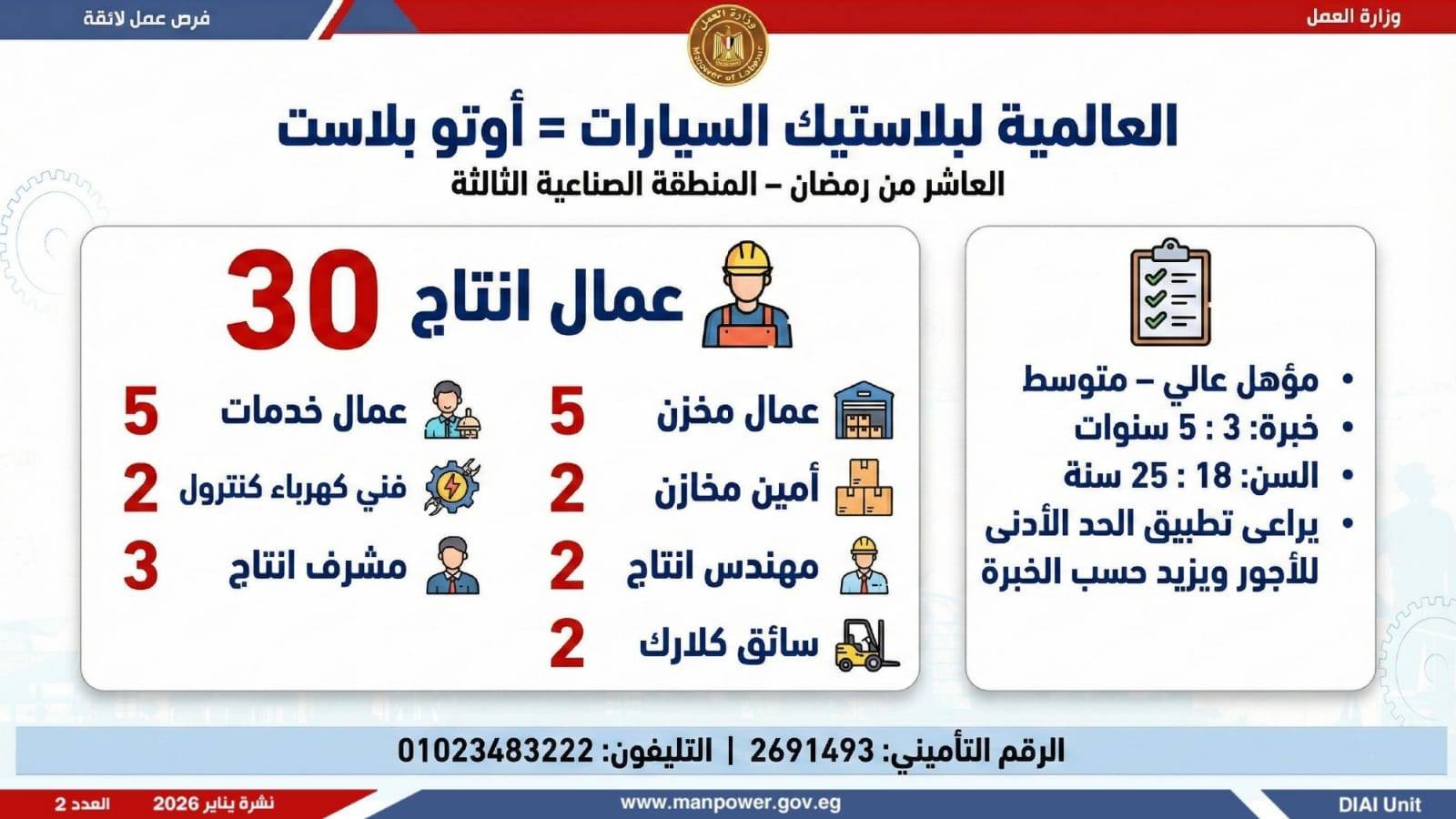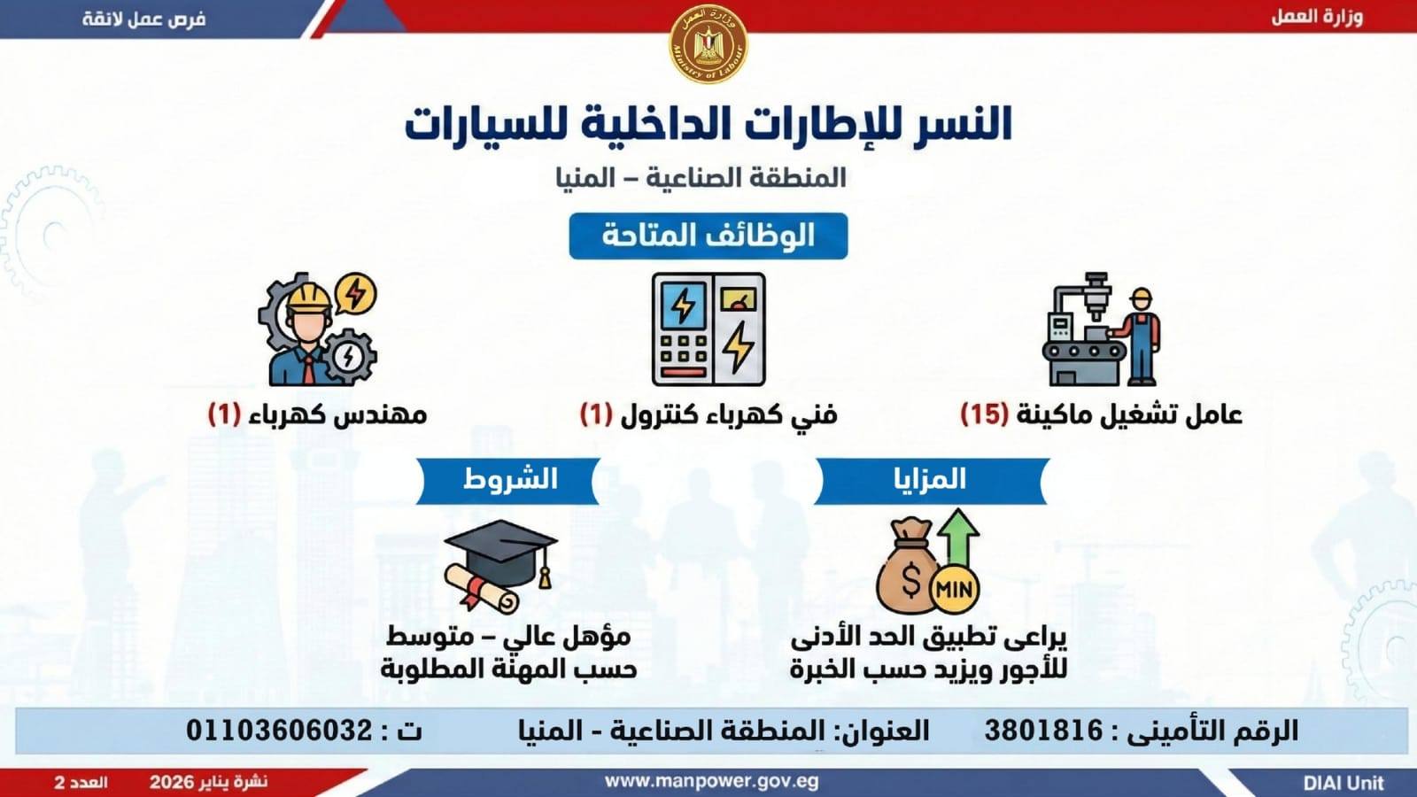 وتغطي النشرة الحالية فرص عمل بمحافظات: القاهرة، الشرقية، الإسكندرية، الغربية، الإسماعيلية، دمياط، المنيا، أسيوط، بني سويف، والمنوفية، وتشمل تخصصات متعددة، من بينها: أخصائيو تسويق وموارد بشرية، مهندسو اتصالات وكهرباء، مشرفو ميكانيكا وتحكم كهربائي،مديرو صيانة، محاسبون، مشرفو مواقع وتنجيد، "ليدي جارد – إناث"، مشرفو إنتاج، شيفات، أخصائيو مشتريات، بائعون، مقدمو طلبات، أمناء مخازن، مندوبو مبيعات، مراقبو جودة، فنيون بمختلف التخصصات، سائقون برخص أولى وثانية وثالثة، أفراد أمن، إلى جانب فرص في قطاع الفندقة والمطاعم، وأعمال إنتاج ونظافة وتخصصات أخرى.
