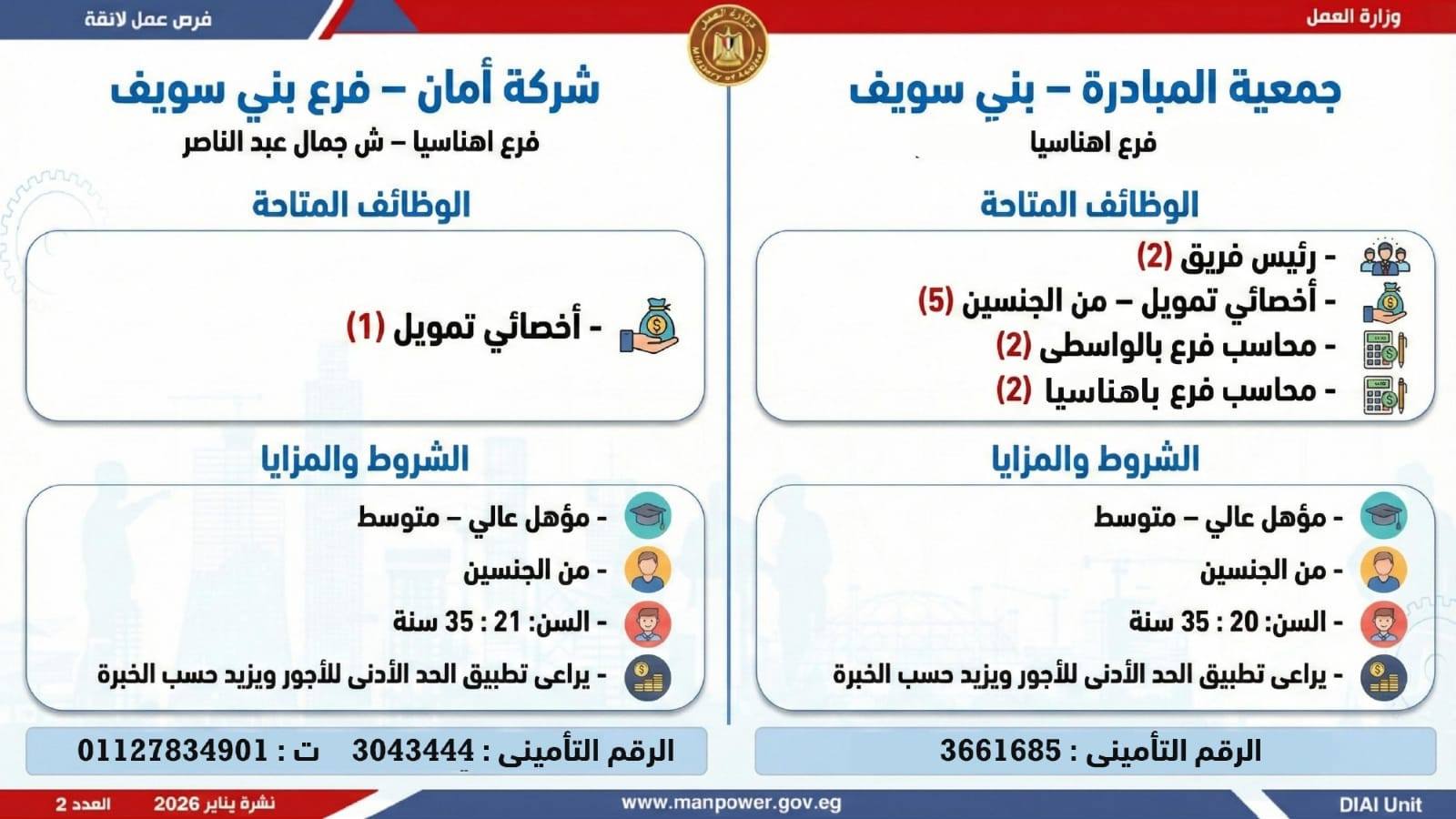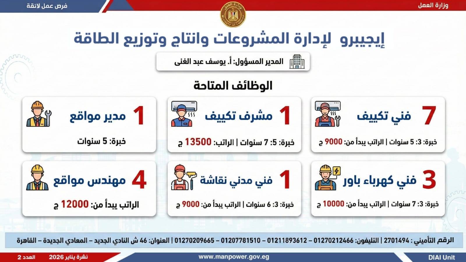 أعلن محمد جبران وزير العمل، اليوم الثلاثاء، عن إصدار نشرة التوظيف نصف الشهرية، والتي تتضمن توفير 6499 فرصة عمل جديدة بالتعاون مع 63 شركة من شركات القطاع الخاص، موزعة على 10 محافظات، مع إتاحة التقديم خلال شهري يناير وفبراير 2026، وذلك في إطار التزام الدولة بمواجهة البطالة، ودعم جهود التشغيل، وتعزيز الشراكة مع القطاع الخاص.