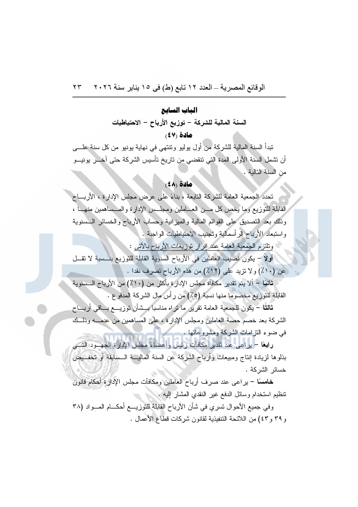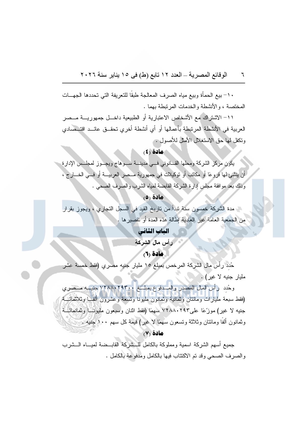 نشرت الوقائع المصرية، في العدد 12 تابع "ط"، الصادر في 15 يناير سنة 2026، قرار الشركة القابضة لمياه الشرب والصرف الصحى "ش.م.ق.م"، بشأن إعتماد النظام الأساسي المعدل لشركة الصرف الصحي بسوهاج.