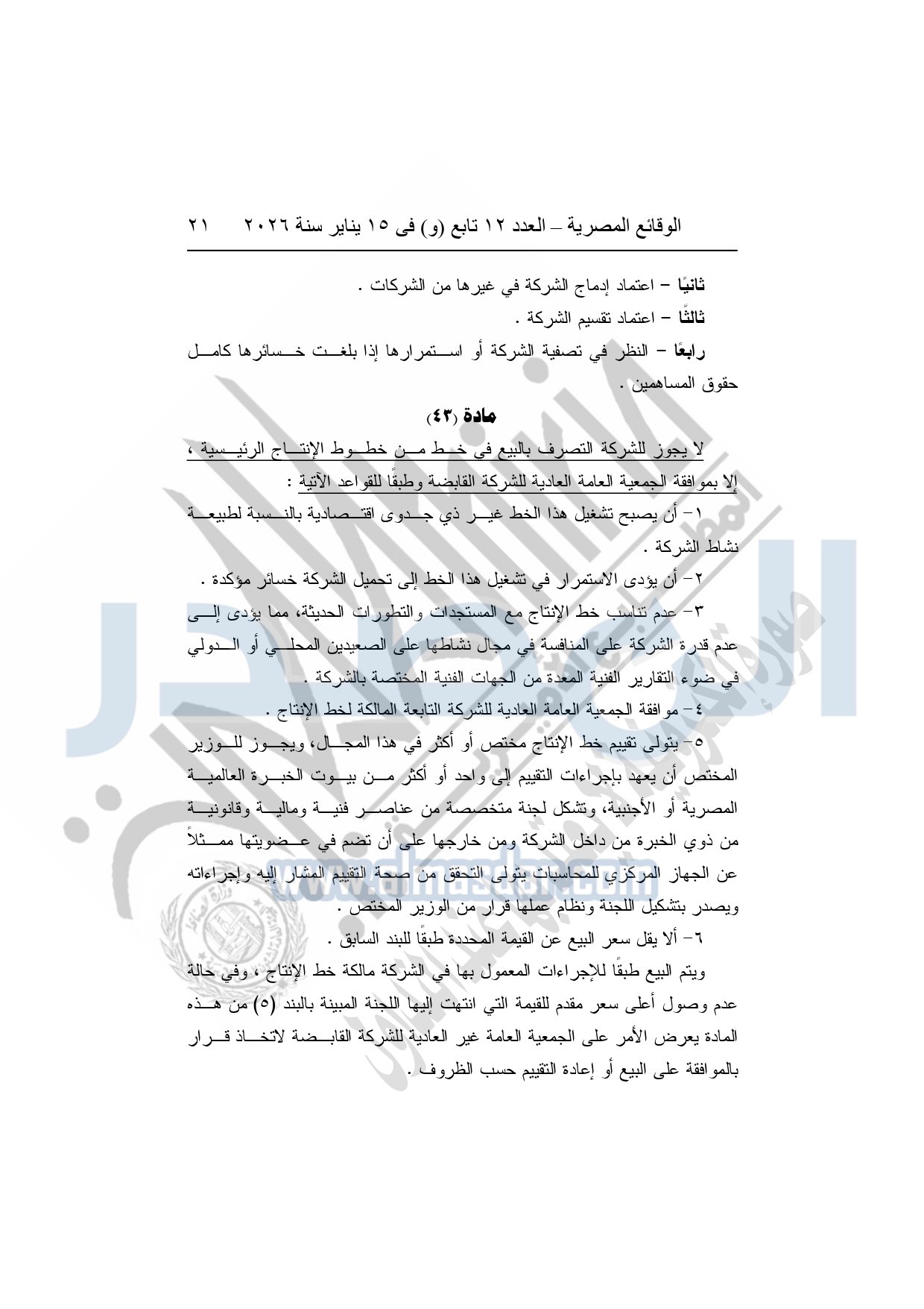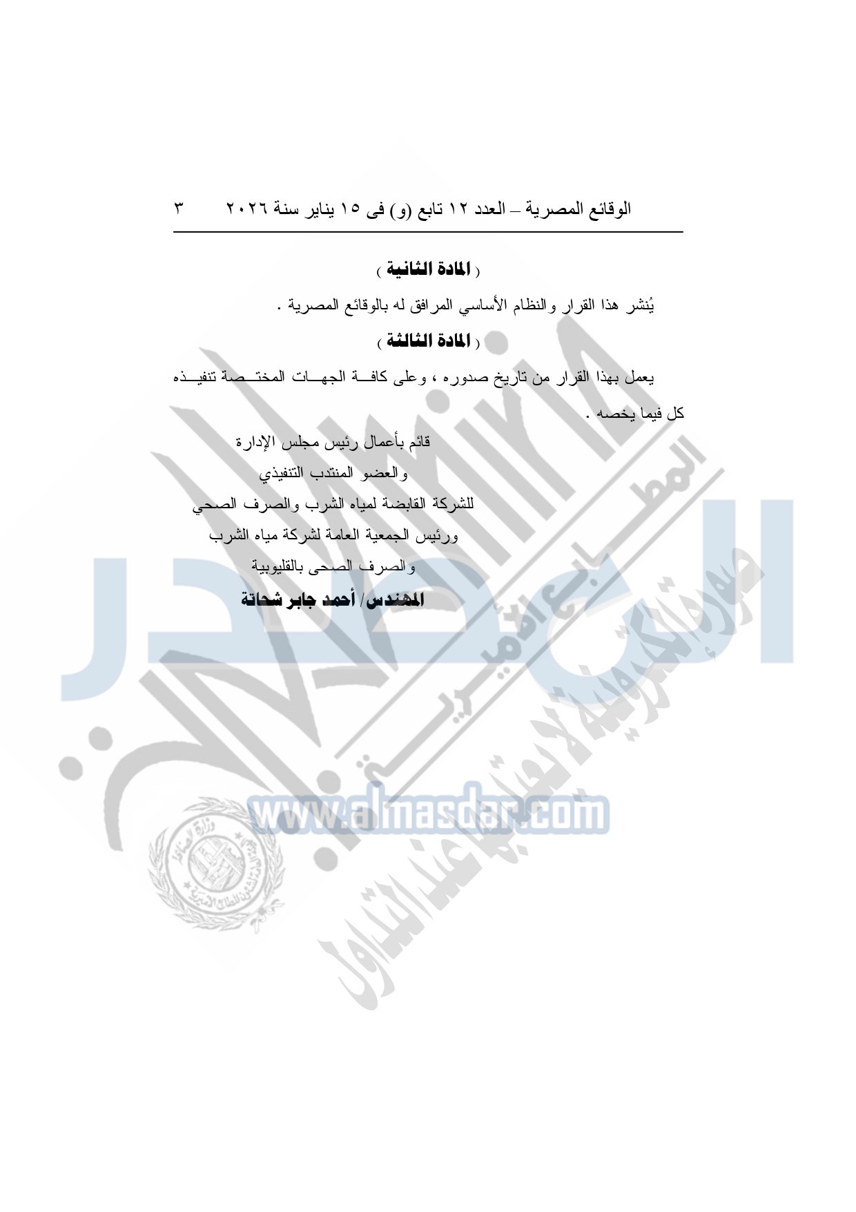 نشرت الوقائع المصرية، في العدد 12 تابع "و"، الصادر في 15 يناير سنة 2026، قرار الشركة القابضة لمياه الشرب والصرف الصحى "ش.م.ق.م"، بشأن إعتماد النظام الأساسي المعدل لشركة الصرف الصحي بالقليوبية.