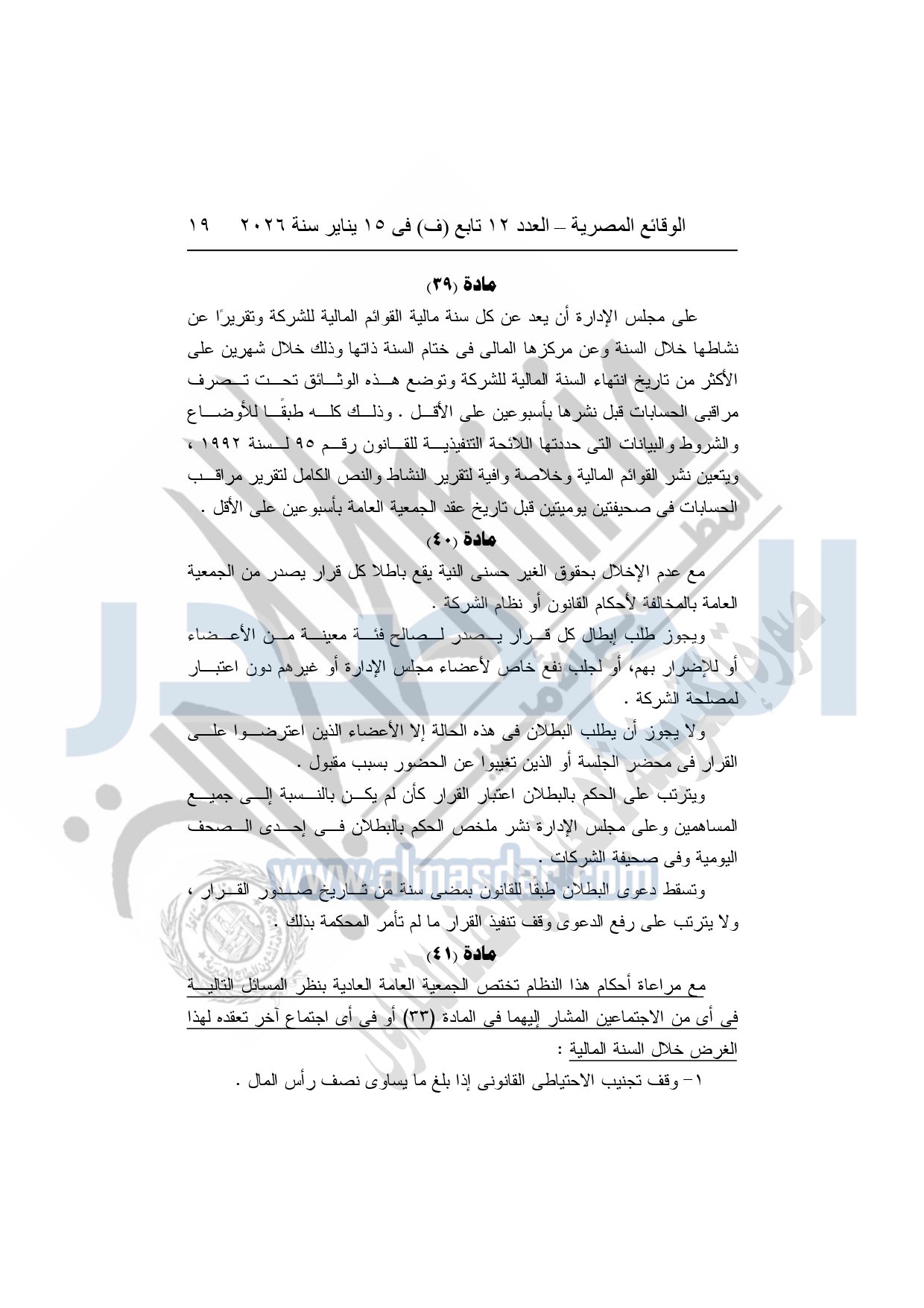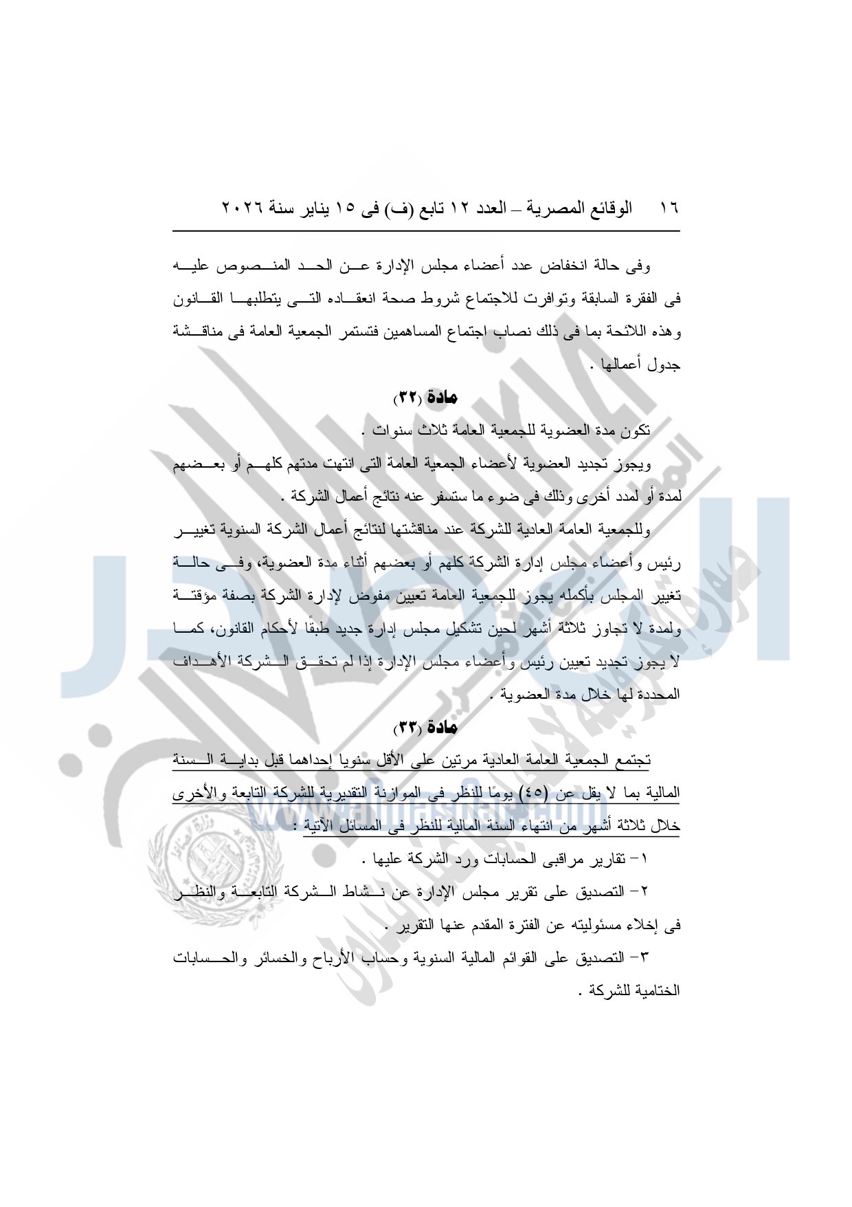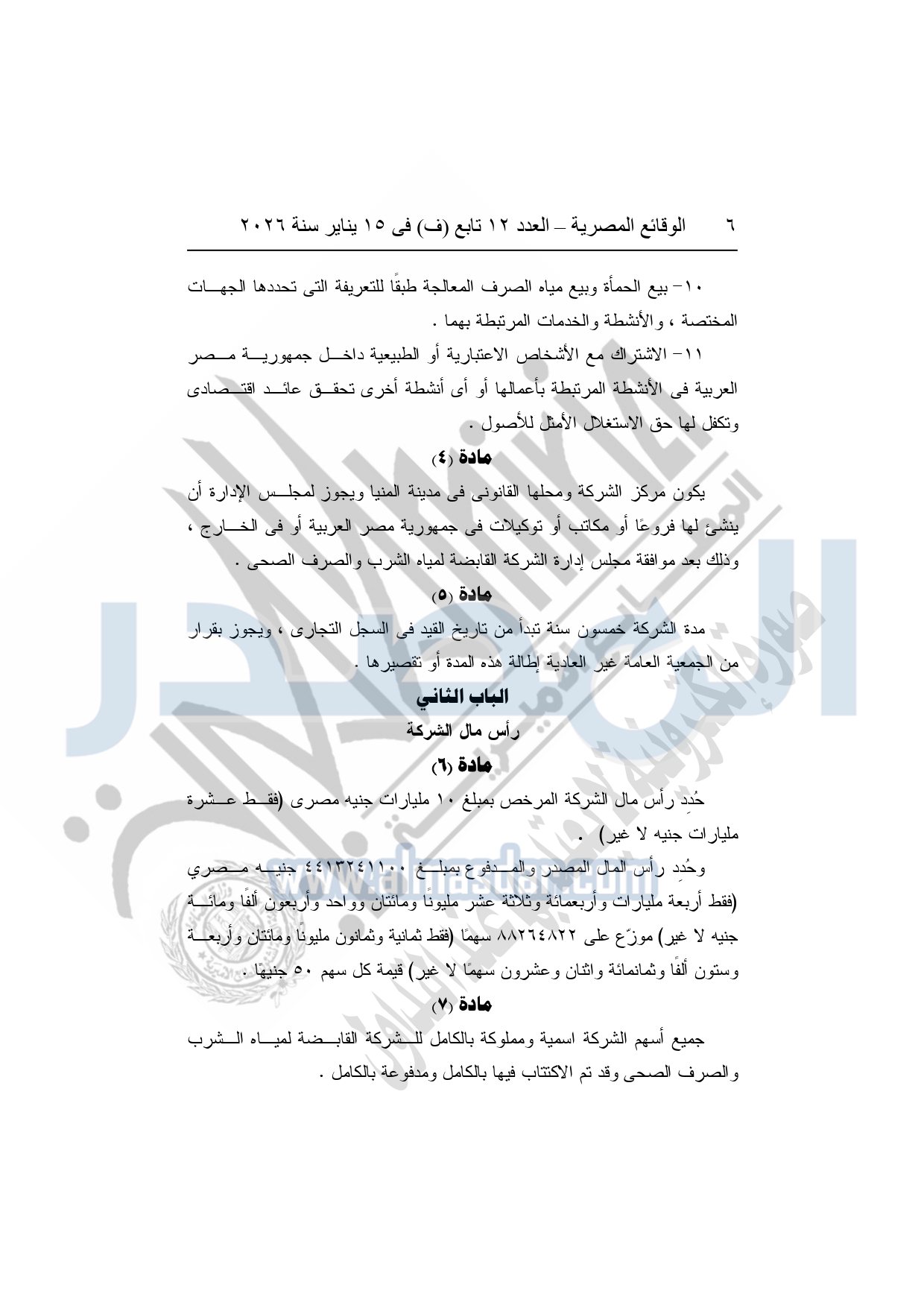 نشرت الوقائع المصرية، في العدد 12 تابع "ف"، الصادر في 15 يناير سنة 2026، قرار الشركة القابضة لمياه الشرب والصرف الصحى "ش.م.ق.م"، بشأن إعتماد النظام الأساسي المعدل لشركة الصرف الصحي بالمنيا.