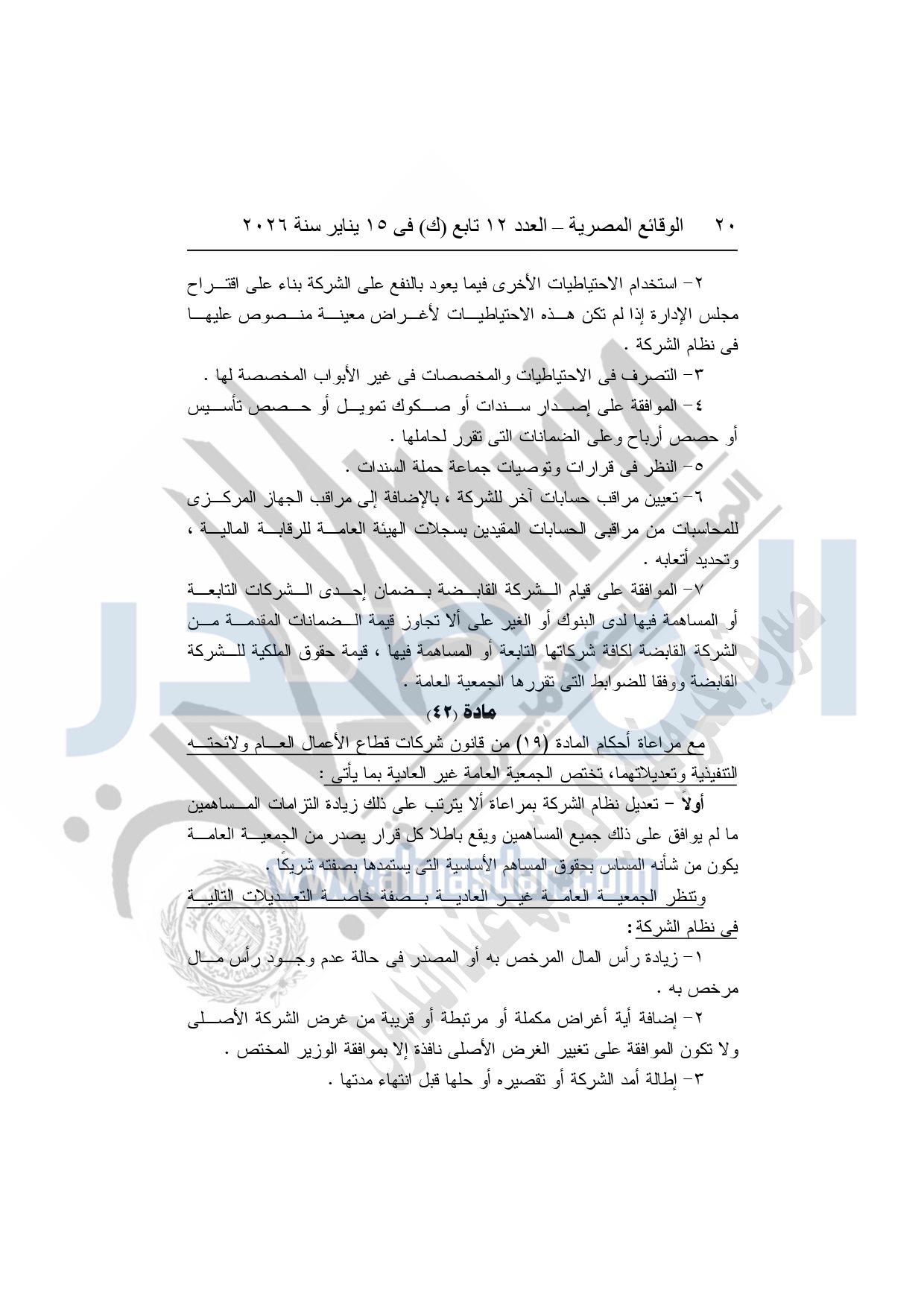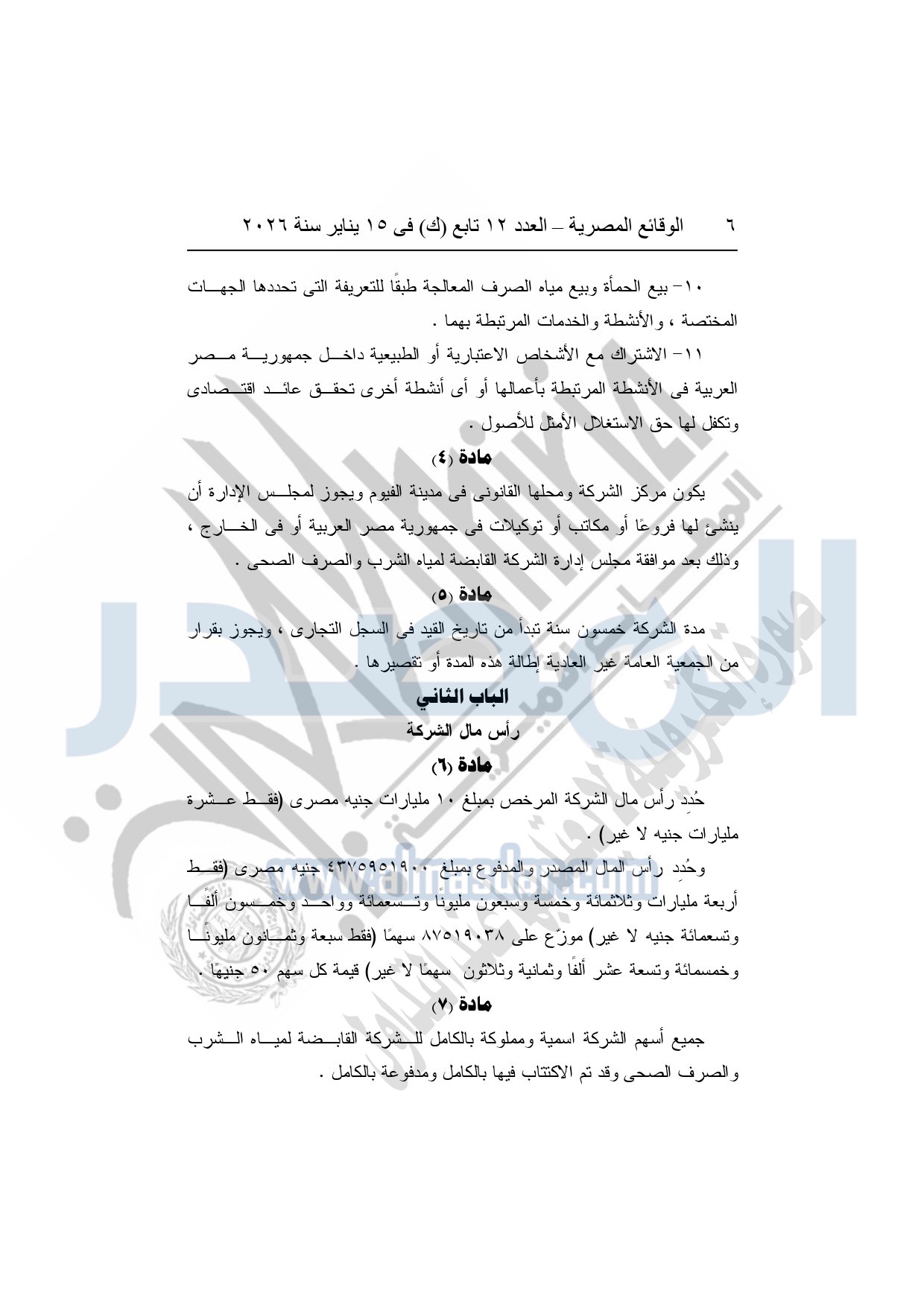 نشرت الوقائع المصرية، في العدد 12 تابع "ك"، الصادر في 15 يناير سنة 2026، قرار الشركة القابضة لمياه الشرب والصرف الصحى "ش.م.ق.م"، بشأن إعتماد النظام الأساسي المعدل لشركة الصرف الصحي بالفيوم.