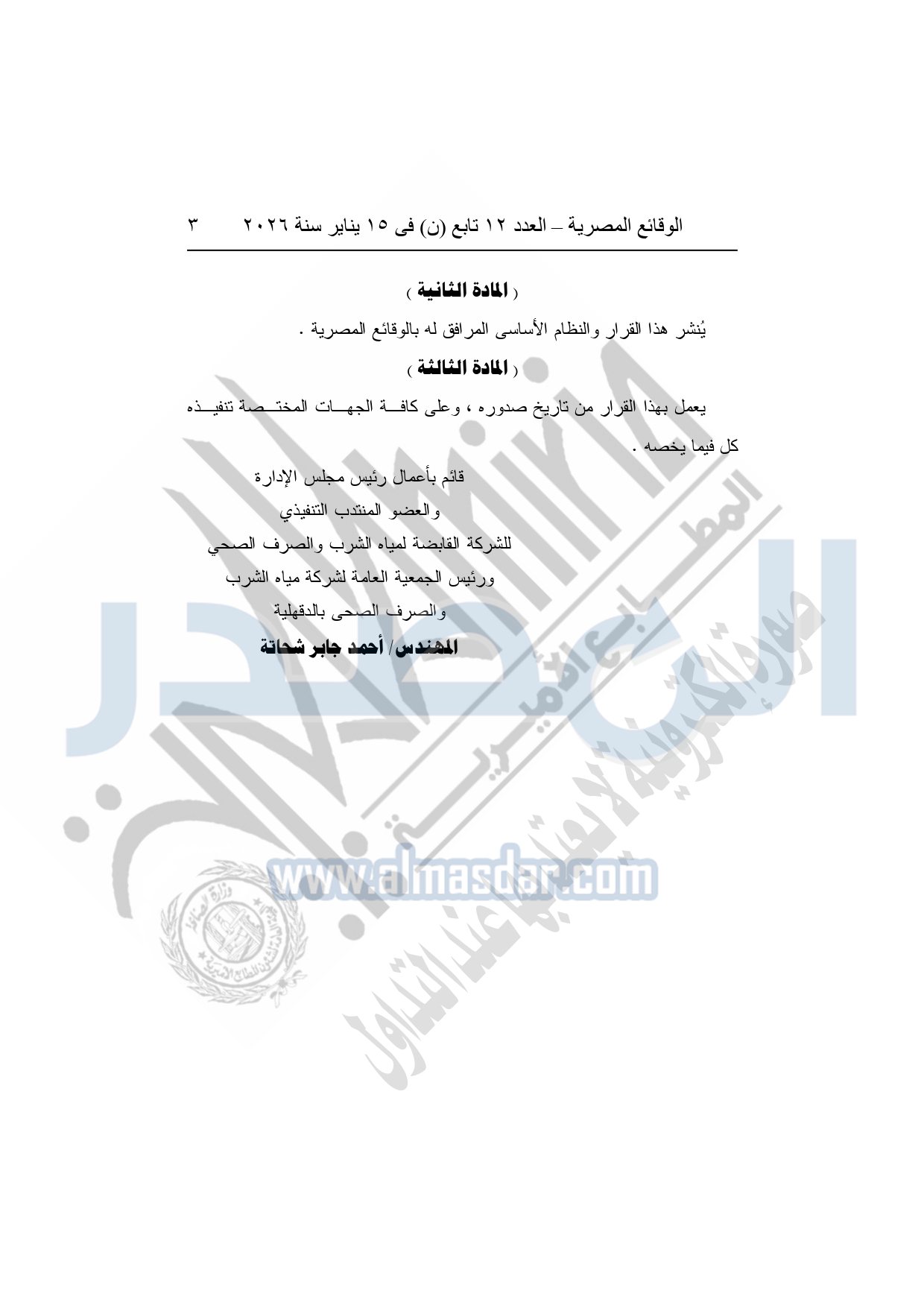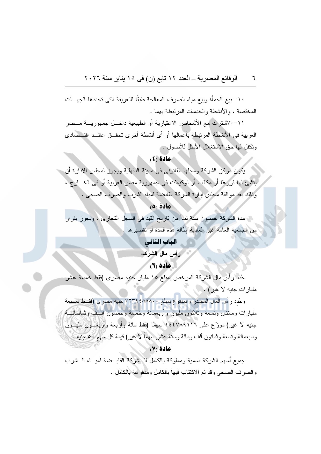 نشرت الوقائع المصرية، في العدد 12 تابع "ن"، الصادر في 15 يناير سنة 2026، قرار الشركة القابضة لمياه الشرب والصرف الصحى "ش.م.ق.م"، بشأن إعتماد النظام الأساسي المعدل لشركة الصرف الصحي بالدقهلية.