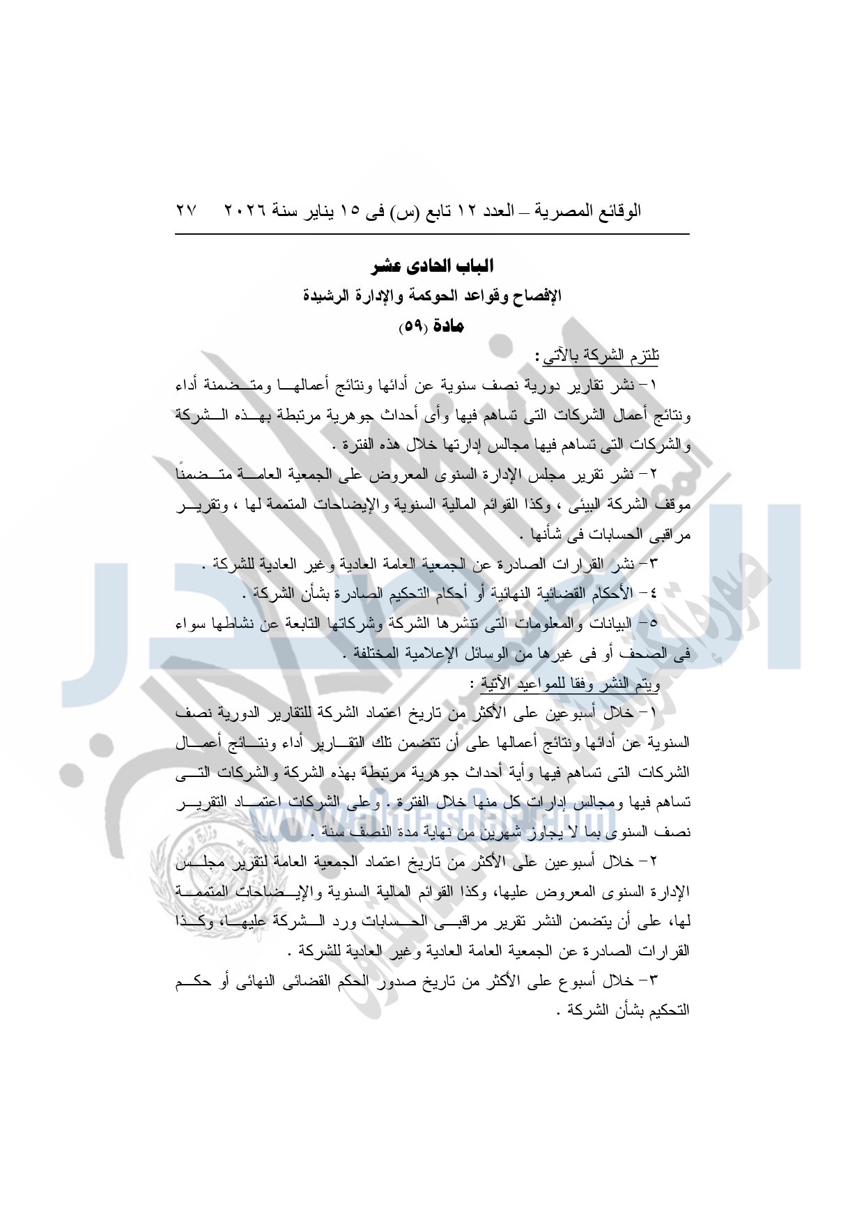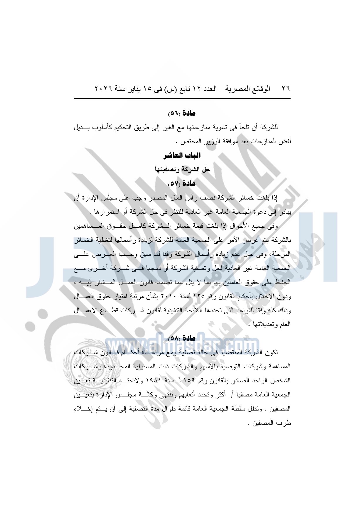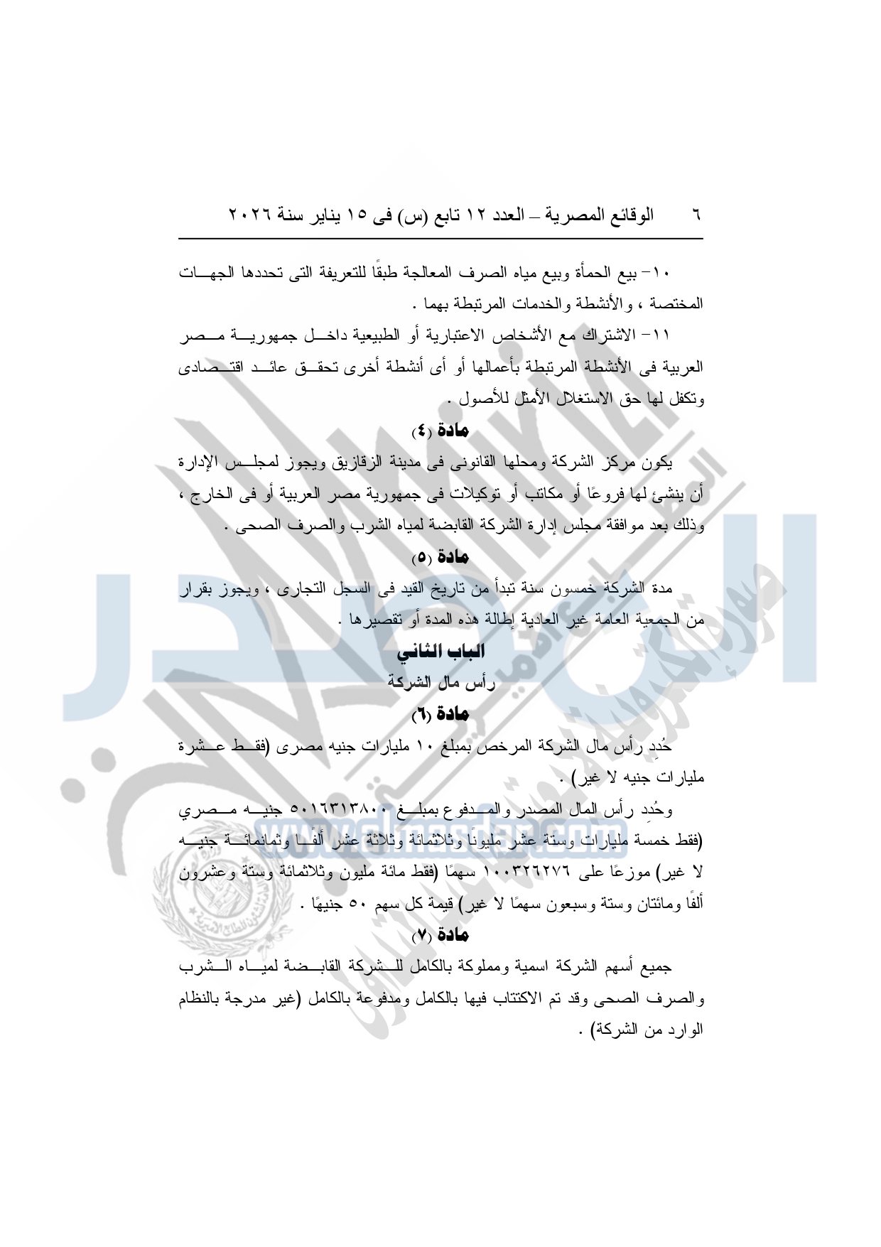 نشرت الوقائع المصرية، في العدد 12 تابع "س"، الصادر في 15 يناير سنة 2026، قرار الشركة القابضة لمياه الشرب والصرف الصحى "ش.م.ق.م"، بشأن إعتماد النظام الأساسي المعد للشركة مياه الشرب والصرف الصحي بالشرقية.