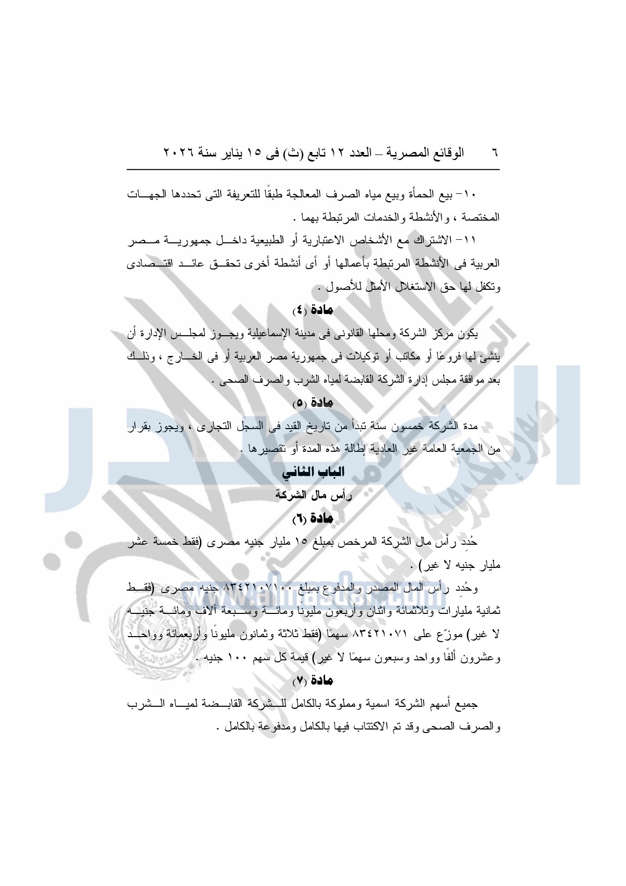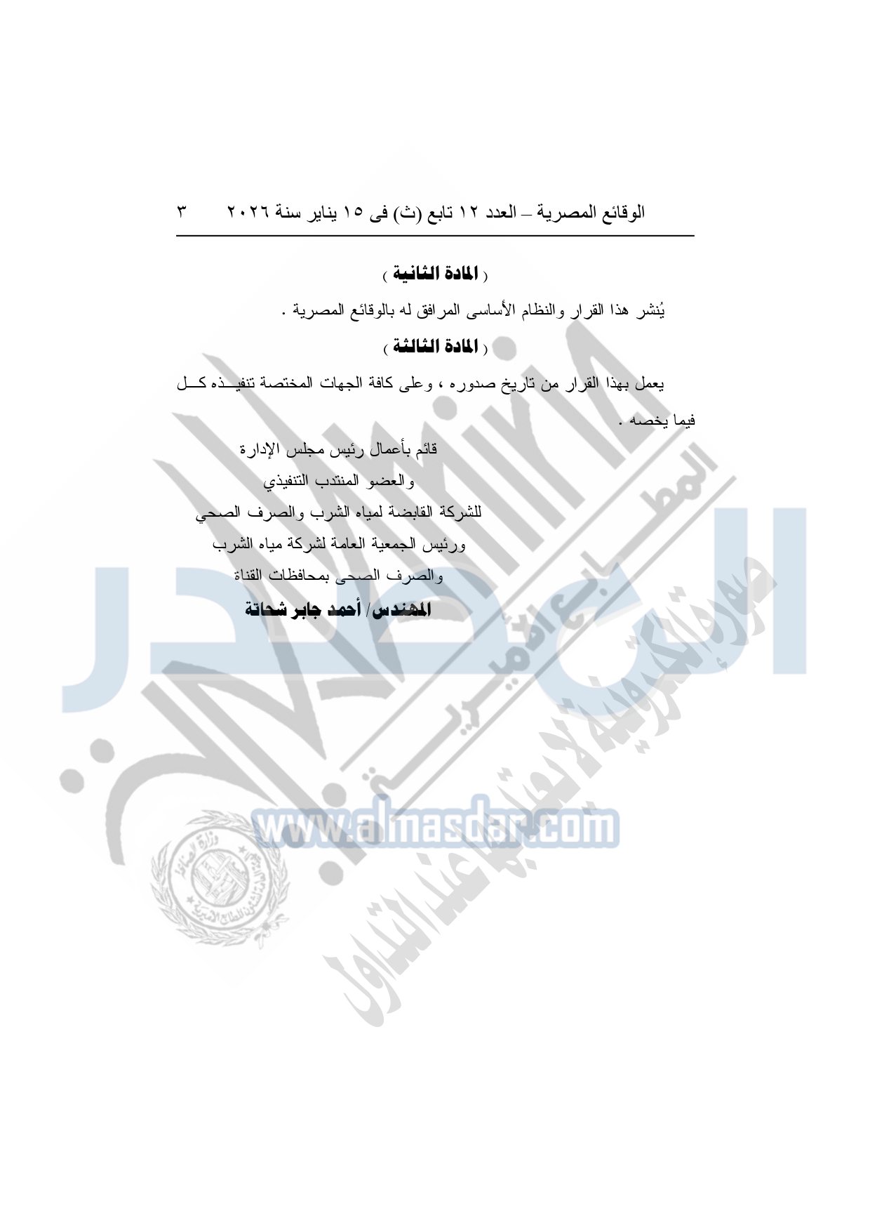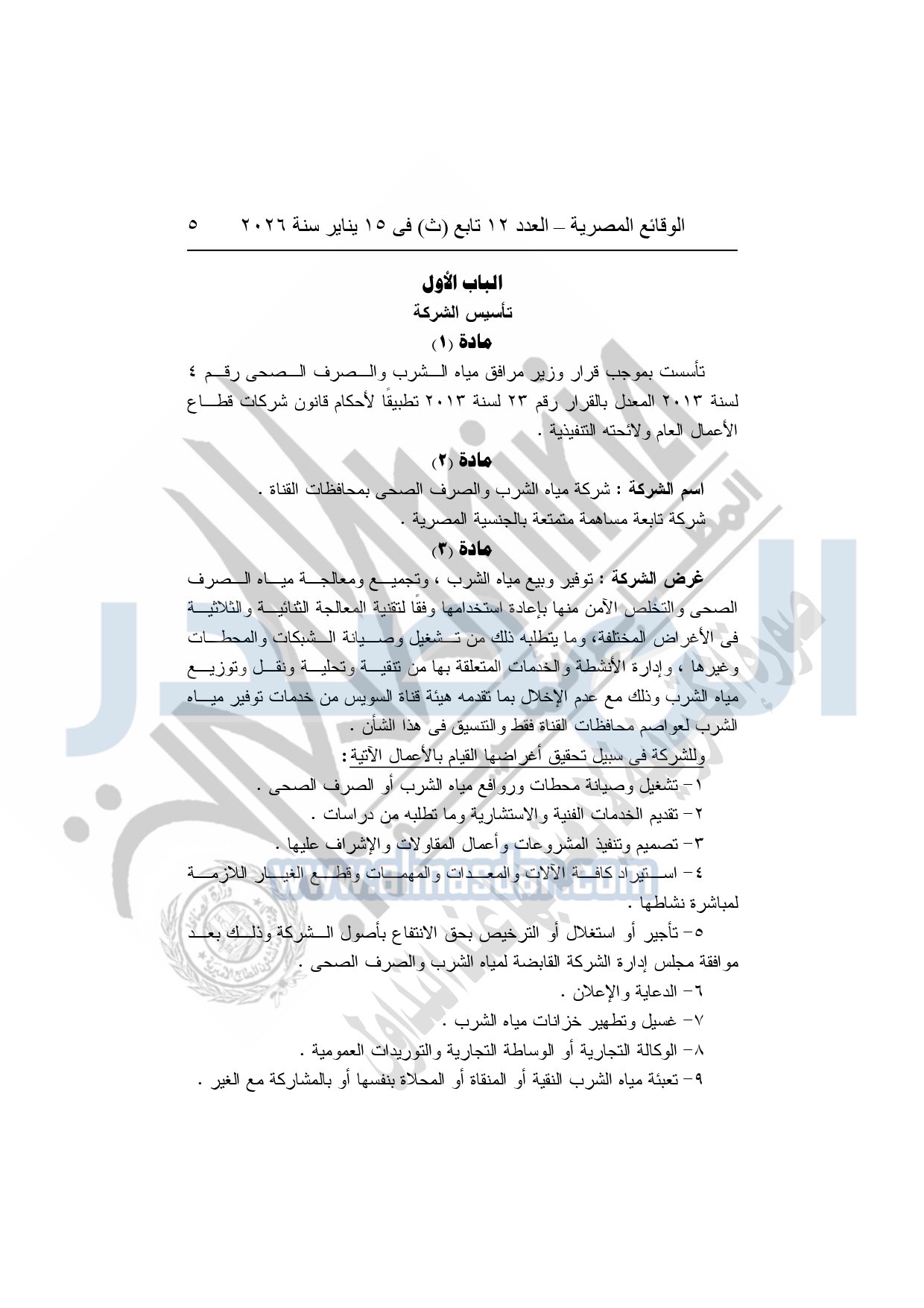 نشرت الوقائع المصرية، في العدد 12 تابع "ث"، الصادر في 15 يناير سنة 2026، قرار الشركة القابضة لمياه الشرب والصرف الصحى "ش.م.ق.م"، بشأن إعتماد النظام الأساسي المعدل لشركة مياه الشرب والصرف الصحي بمحافظات القناة.