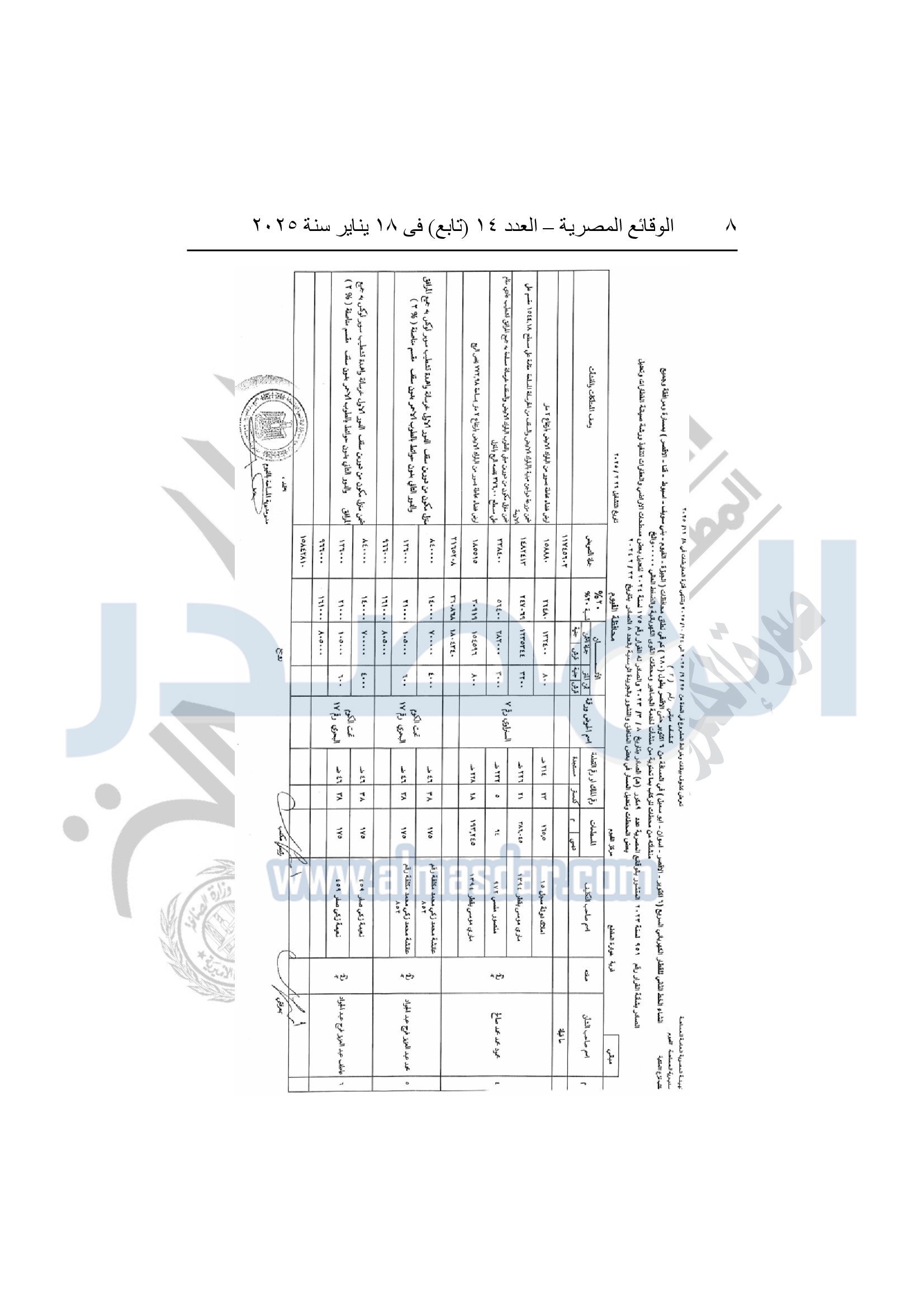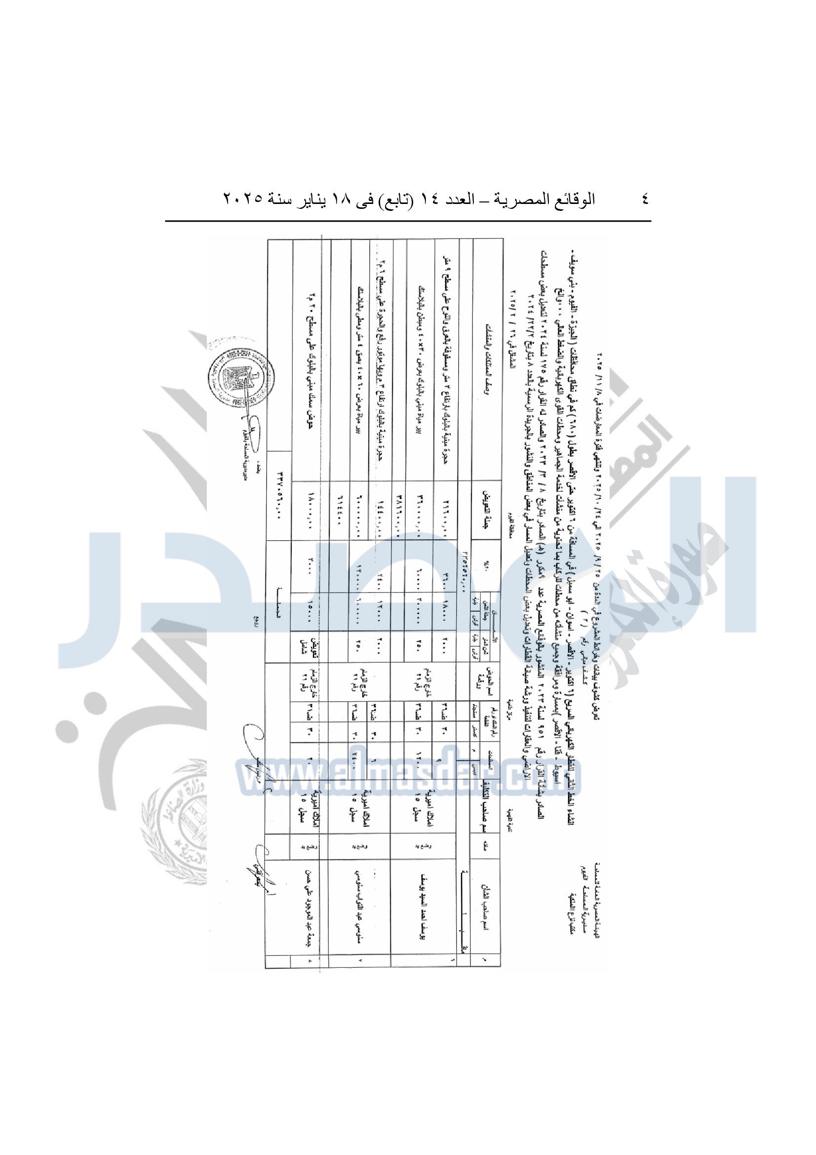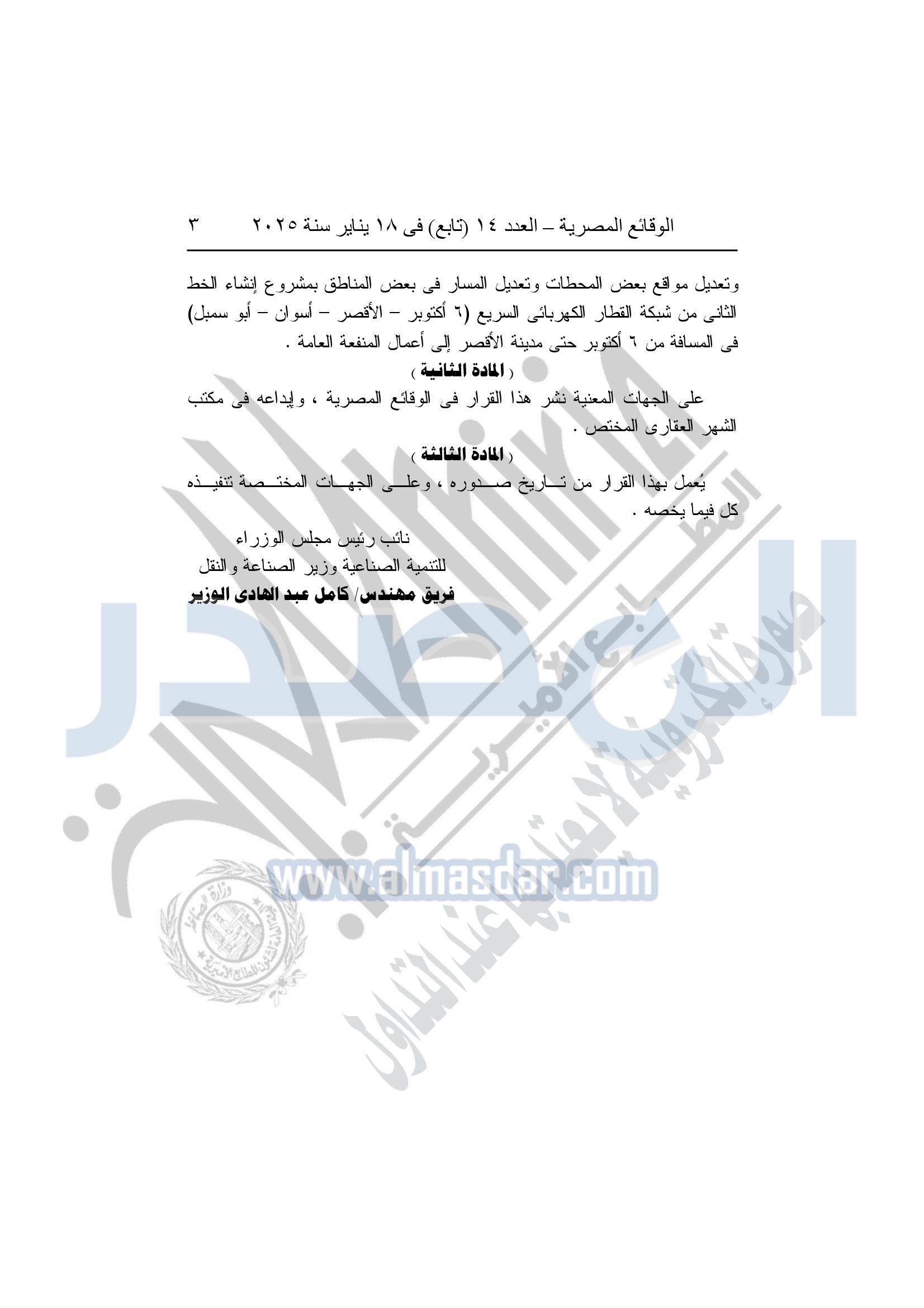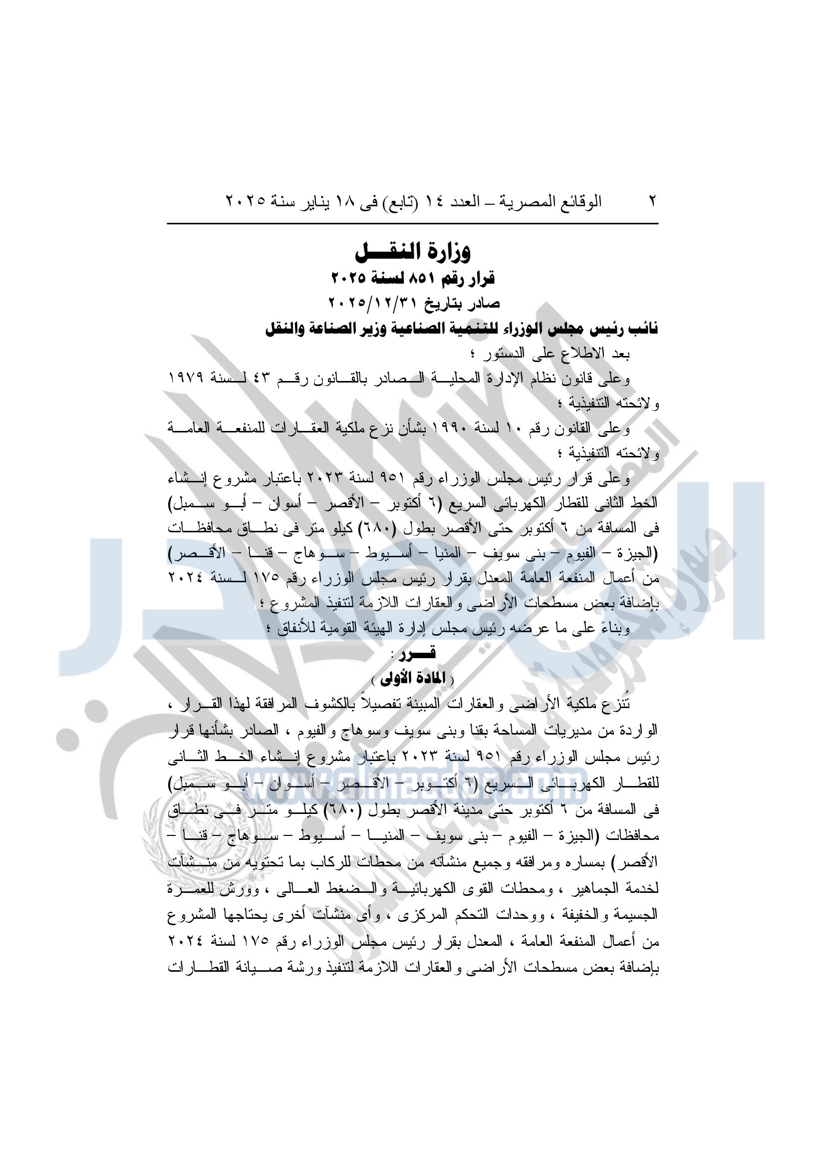نشرت الوقائع المصرية، في العدد 14 "تابع"، الصادر في 18 يناير سنة 2026، قرار وزارة النقل، قرار رقم 851 لسنة 2025، بتاريخ 31-12-2025، بشأن نزع ملكية أراضي وعقارات في 8 محافظات لتنفيذ الخط الثاني للقطار الكهربائي.