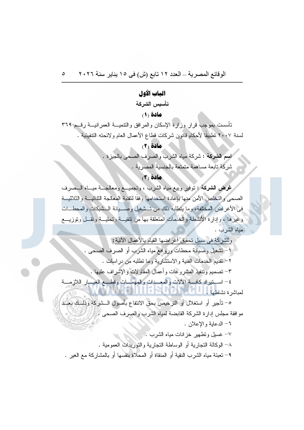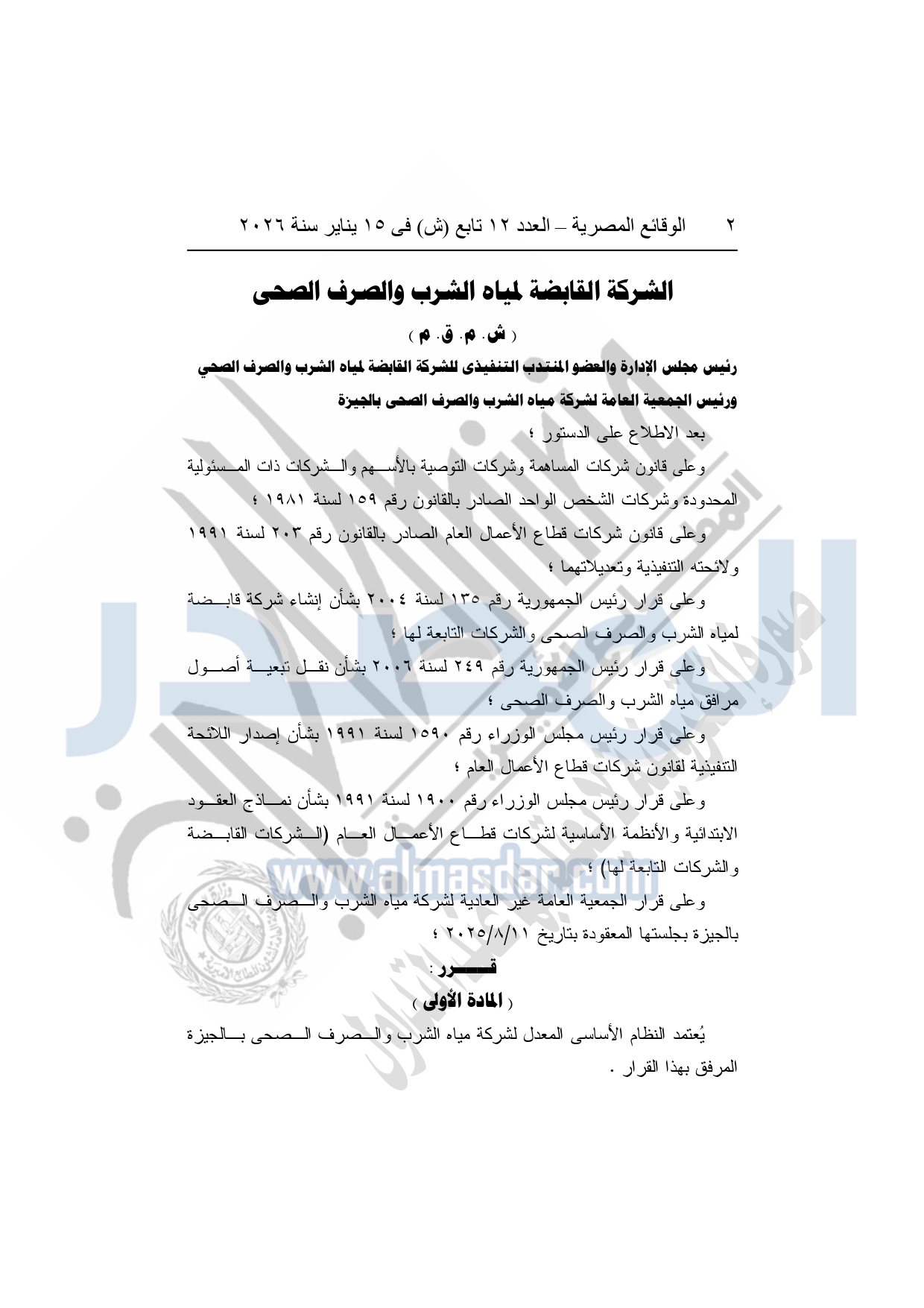 نشرت الوقائع المصرية، في العدد 12 تابع "ش"، الصادر في 15 يناير سنة 2026، قرار الشركة القابضة لمياه الشرب والصرف الصحى "ش.م.ق.م"، بشأن إعتماد النظام الأساسي المعدل لشركة مياه الشرب والصرف الصحي بمحافظة الجيزة.