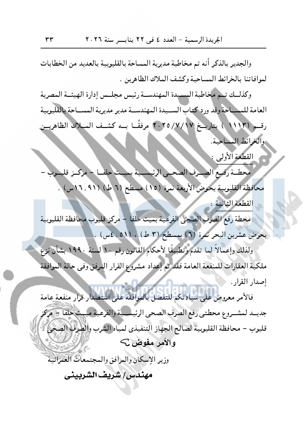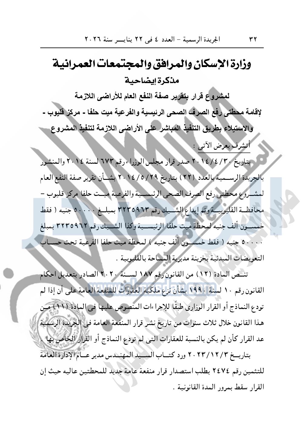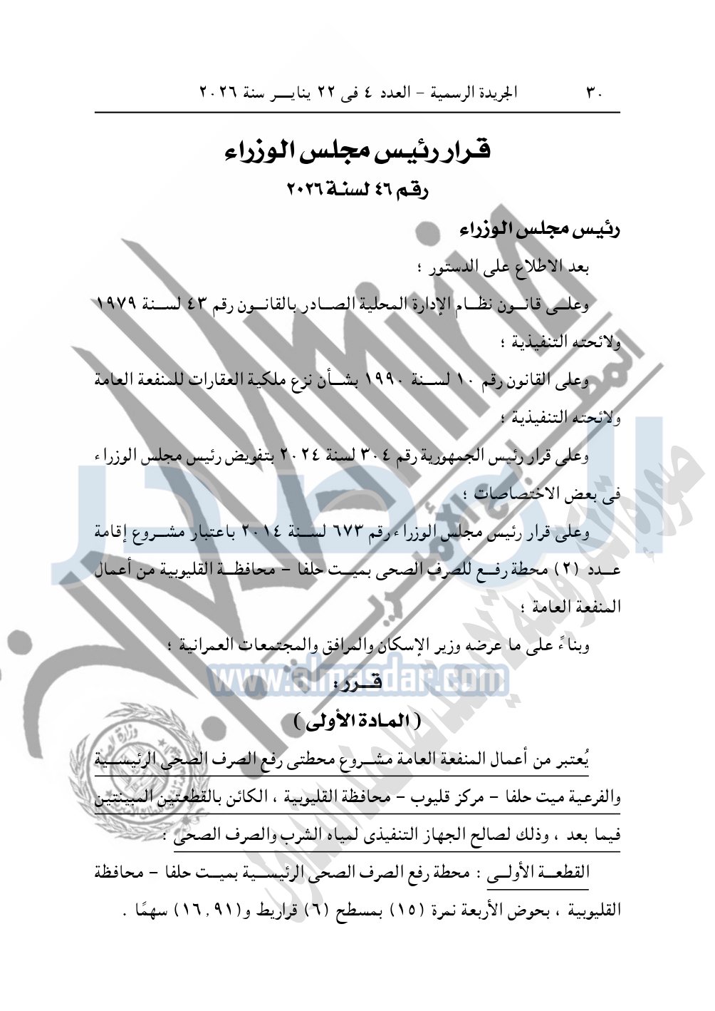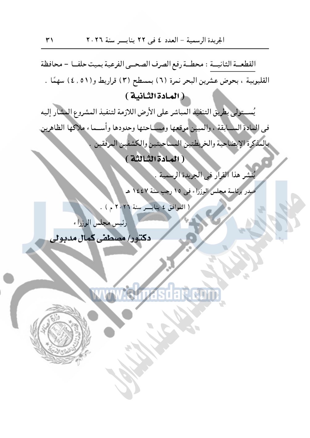 نشرت الجريدة الرسمية، في العدد 4، الصادر في 22 يناير سنة 2026، قرار رئيس مجلس الوزراء، رقم 46 لسنة 2026، بشأن نزع ملكية قطع أراضي لإقامة محطة رفع الصرف الصحى بمحافظة القليوبية.