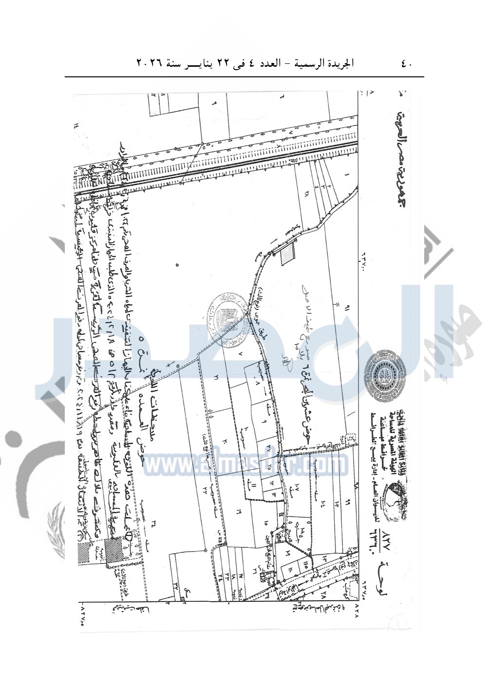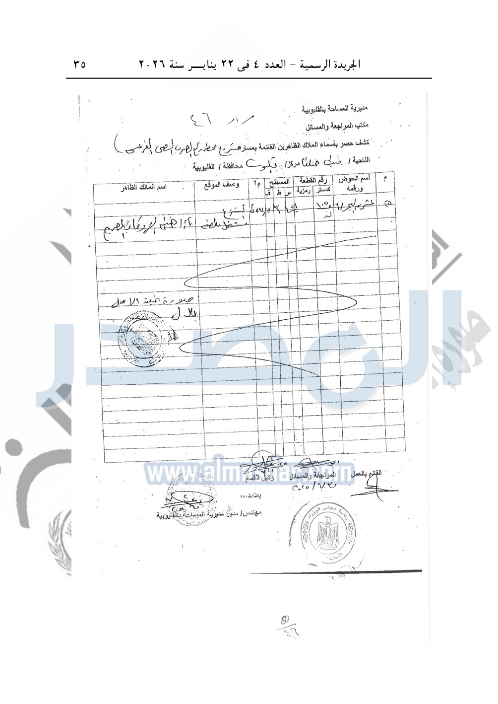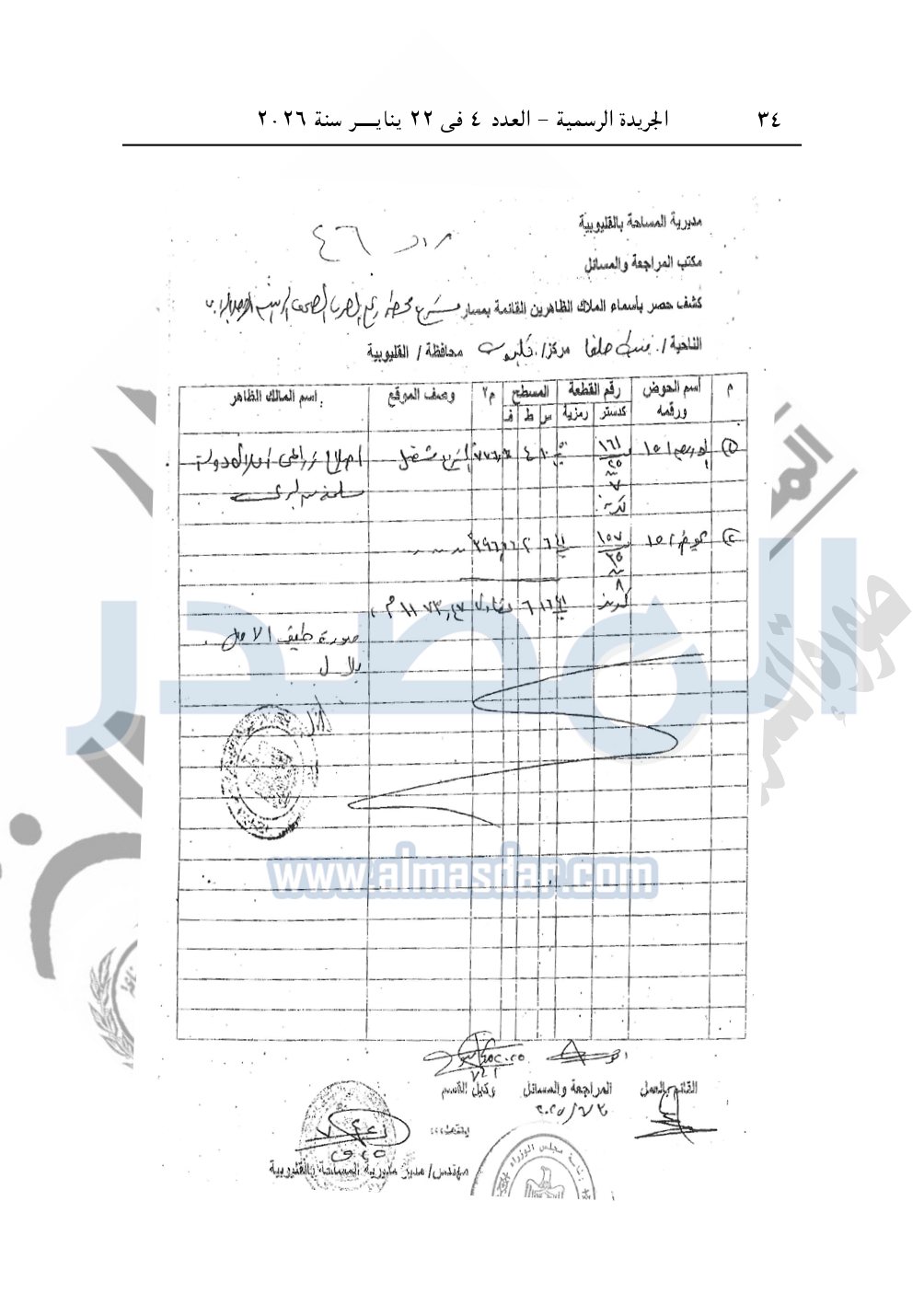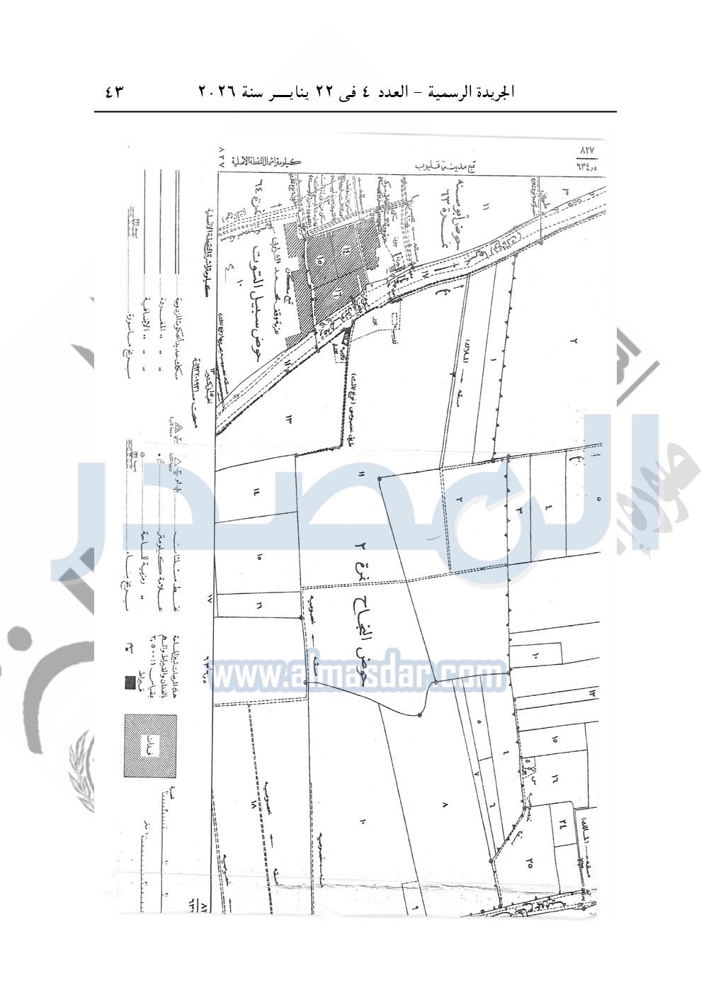 نشرت الجريدة الرسمية، في العدد 4، الصادر في 22 يناير سنة 2026، قرار رئيس مجلس الوزراء، رقم 46 لسنة 2026، بشأن نزع ملكية قطع أراضي لإقامة محطة رفع الصرف الصحى بمحافظة القليوبية.