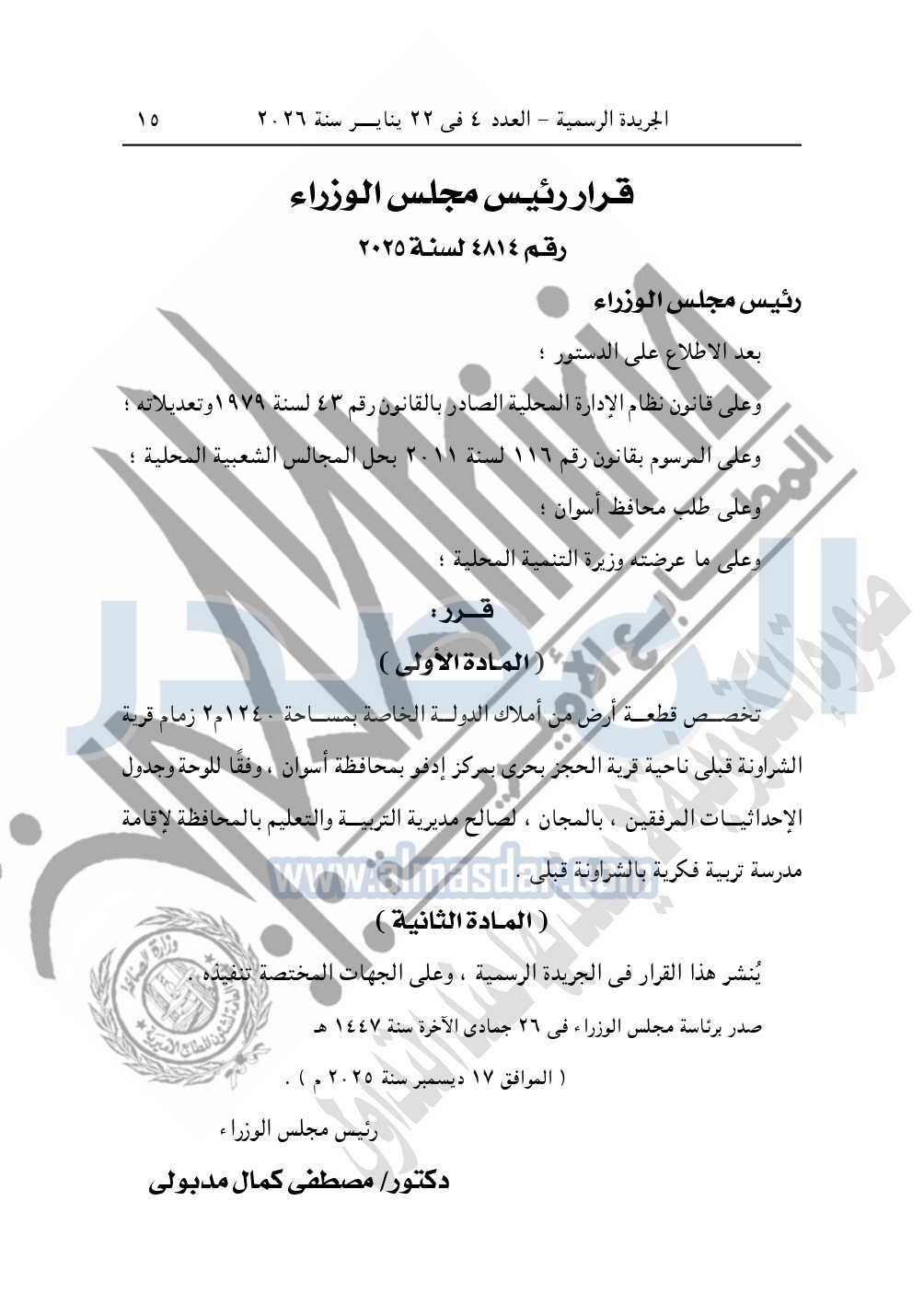 كما نشرت الجريدة الرسمية، في العدد 4، الصادر في 22 يناير 2026، قرار رئيس مجلس الوزراء، رقم 4814 لسنة 2025، بشأن تخصيص قطعة أرض لإقامة مدرسة تربية فكرية بالشراونة قبلى بمحافظة أسوان.