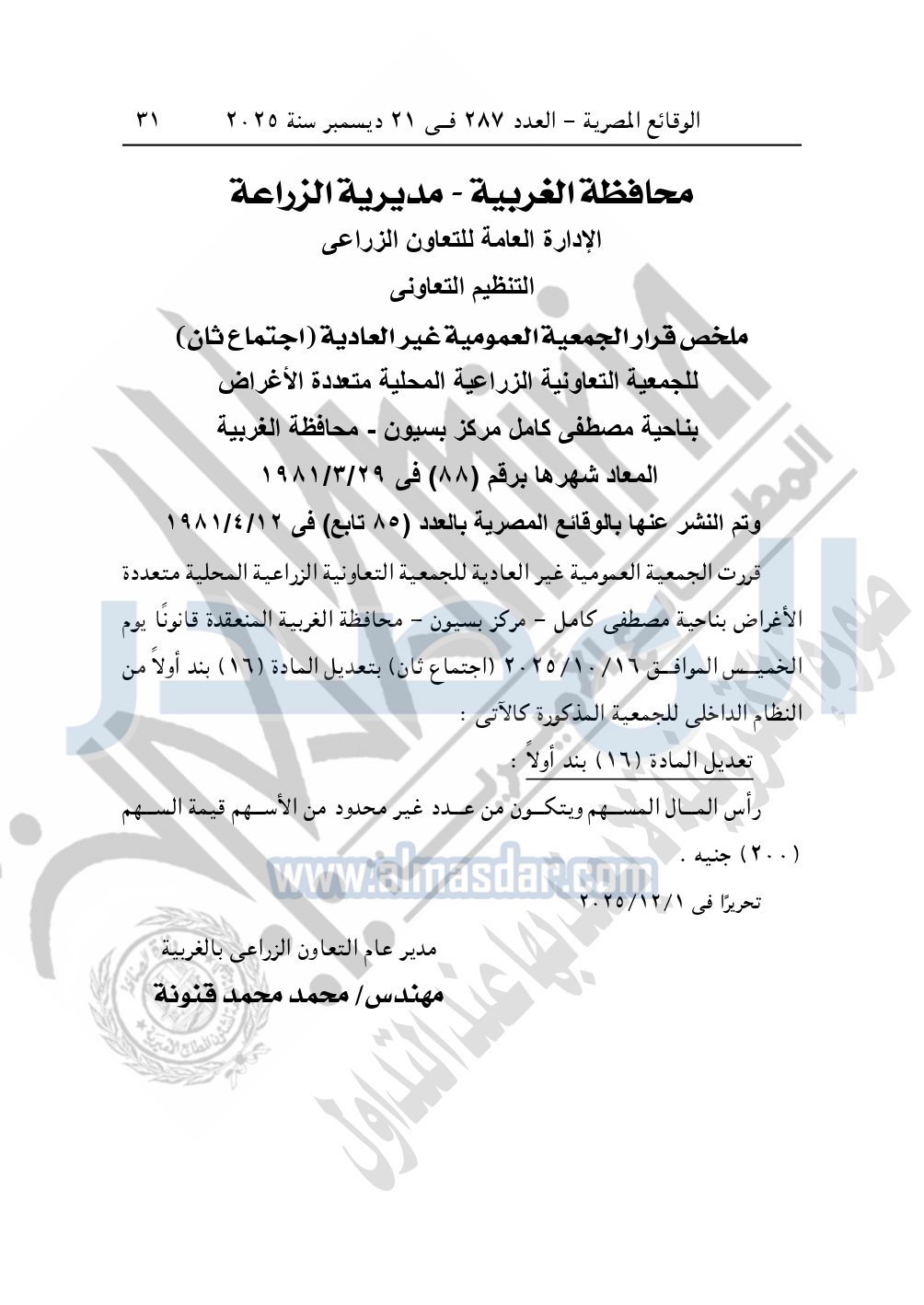 نشرت الوقائع المصرية في العدد 287 الصادر في 21 ديسمبر سنة 2025، محافظة الغربية – مديرية الزراعة، الإدارة العامة للتعاون الزراعي، التنظيم التعاوني، بشأن ملخص قرار الجمعية العمومية غير العادية "اجتماع ثان" للجمعية التعاونية الزراعية المحلية متعددة الأغراض بناحية مصطفى كامل مركز بسيون – محافظة الغربية، المعاد شهرها برقم "88" في 29-3-1981.