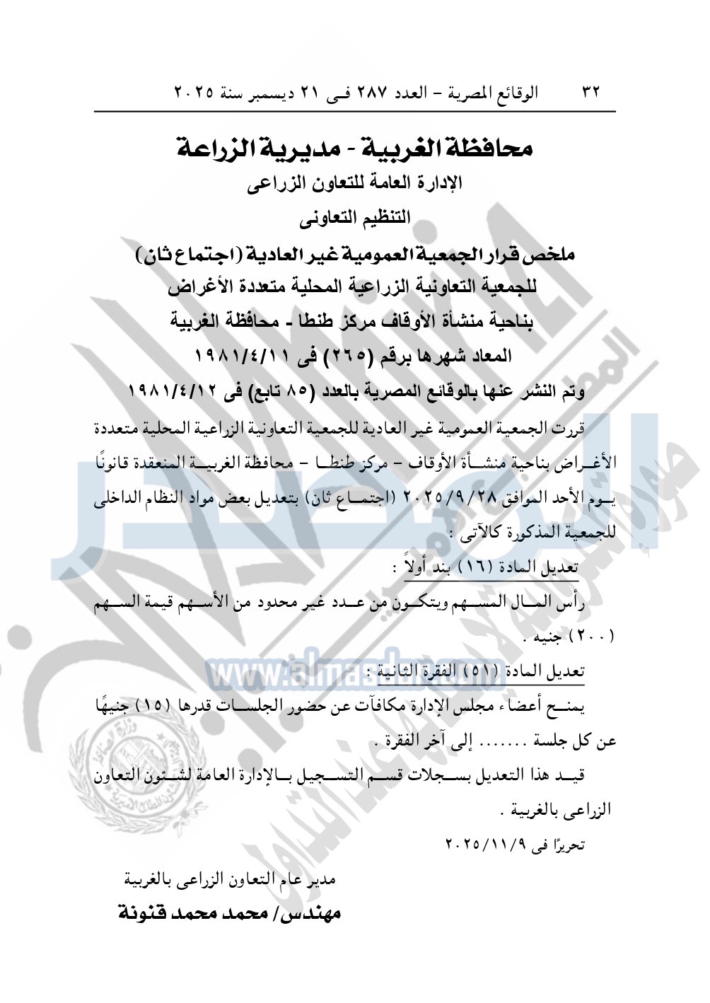 كما نشرت الوقائع المصرية في العدد 287 الصادر في 21 ديسمبر سنة 2025، محافظة الغربية – مديرية الزراعة، الإدارة العامة للتعاون الزراعي، التنظيم التعاوني، بشأن ملخص قرار الجمعية العمومية غير العادية "اجتماع ثان" للجمعية التعاونية الزراعية المحلية متعددة الأغراض بناحية منشأة الأوقاف مركز طنطا – محافظة الغربية، المعاد شهرها برقم 265 في 11-4-1981.