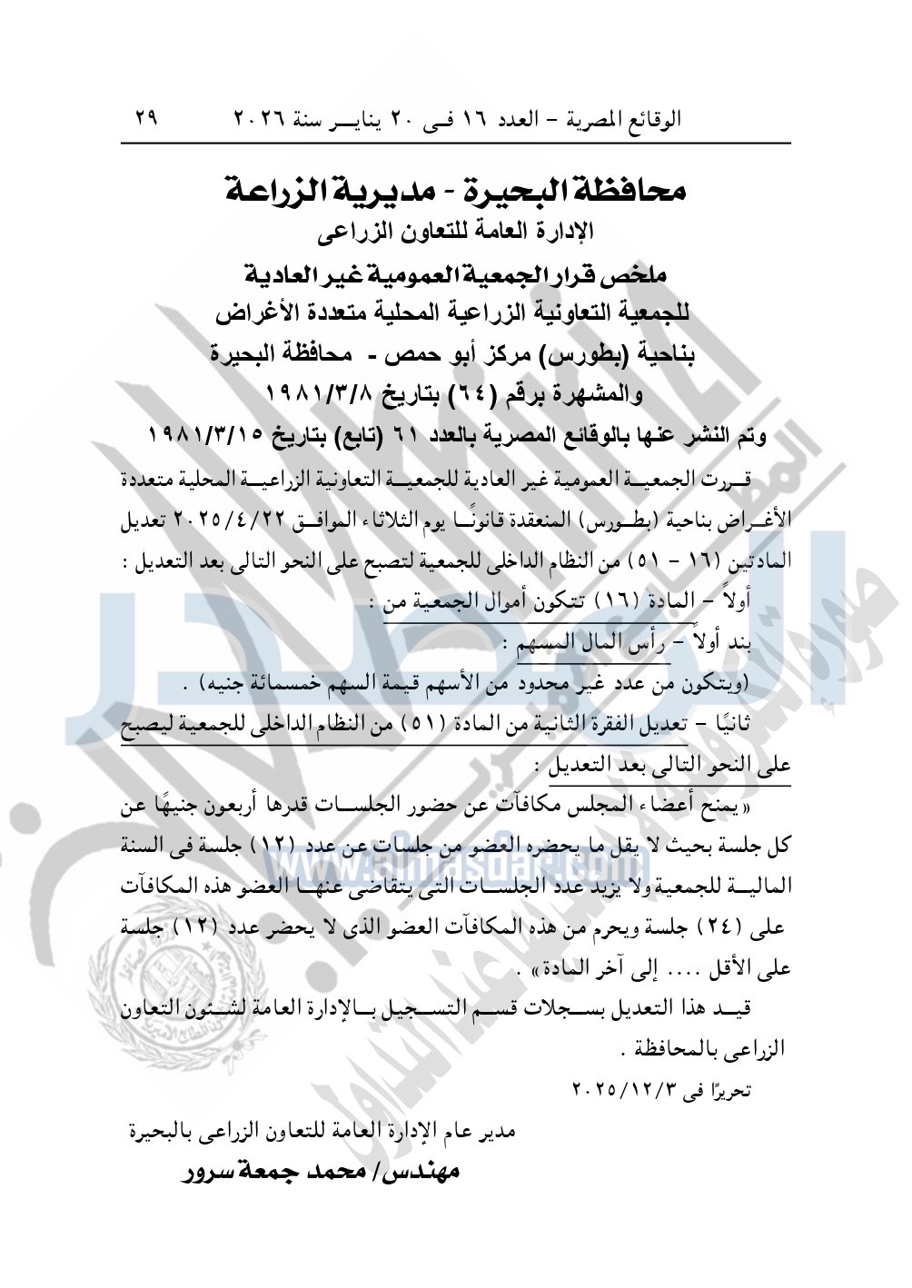 نشرت الوقائع المصرية في العدد 16 الصادر في 20 يناير سنة 2026، محافظة البحيرة – مديرية الزراعة، الإدارة العامة للتعاون الزراعي، ملخص قرار الجمعية العمومية غير العادية للجمعية التعاونية الزراعية المحلية متعددة الأغراض بناحية "بطورس" مركز أبو حمص – محافظة البحيرة والمشهرة برقم "64" بتاريخ 8-3-1981.